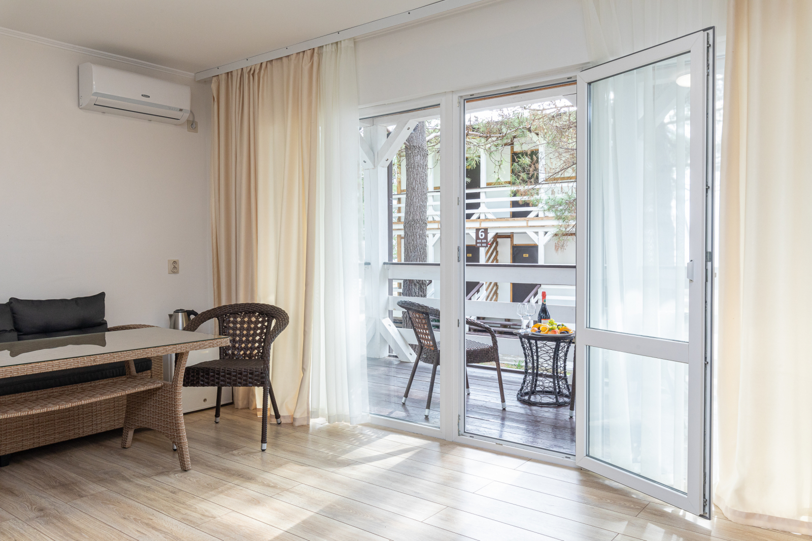 Площадь номера - 50 кв.м. 4 осн. места. 2 доп. места. Балкон. Мебель: вешалка, зеркало, кровать двуспальная (2), прикроватные тумбочки, стол, стулья, шкаф. Оборудование: кондиционер, телевизор, холодильник. Санузел: с душем, туалетные принадлежности, фен, халат. Сервис: Wi-Fi бесплатно, смена полотенец, смена постельного белья, уборка номера.