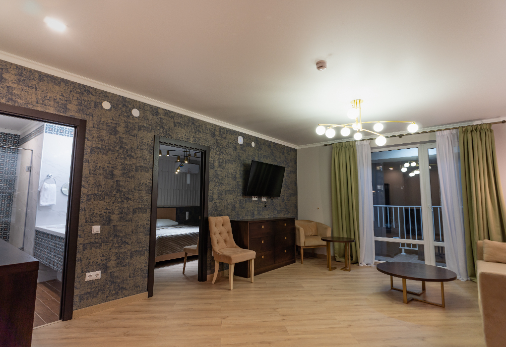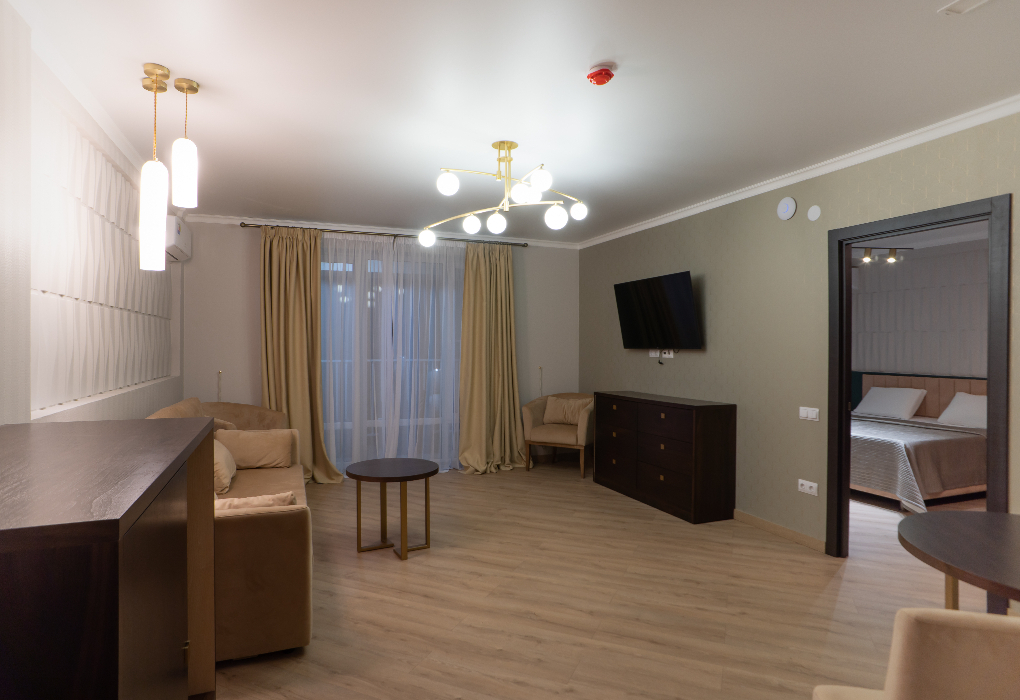 Двухкомнатный номер с комфортом разместит двоих гостей. Состоит из гостиной и спальной комнаты.
