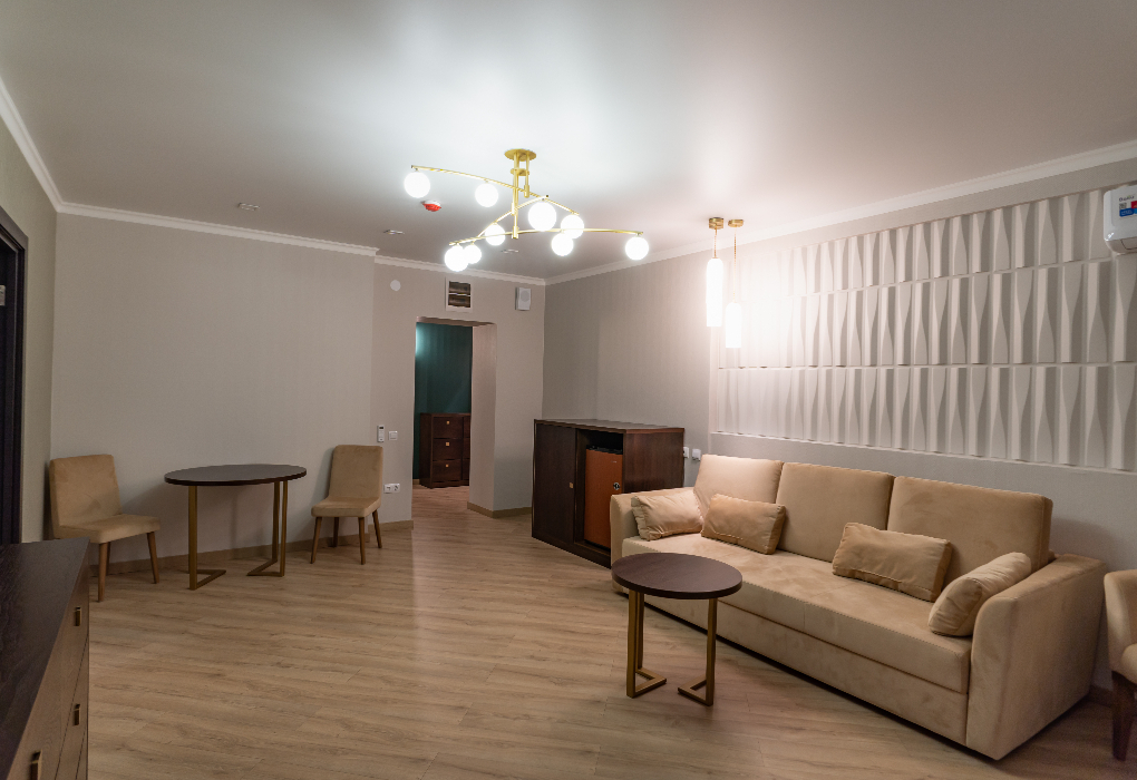 Удобная двуспальная кровать, мягкий диван, кресла, стол, телевизор, холодильник, чайник, кондиционер — все это есть в данном Полулюксе.