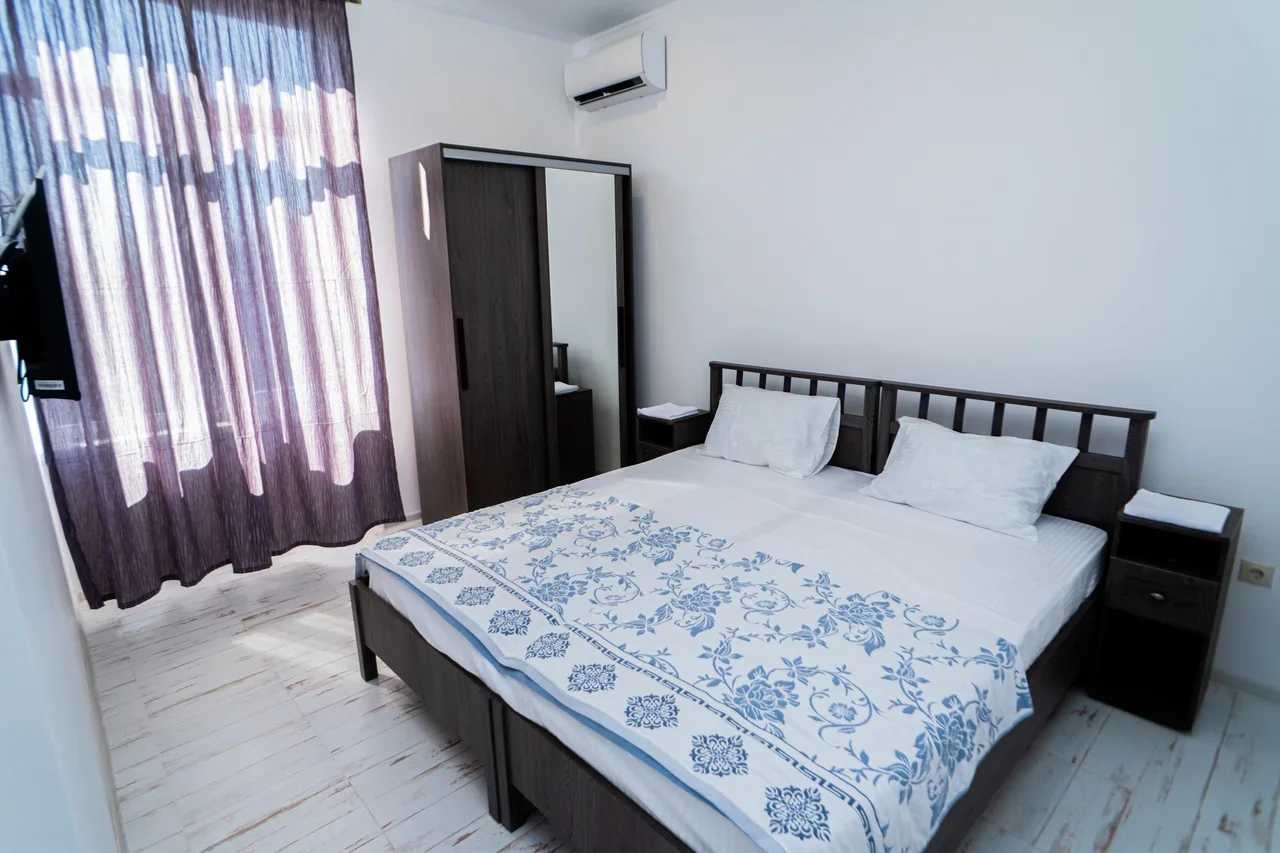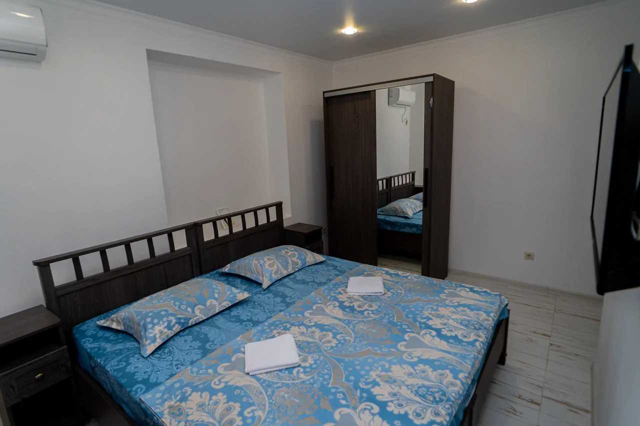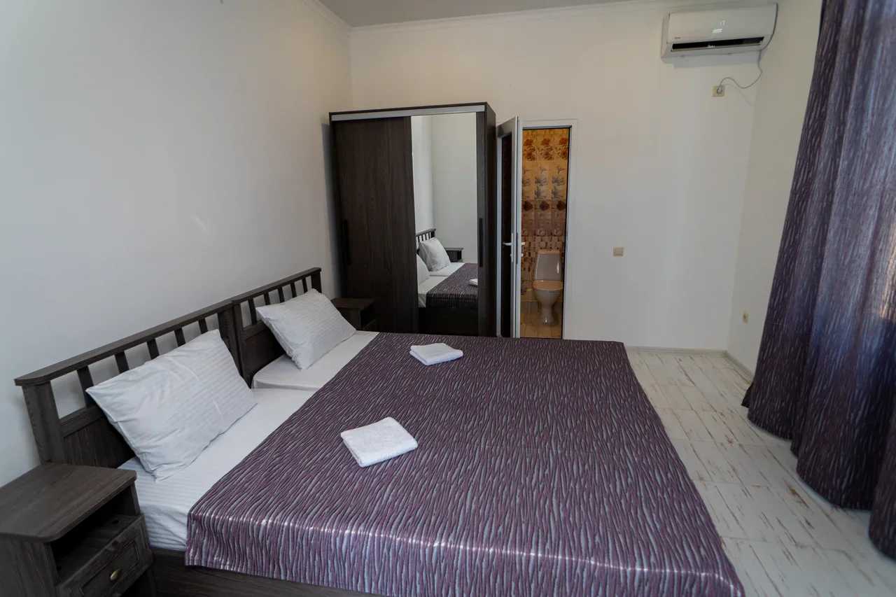2 осн. места. 1 доп. место. Мебель: вешалка, зеркало, кровать двуспальная, прикроватные тумбочки, стол, стулья, шкаф. Оборудование: кондиционер, телевизор. Санузел: с душем, туалетные принадлежности, фен. Сервис: Wi-Fi бесплатно, смена полотенец, смена постельного белья, уборка номера.