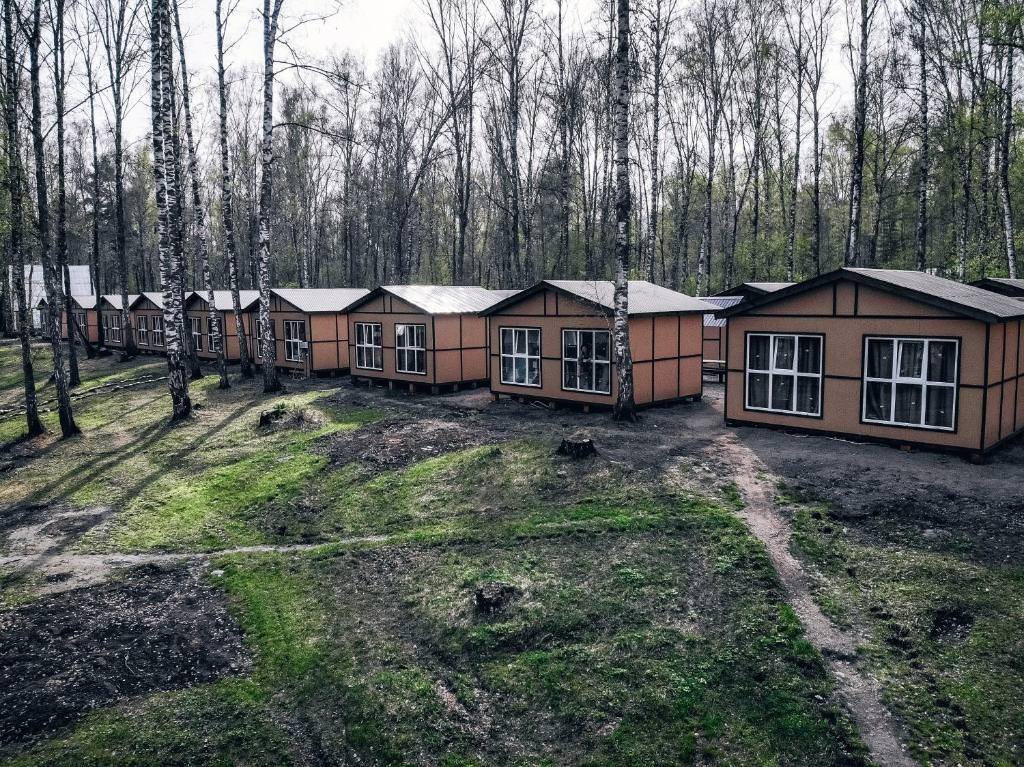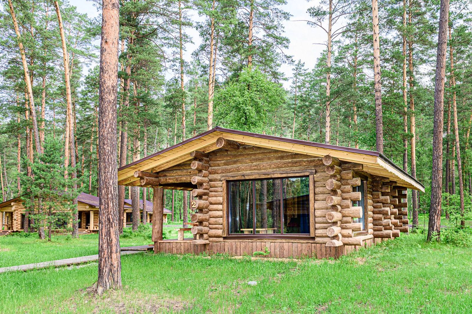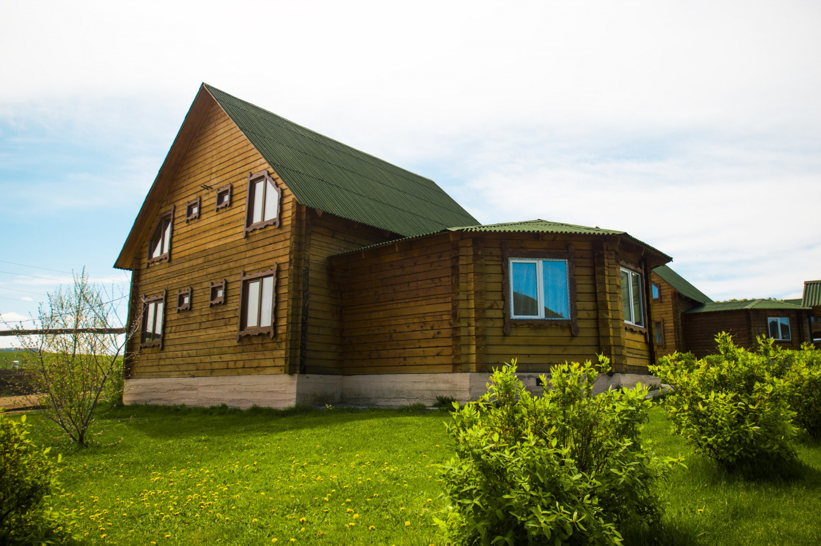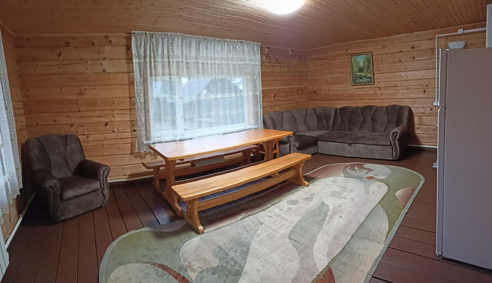 Часть коттеджа для проживания. На первом этаже коттеджа расположен зал-столовая, оснащенный большим обеденным столом, скамейками, телевизором, раскладным диваном, кухонным гарнитуром с раковиной и горячей водой, газовой плитой, холодильником и с полным комплектом посуды (тарелки, стаканы, ложки, вилки, ножи). Туалетная комната с душевой кабиной, раковиной, унитазом, горячей водой и полотенец для рук. На втором этаже расположены три спальни, с двухспальными и односпальными кроватями.