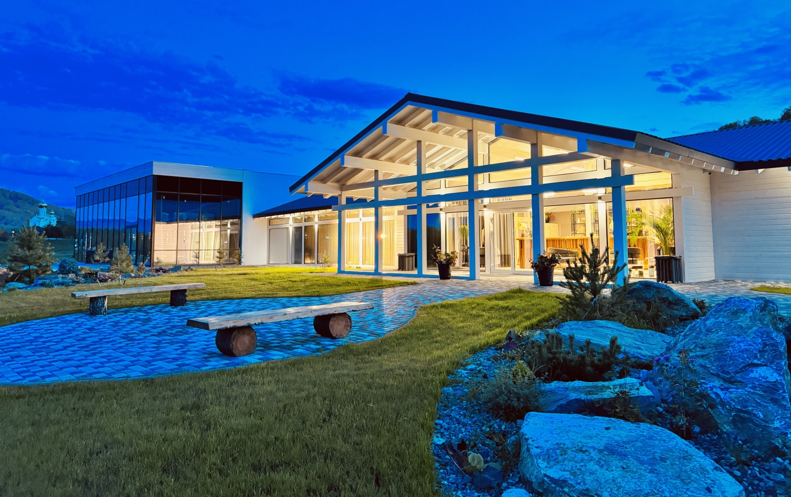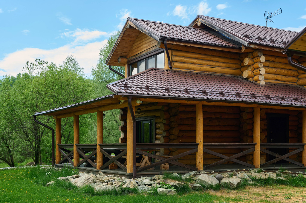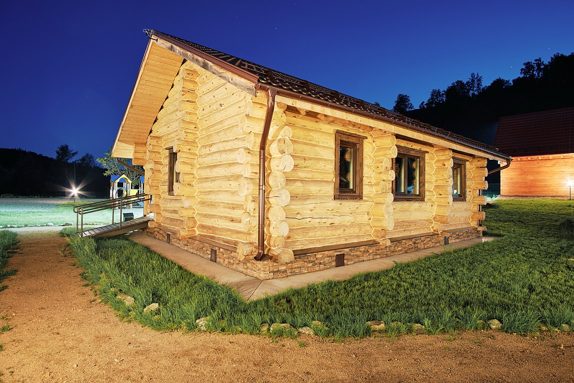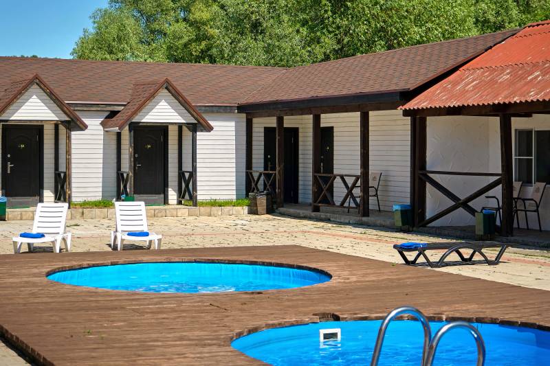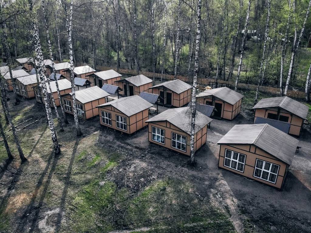 Часть коттеджа для проживания. На первом этаже коттеджа расположен зал-столовая, оснащенный большим обеденным столом, скамейками, телевизором, раскладным диваном, кухонным гарнитуром с раковиной и горячей водой, газовой плитой, холодильником и с полным комплектом посуды (тарелки, стаканы, ложки, вилки, ножи). Туалетная комната с душевой кабиной, раковиной, унитазом, горячей водой и полотенец для рук. На втором этаже расположены три спальни, с двухспальными и односпальными кроватями.