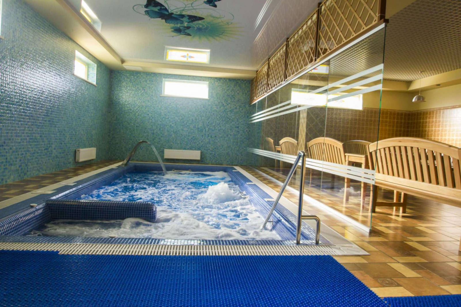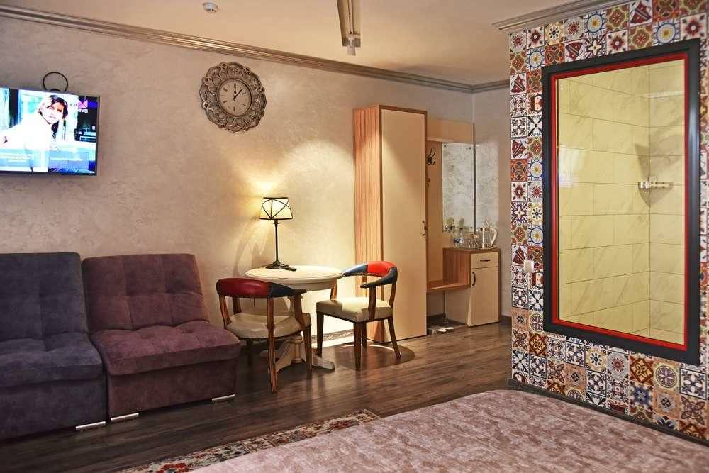 Индивидуальный и неповторимый номер для романтичных встреч. Уютная обстановка, красивая мебель, и конечно же прекрасная двуспальная кровать с видом на душ с панорамным стеклом.