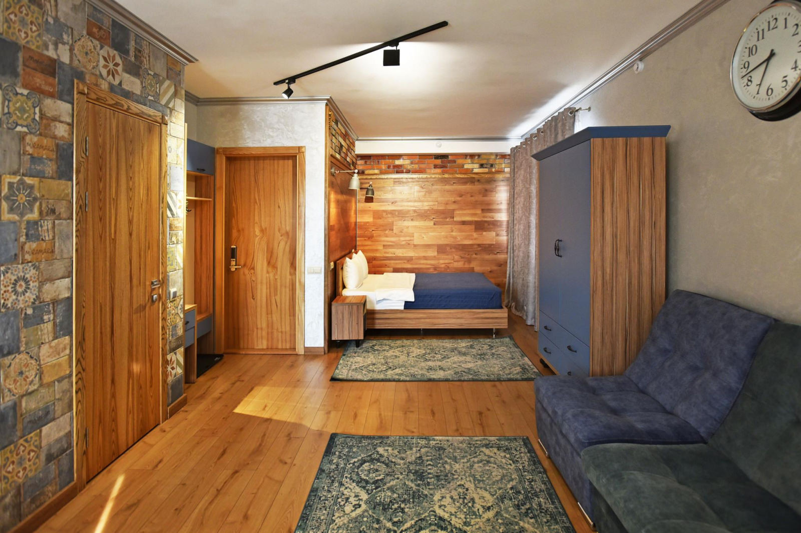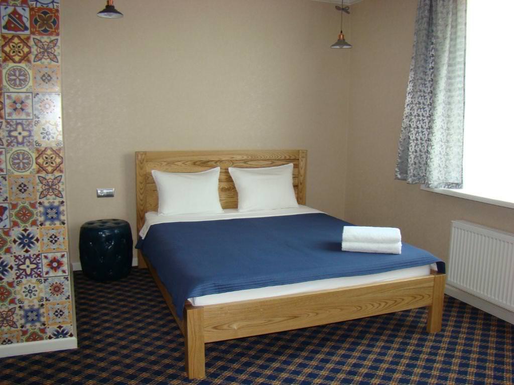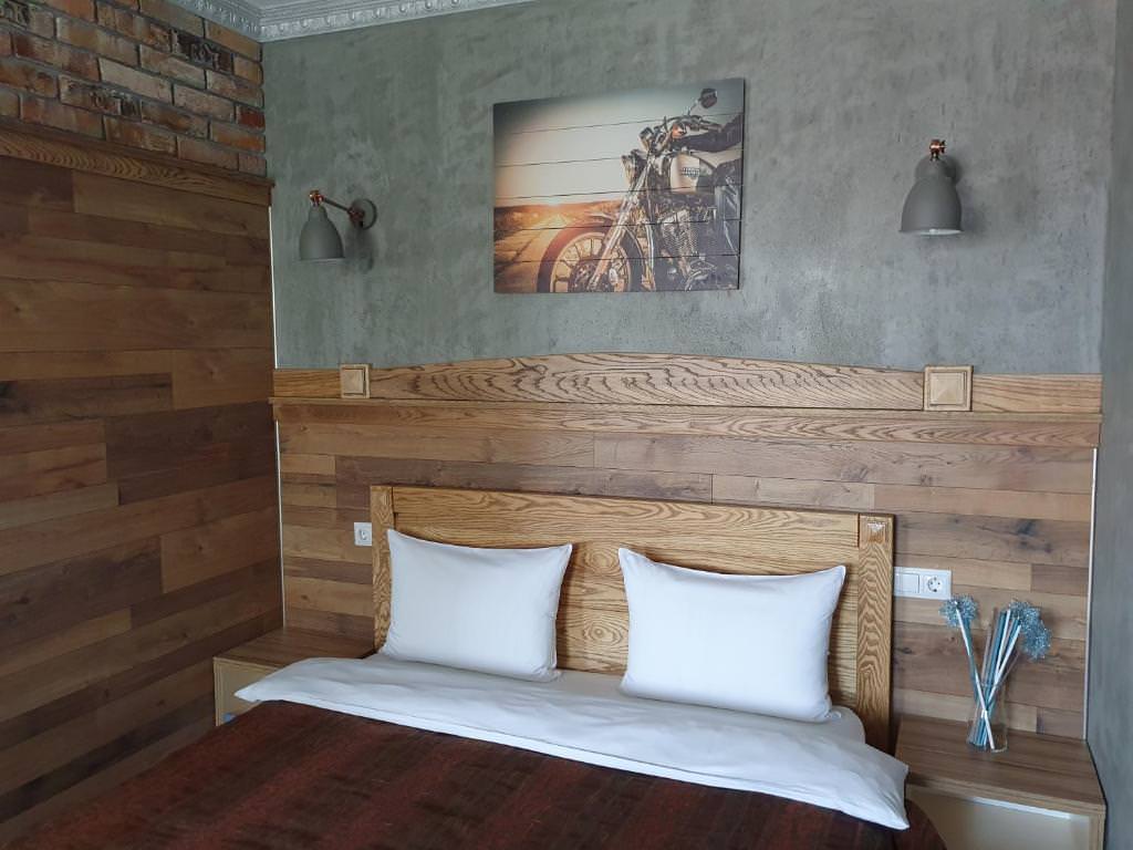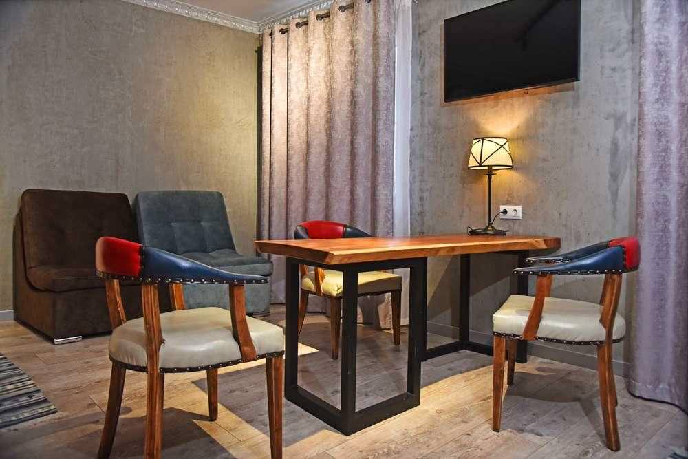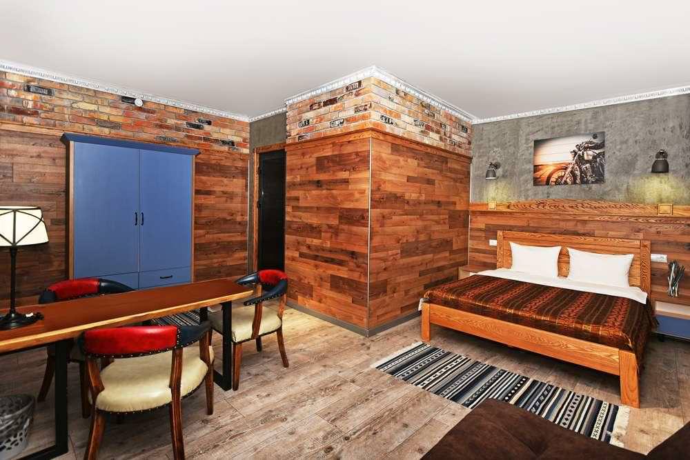 Номер с красивой дизайнерской отделкой из ценных пород дерева, со своей неповторимостью и уютом. Двуспальная кровать из экологичного материала, место для досуга с креслами и столом, кухонная зона. Душ с полным комплектом туалетных принадлежностей, высококачественная сантехника.