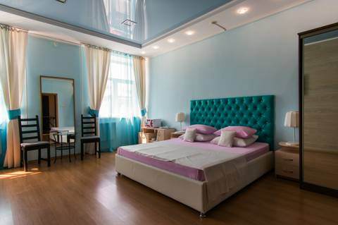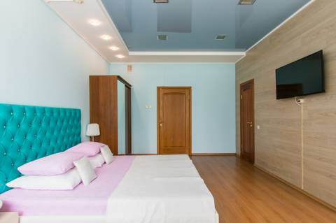 Роскошный номер повышенной комфортности. Шикарная мебель в сочетании с изысканным интерьером. Элегантно оформлена спальная комната с большими двуспальной и двухъярусной кроватями В номере: Одна широкая двухспальная кровать (180,*2,00М2) Двухъярусная кровать (160*200м2) Прикроватные тумбочки Холодильник Шкаф для одежды Обеденный стол Гардеробная ЖК телевизор диагональю 127 см Настольные лампы Бесплатный интернет WiFi Светонепроницаемые шторы Кондиционер В ванной комнате: Душ Туалетные средства Банные полотенца Раковина Унитаз Гостиничная парфюмерия Тапочки Халаты Фен Дополнительно: Мини бар Кулер на этаже Разовые тапочки Посуда Чайник Чайный набор Гостиная зона Микроволновая печь Столовые приборы Предметы гостеприимства Парковка под видео наблюдением