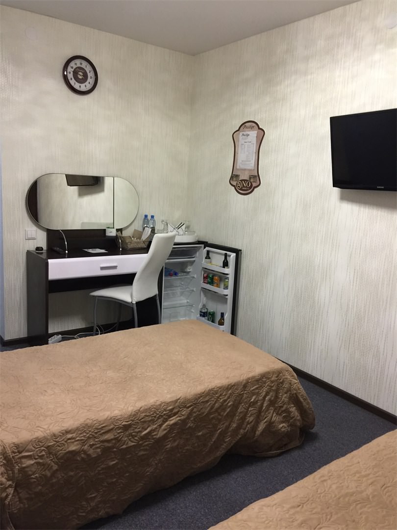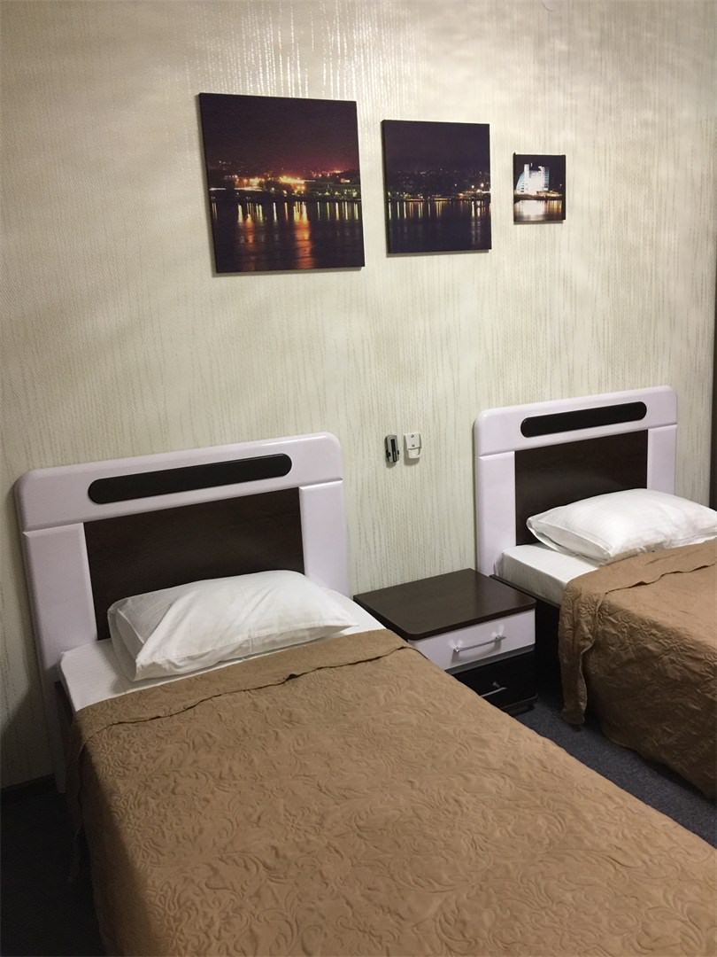 Двухместный "стандарт" номер состоит из одной комнаты. Это небольшой и уютный номер. В нем есть все необходимое: две кровати, рабочий стол, телевизор SMART, холодильник, гардероб, санузел и душевая кабина, а так же выход в Internet по технологии Wi-Fi (бесплатно).