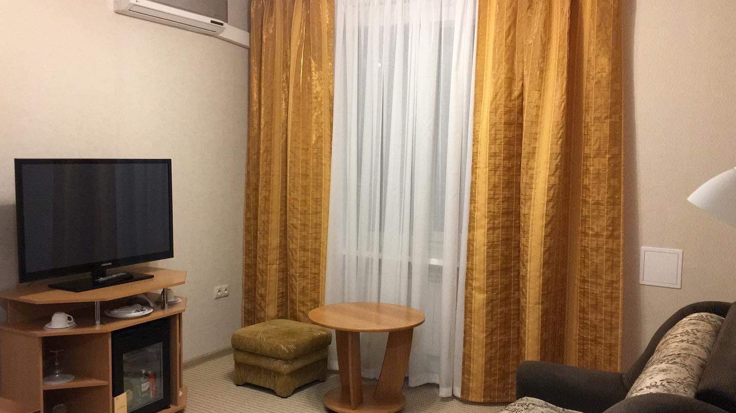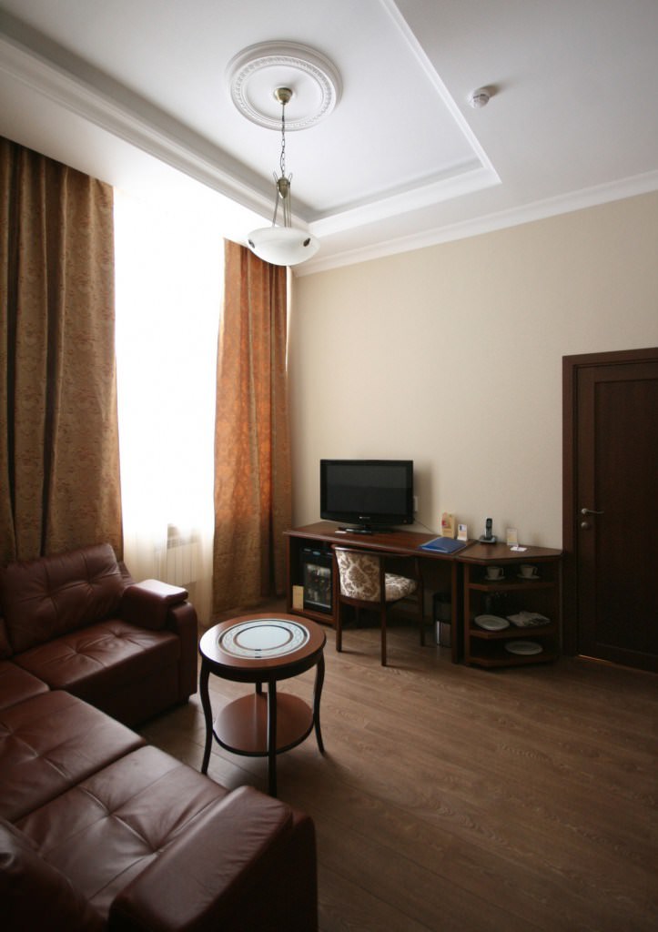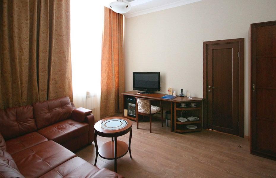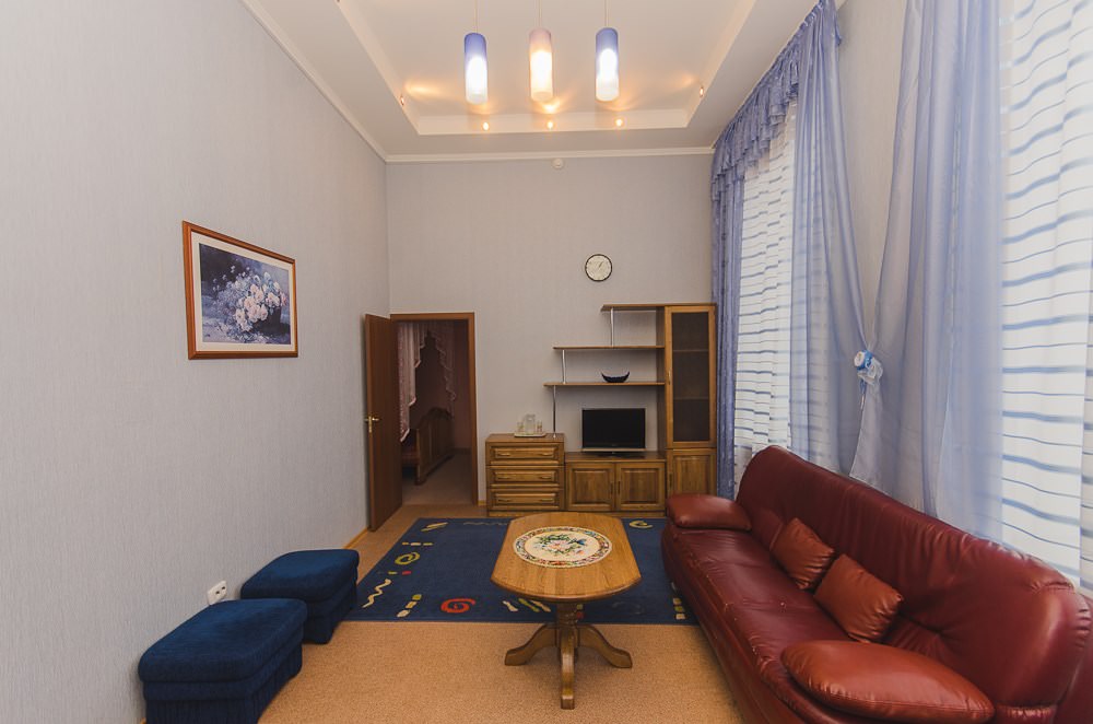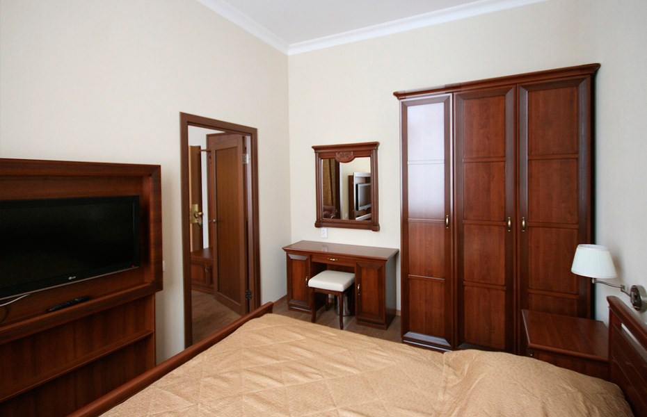 Двухкомнатный номер — гостиная и спальня, оформленный в классическом стиле. Комфорт обеспечивают кондиционеры в каждой комнате, мягкая мебель, два телевизора, спокойные тона интерьера, широкая кровать.