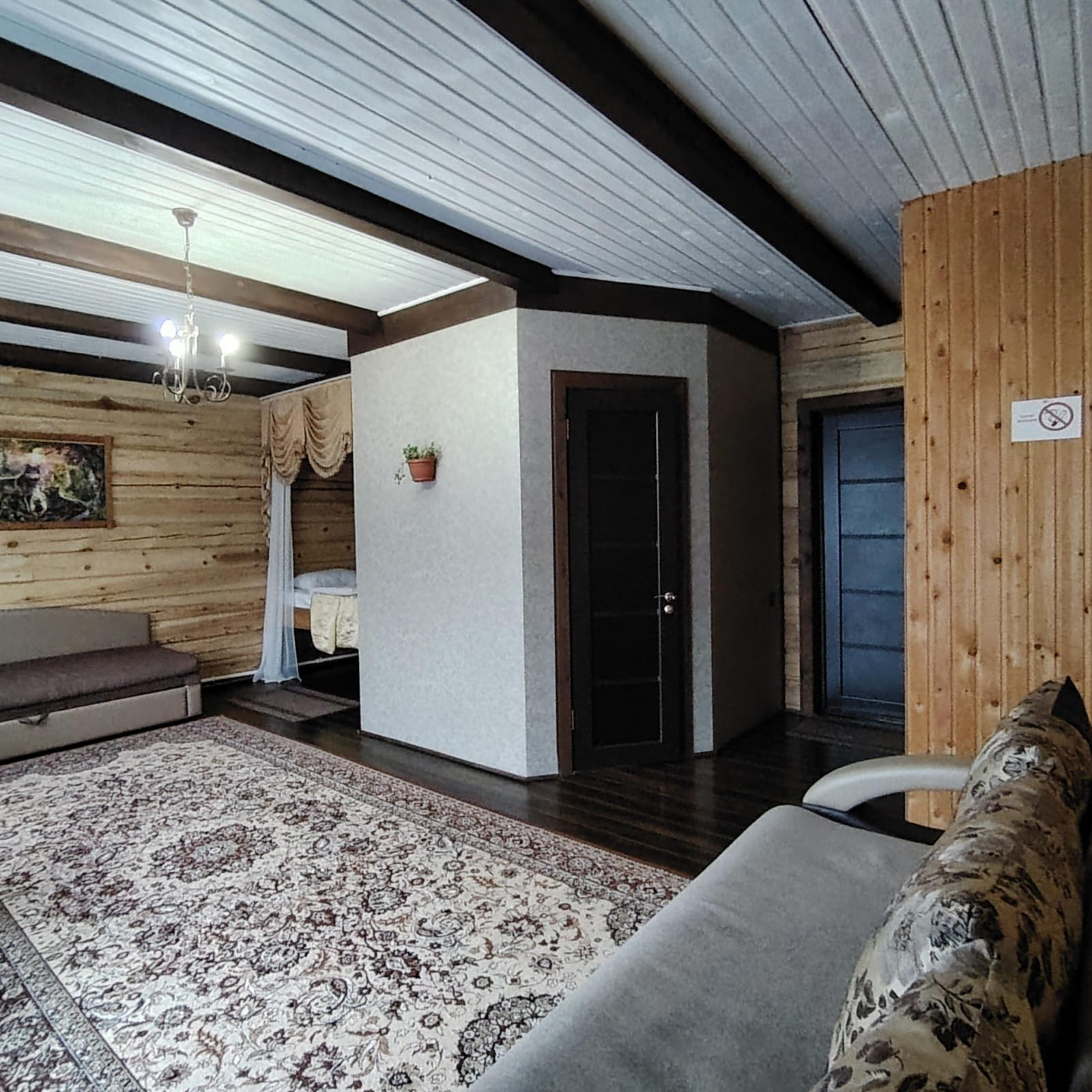 Комфорт - уютный, благоустроенный, с витражными окнами с выходом на лоджии, с санузлом и душевой кабиной, фен, двуспальная кровать, два больших дивана, телевизор, чайник, стол, журнальный столик, открытый шкаф, комплект полотенец (2 шт.), бесплатный wi-fi, имеется общий зал с кухонной зоной оборудованной всем необходимым для самостоятельного приготовления пищи.
