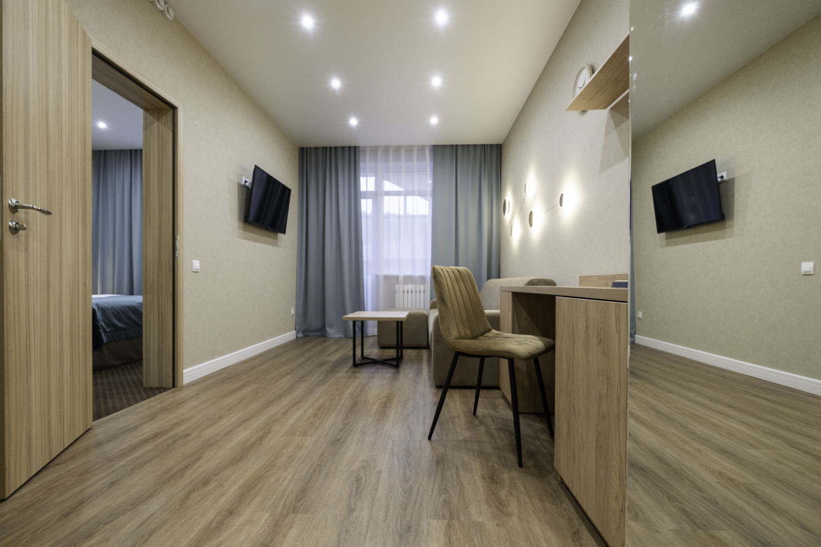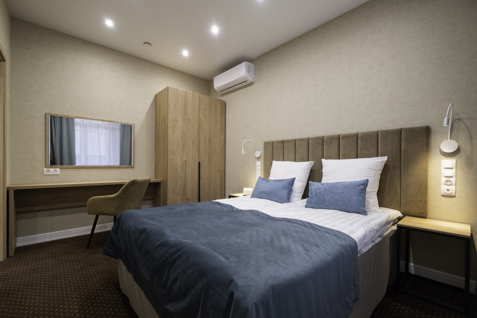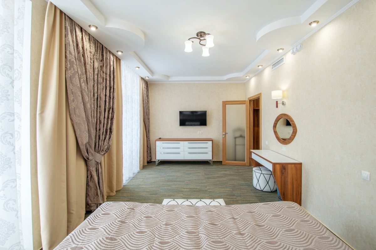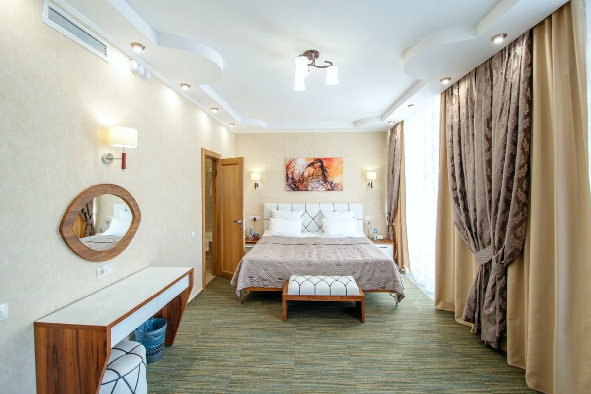 Площадь номера - 37 кв.м. 2 осн. места. 1 доп. место. Балкон. Мебель: вешалка, зеркало, кровать двуспальная, прикроватные тумбочки, столик журнальный, столик туалетный, шкаф. Оборудование: гладильная доска, кондиционер, набор посуды, сейф, телевизор ЖК, телефон, утюг, холодильник, чайный набор посуды, электрочайник. Санузел: с ванной, туалетные принадлежности, фен. Сервис: Wi-Fi бесплатно, смена полотенец, смена постельного белья, уборка номера.