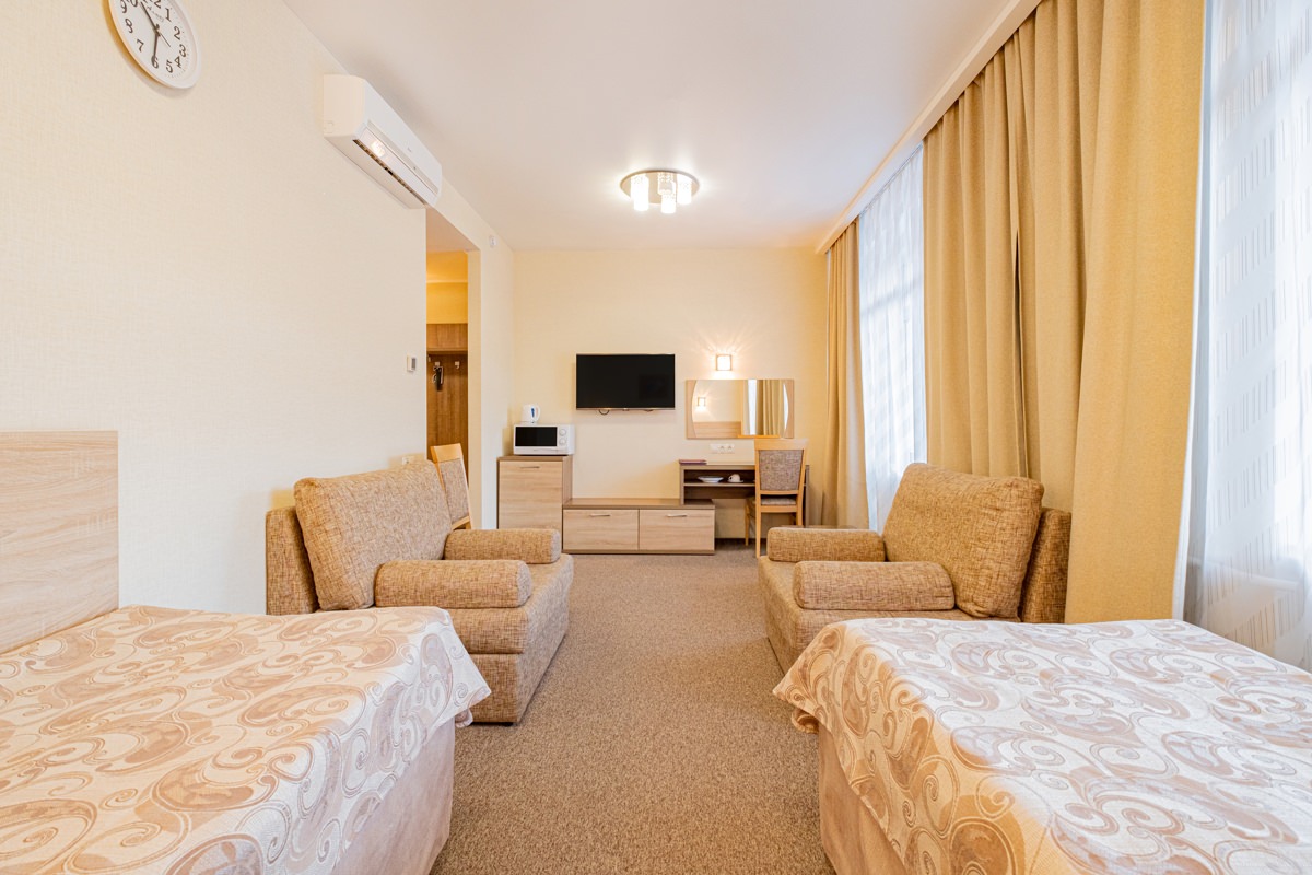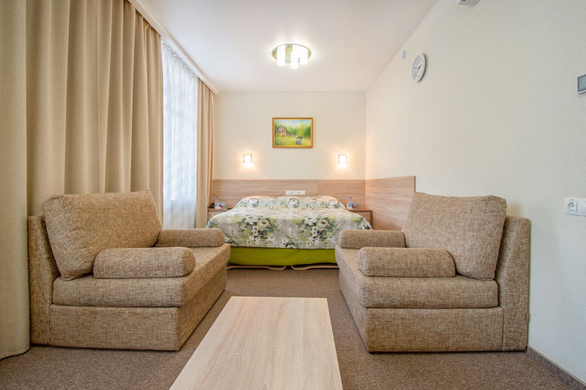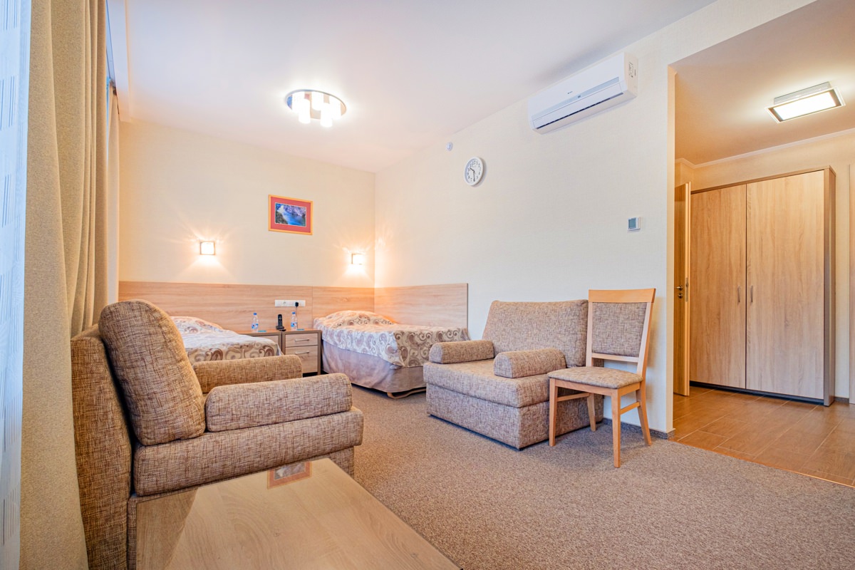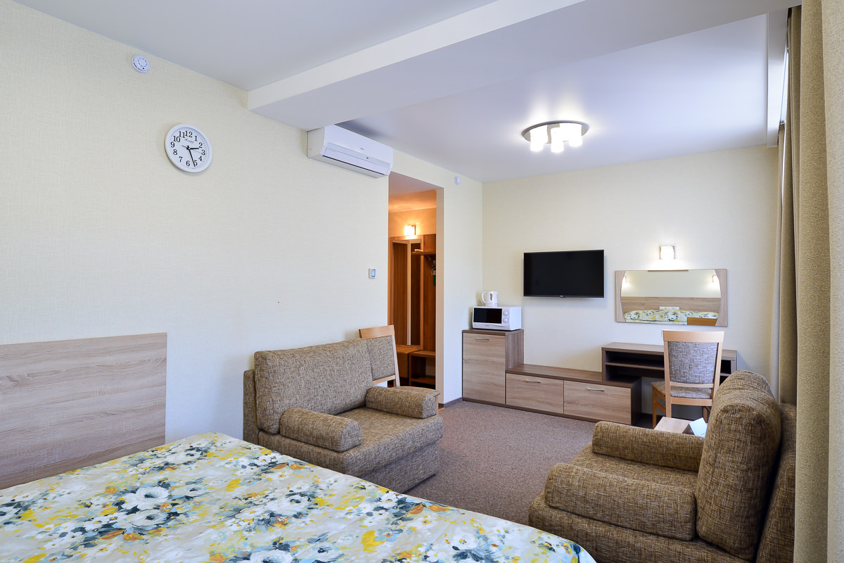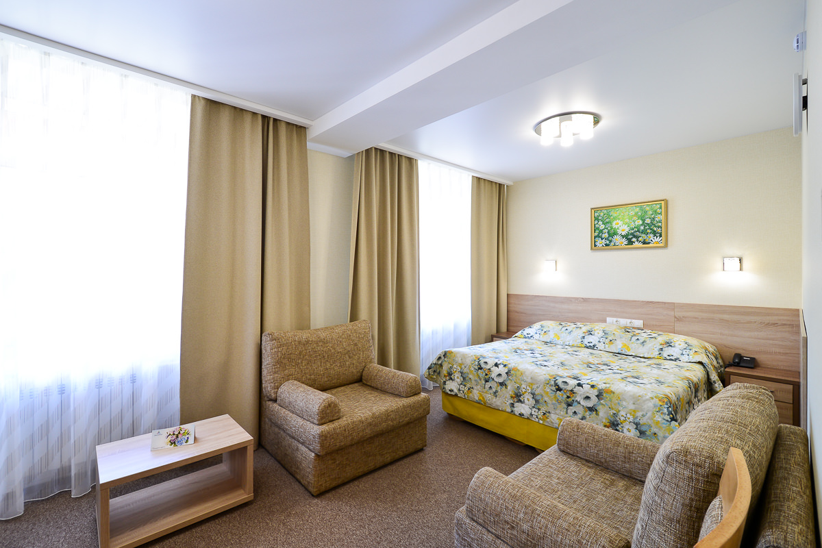 Площадь номера - 25 кв.м. 2 осн. места. 2 доп. места. Мебель: диван раскладной, кровать двуспальная, прикроватные тумбочки, стол, столик журнальный, стул, шкаф. Оборудование: кондиционер, телевизор, телефон, холодильник, чайный набор посуды, электрочайник. Санузел: биде, с душем, тапочки, туалетные принадлежности, фен, халат. Сервис: Wi-Fi бесплатно, смена полотенец, смена постельного белья, уборка номера.