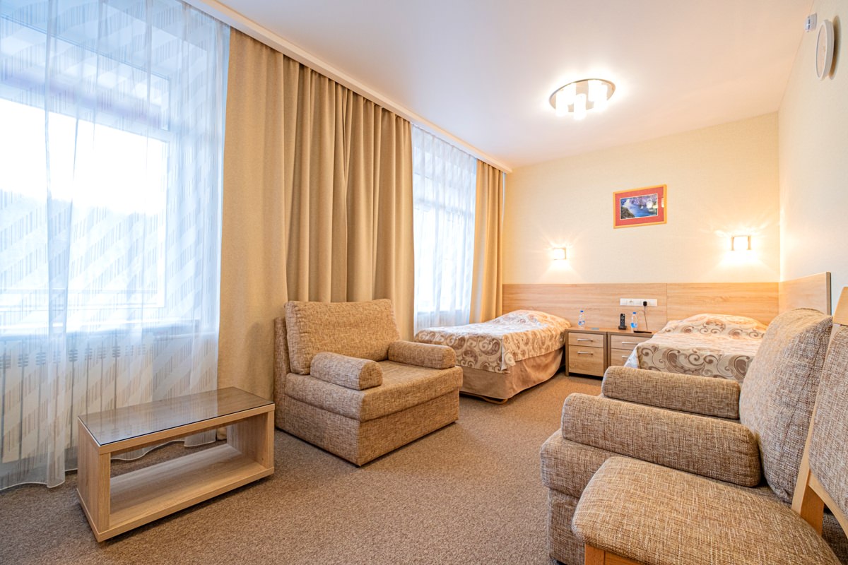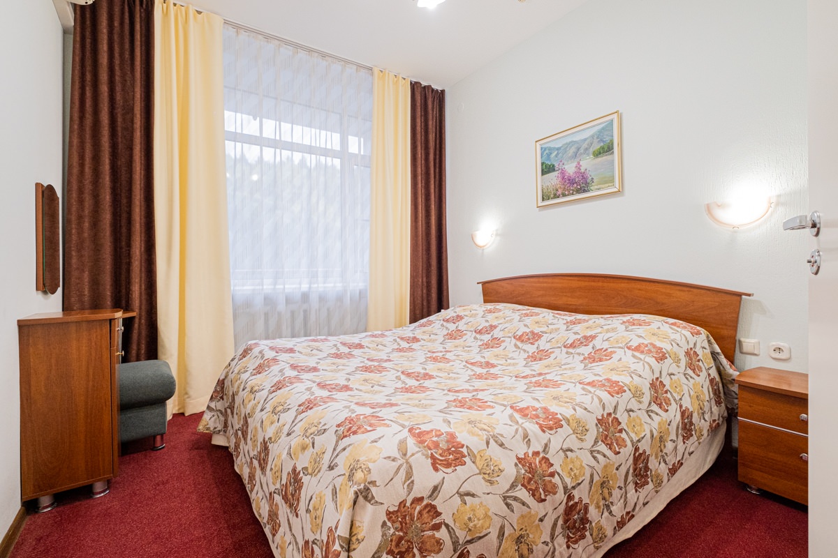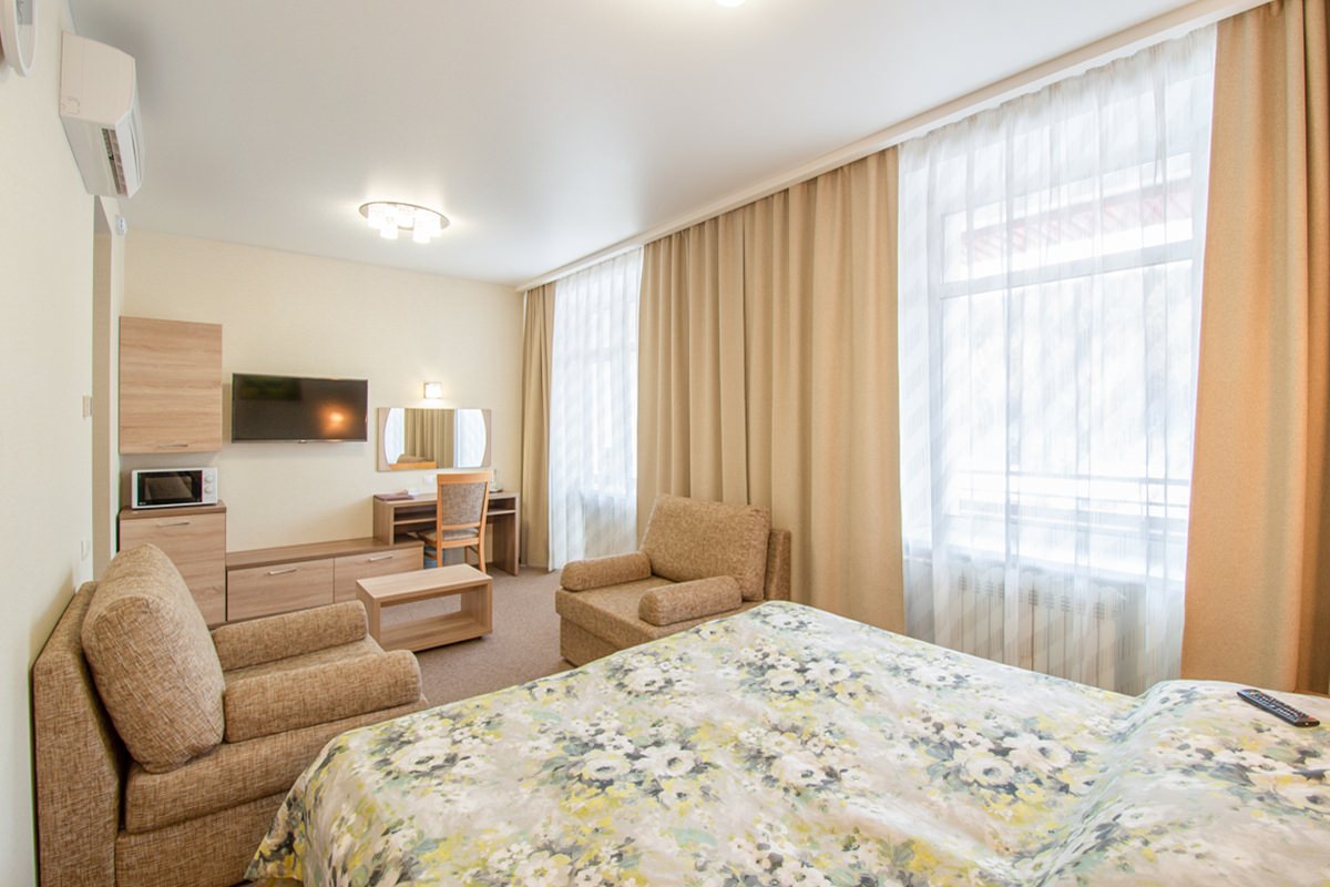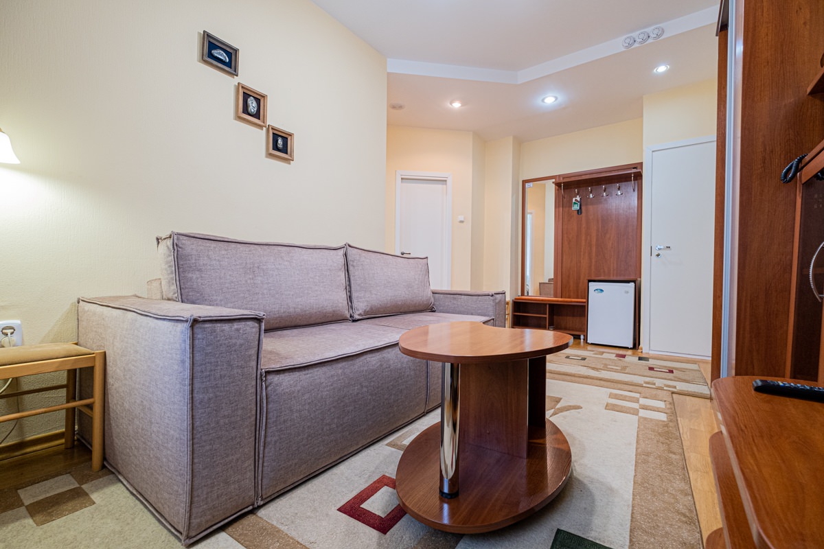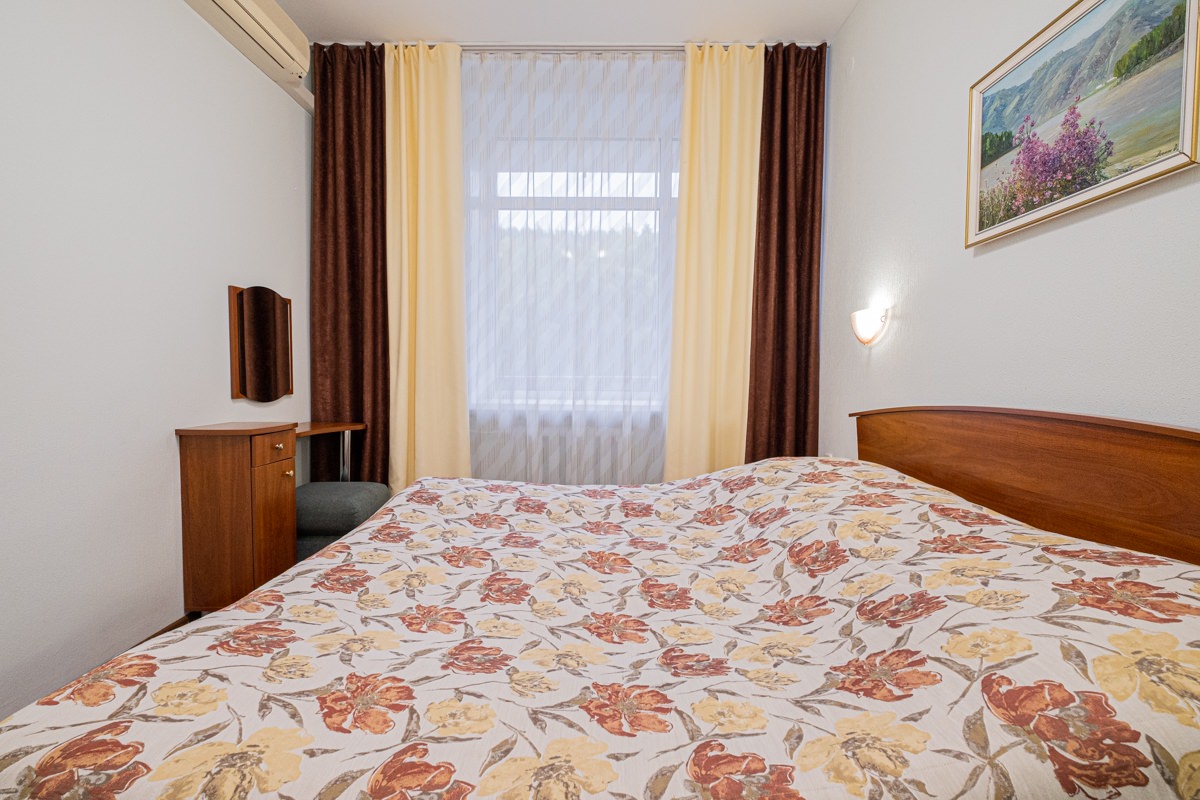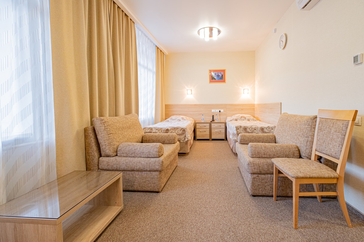 Площадь номера - 25 кв.м. 2 осн. места. 2 доп. места. Мебель: диван раскладной, кровать двуспальная, прикроватные тумбочки, стол, столик журнальный, стул, шкаф. Оборудование: кондиционер, телевизор, телефон, холодильник, чайный набор посуды, электрочайник. Санузел: биде, с душем, тапочки, туалетные принадлежности, фен, халат. Сервис: Wi-Fi бесплатно, смена полотенец, смена постельного белья, уборка номера.
