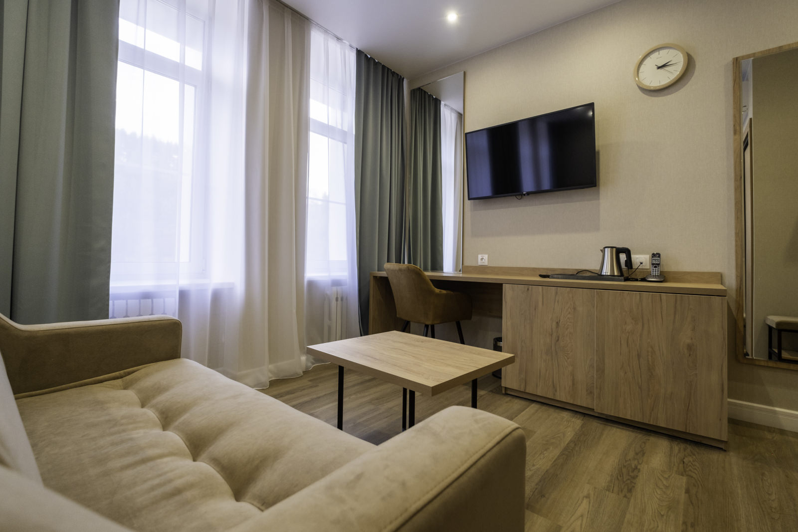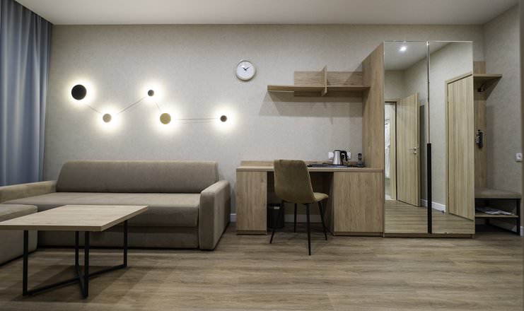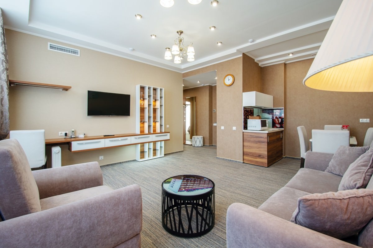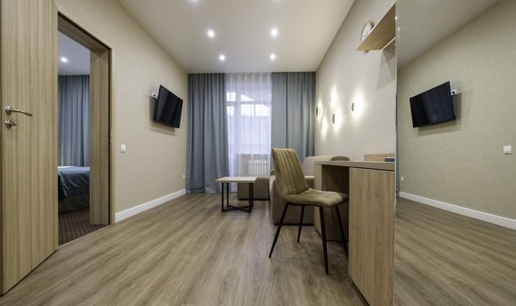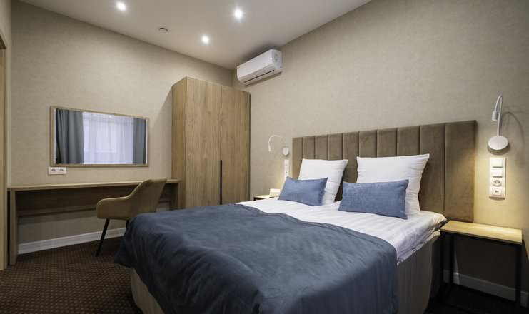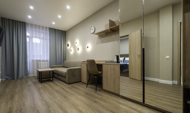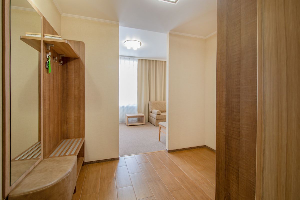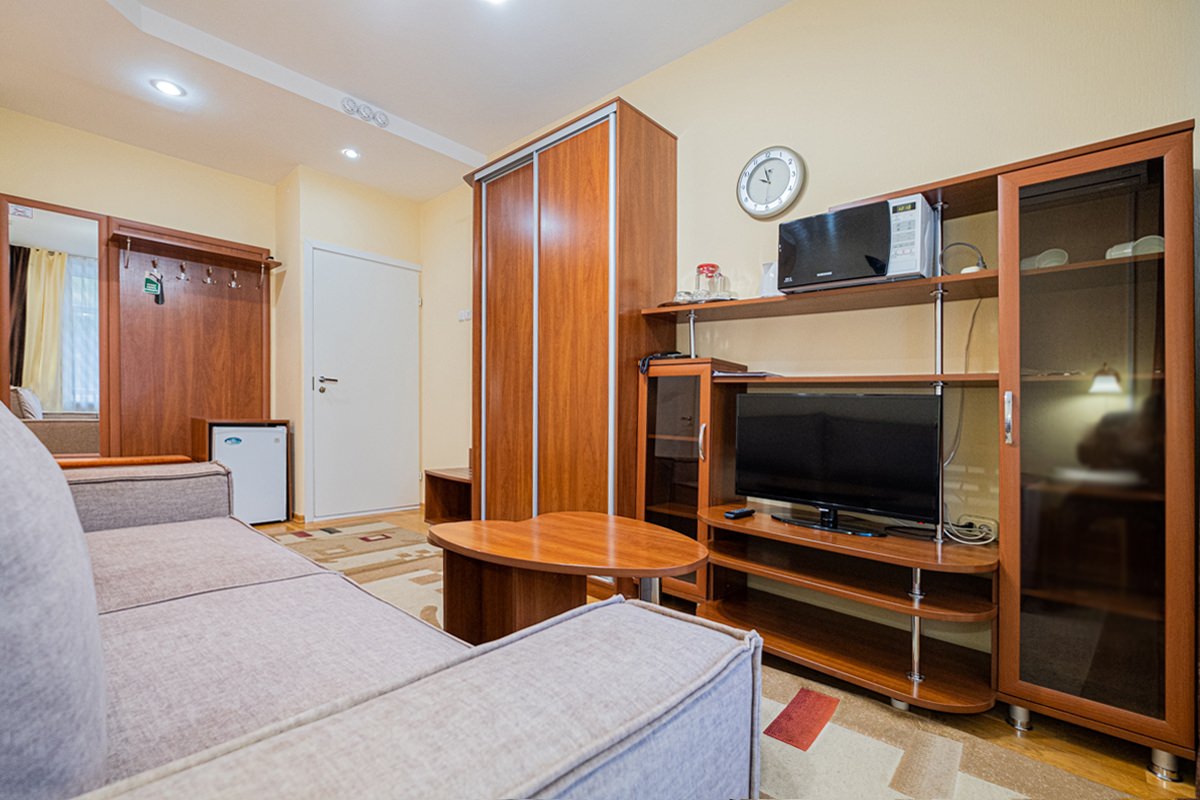 Площадь номера - 25 кв.м. 2 осн. места. 2 доп. места. Мебель: диван раскладной, кровать двуспальная, прикроватные тумбочки, стол, столик журнальный, стул, шкаф. Оборудование: кондиционер, телевизор, телефон, холодильник, чайный набор посуды, электрочайник. Санузел: биде, с душем, тапочки, туалетные принадлежности, фен, халат. Сервис: Wi-Fi бесплатно, смена полотенец, смена постельного белья, уборка номера.