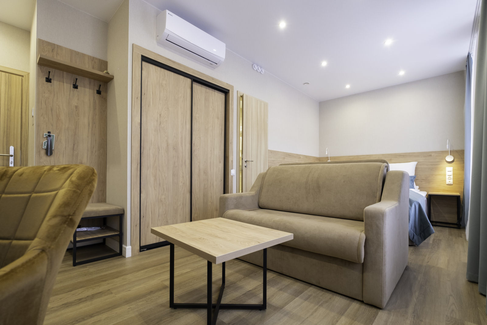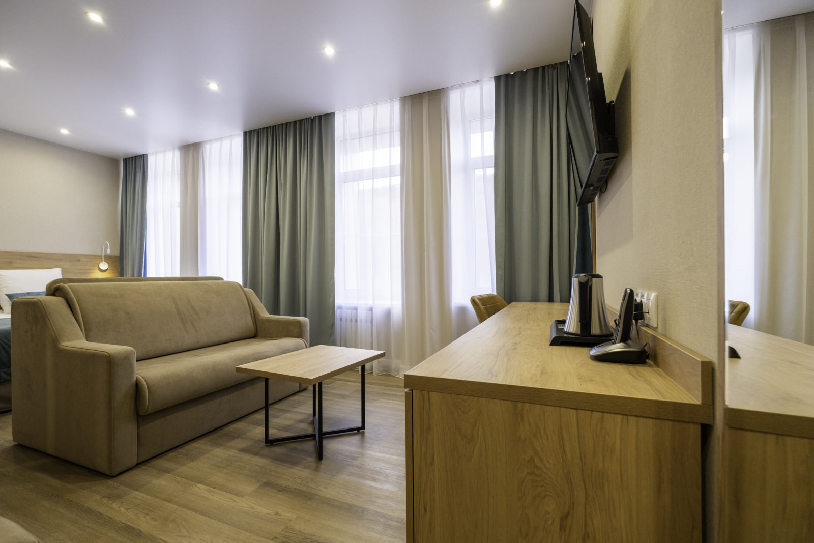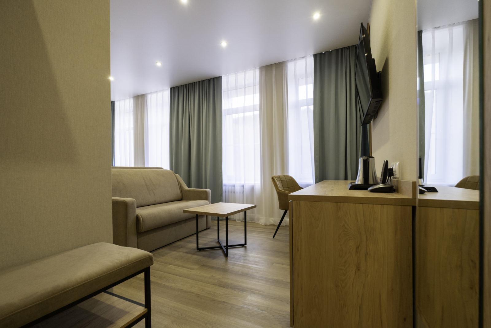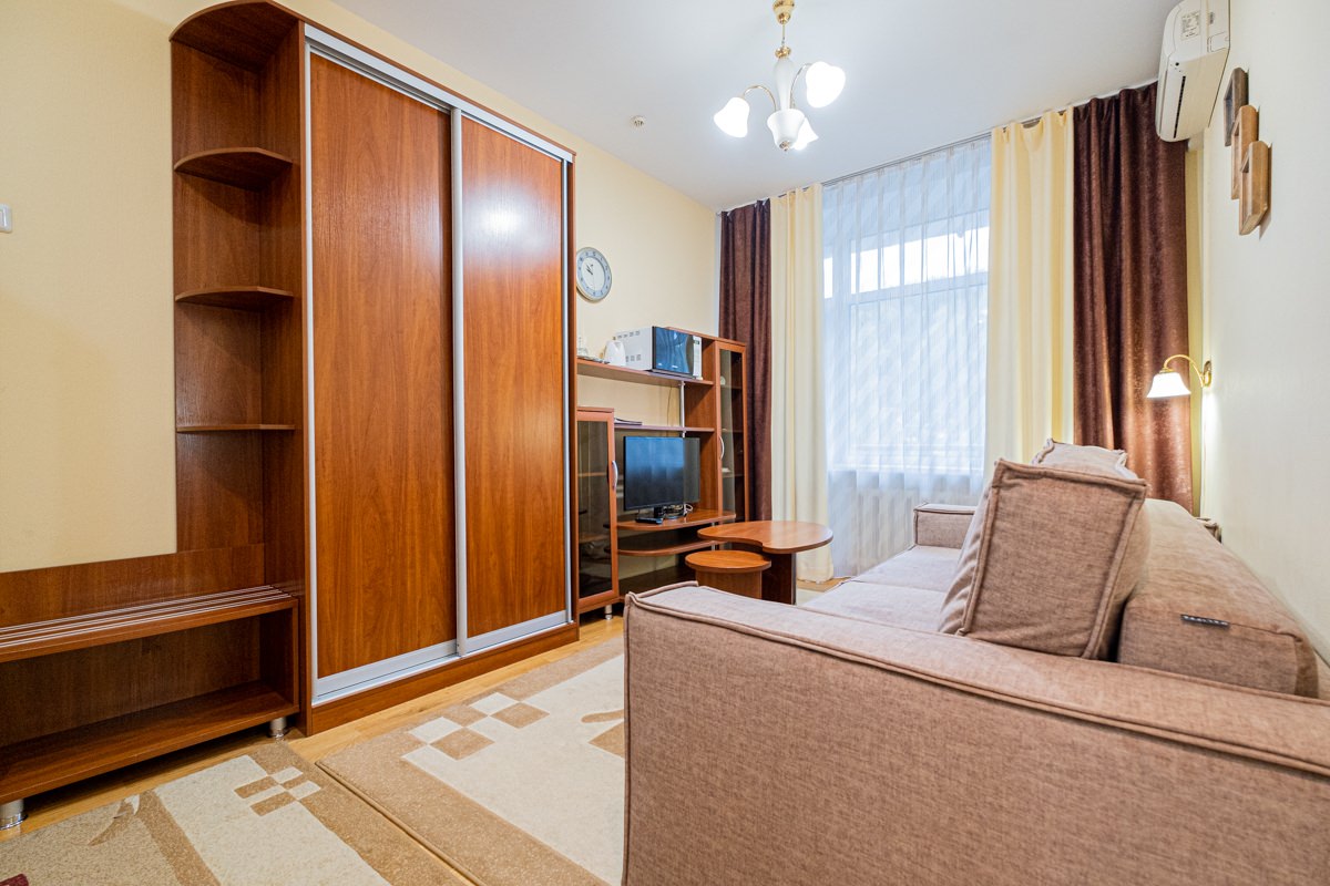 Площадь номера - 25 кв.м. 2 осн. места. 2 доп. места. Мебель: диван раскладной, кровать двуспальная, прикроватные тумбочки, стол, столик журнальный, стул, шкаф. Оборудование: кондиционер, телевизор, телефон, холодильник, чайный набор посуды, электрочайник. Санузел: биде, с душем, тапочки, туалетные принадлежности, фен, халат. Сервис: Wi-Fi бесплатно, смена полотенец, смена постельного белья, уборка номера.
