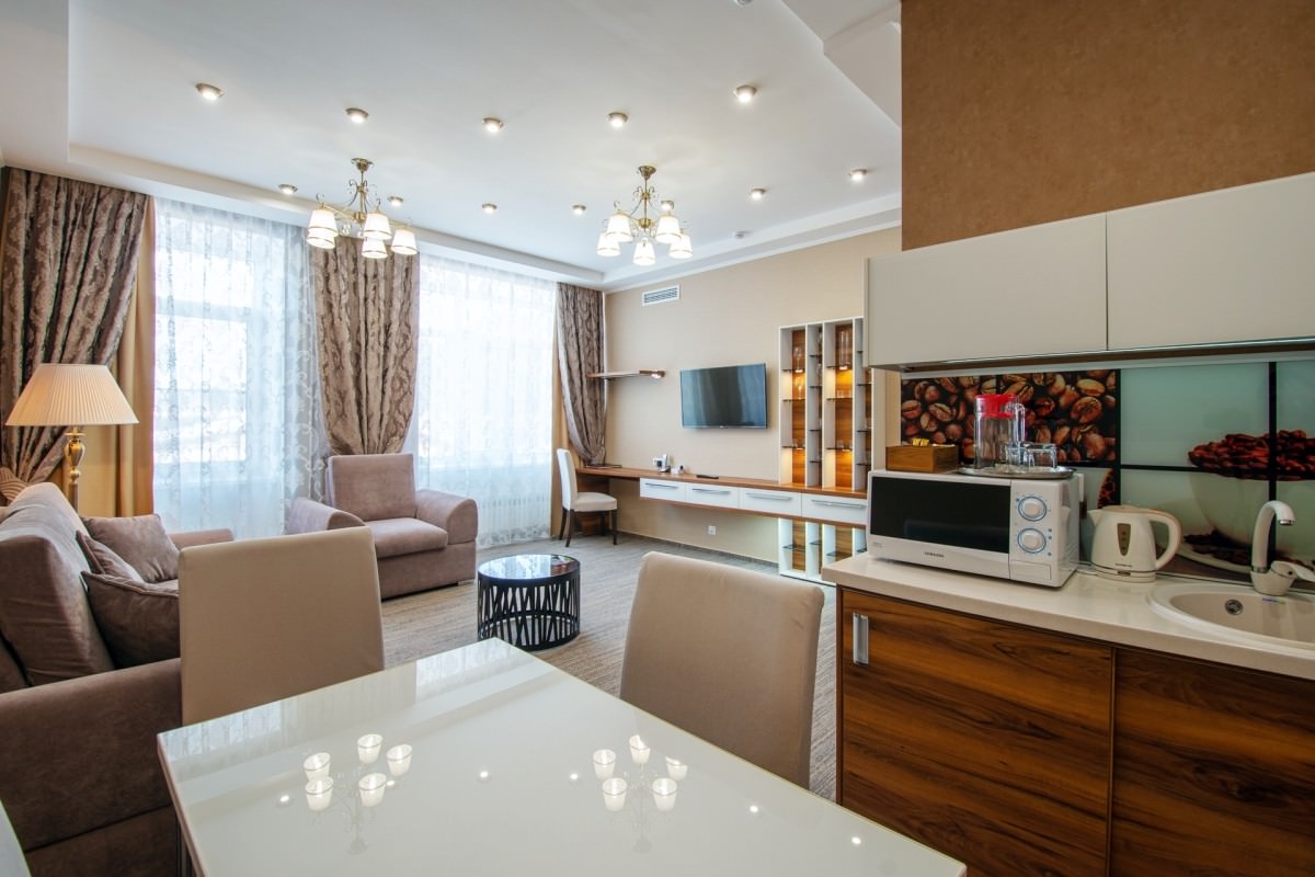 Площадь номера - 58 кв.м. 1 осн. место. 4 доп. места. Балкон. Мебель: диван раскладной, кресла, кровать двуспальная, прикроватные тумбочки, стол, столик журнальный, стулья, шкаф, мини-кухня. Оборудование: гладильная доска, кондиционер, микроволновая печь, набор посуды, сейф, стиральная машина, телевизор, телефон, утюг, холодильник, чайный набор посуды, электрочайник. Санузел: биде, с ванной, тапочки, туалетные принадлежности, фен, халат. Сервис: Wi-Fi бесплатно, смена полотенец, смена постельного белья, уборка номера.