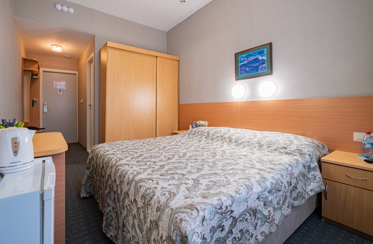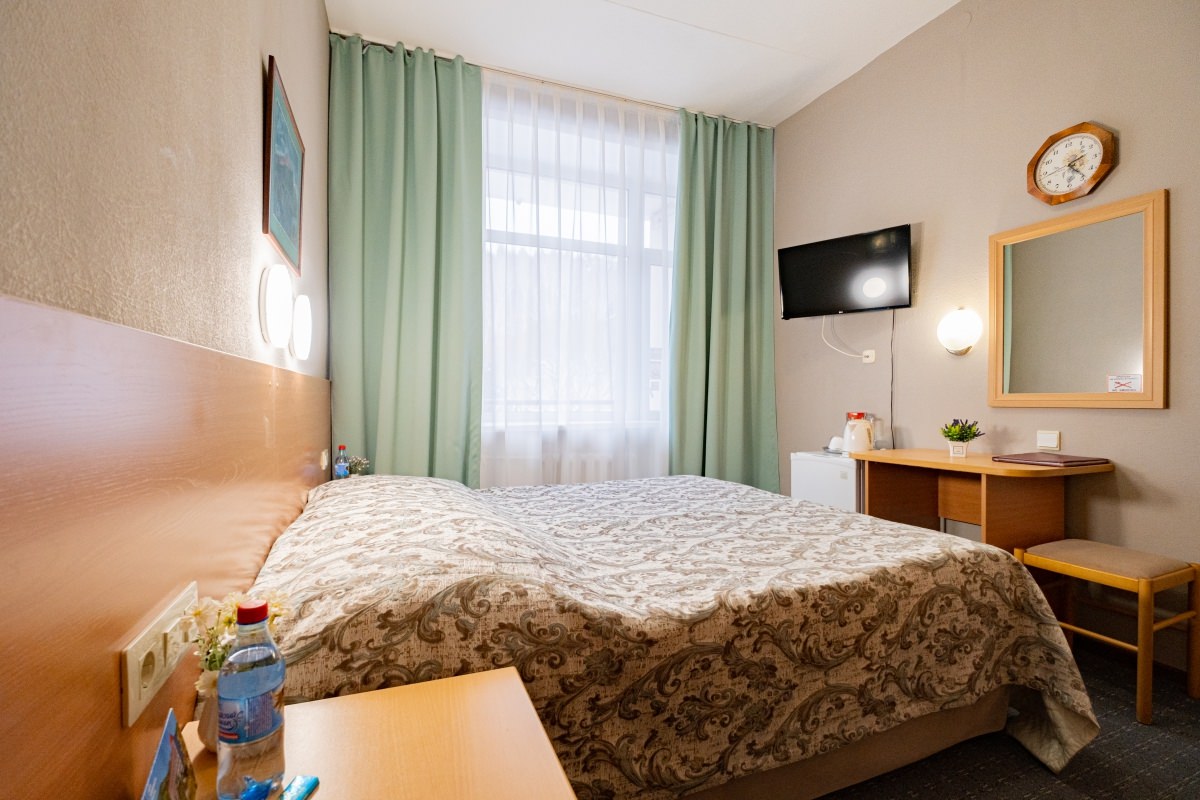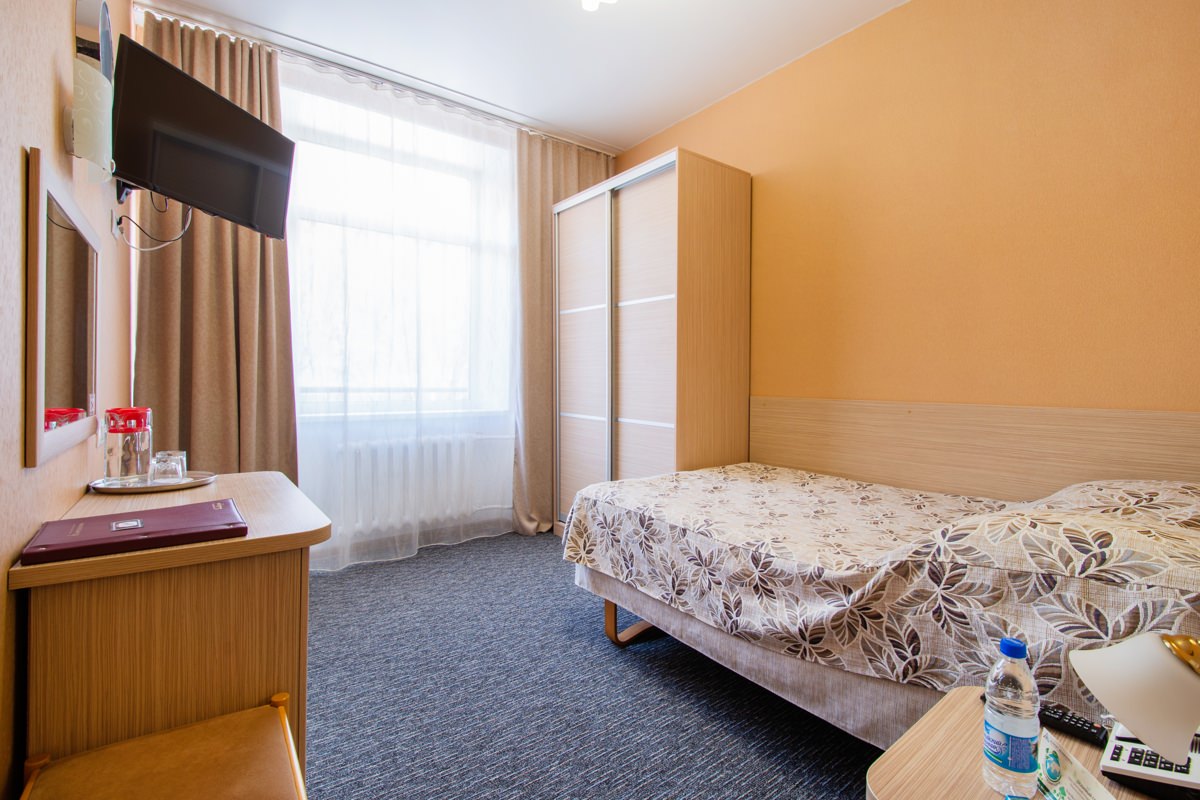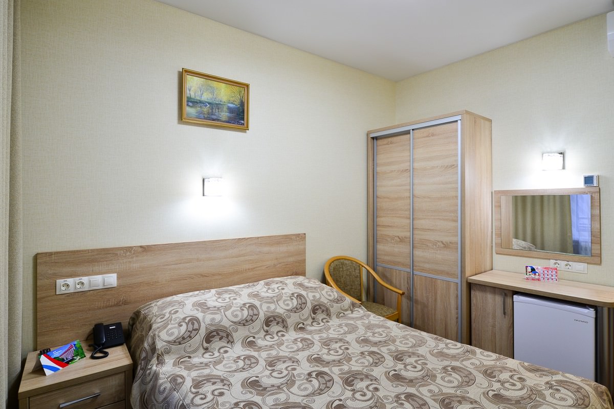 Площадь номера - 15 кв.м. 1 осн. место. 1 доп. место. Балкон. Мебель: вешалка, зеркало, кровать полутороспальная, прикроватная тумбочка, стол, стул, шкаф. Оборудование: кондиционер, телевизор ЖК, телефон, холодильник, чайный набор посуды, электрочайник. Санузел: с душем, туалетные принадлежности, фен. Сервис: Wi-Fi бесплатно, смена полотенец, смена постельного белья, уборка номера.