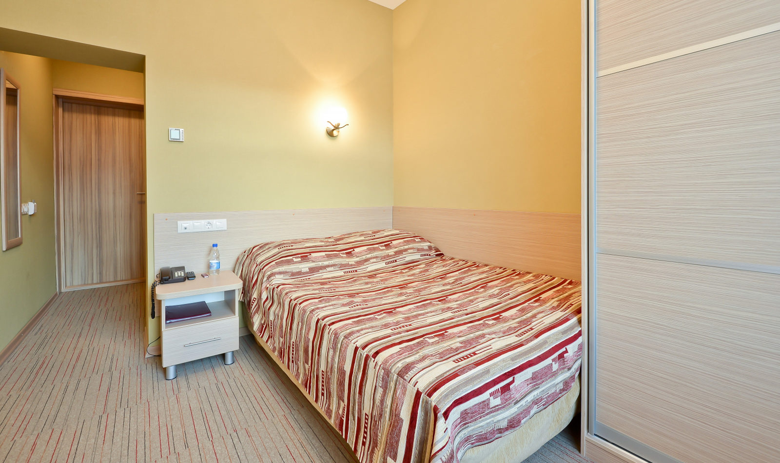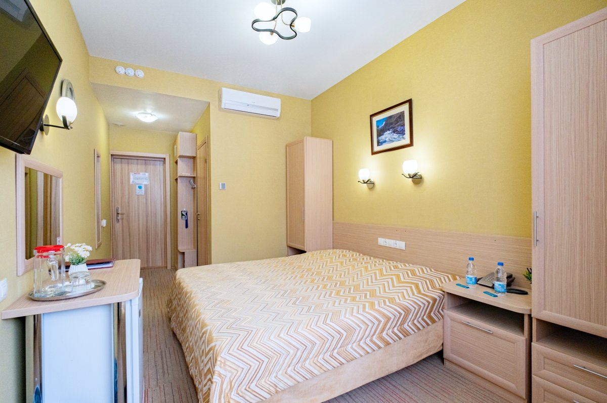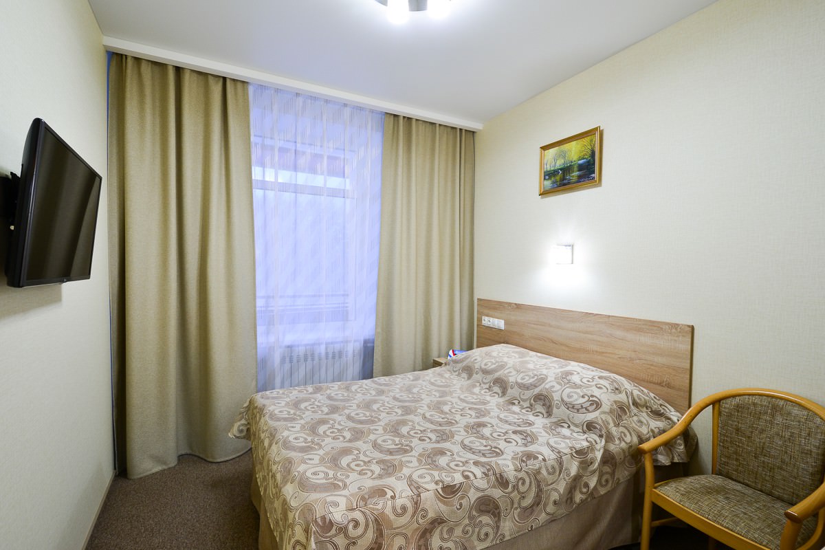 Площадь номера - 15 кв.м. 1 осн. место. 1 доп. место. Балкон. Мебель: вешалка, зеркало, кровать полутороспальная, прикроватная тумбочка, стол, стул, шкаф. Оборудование: кондиционер, телевизор ЖК, телефон, холодильник, чайный набор посуды, электрочайник. Санузел: с душем, туалетные принадлежности, фен. Сервис: Wi-Fi бесплатно, смена полотенец, смена постельного белья, уборка номера.