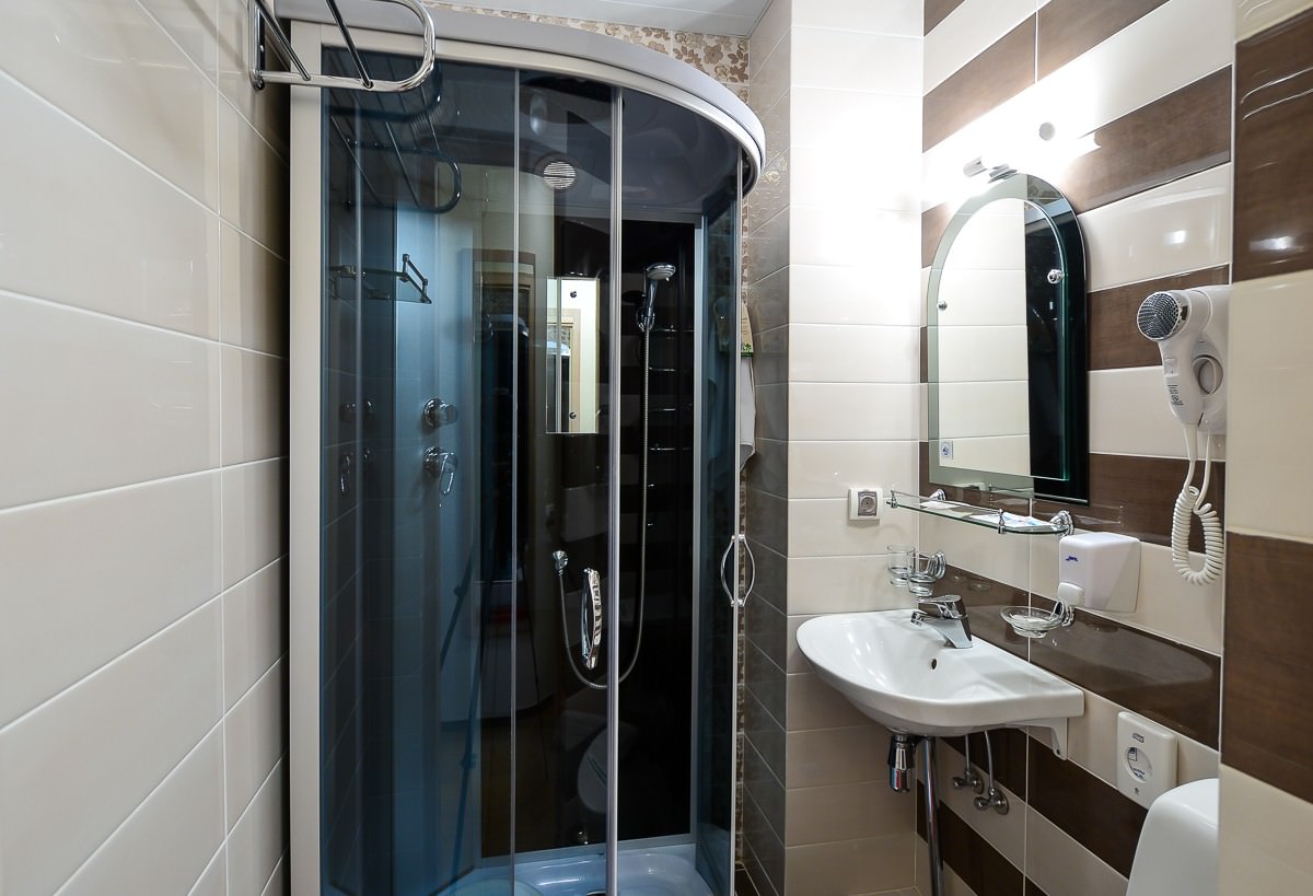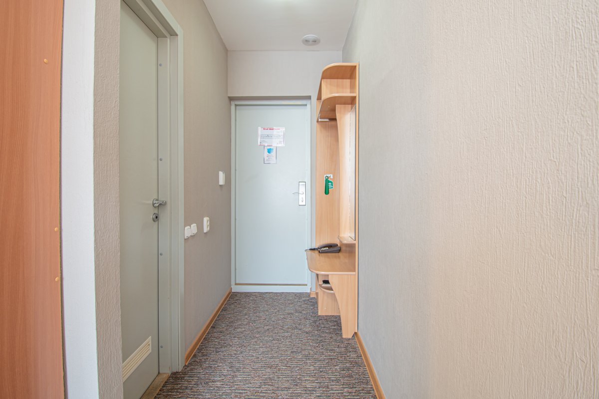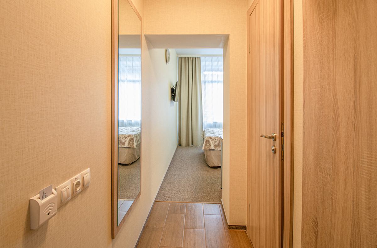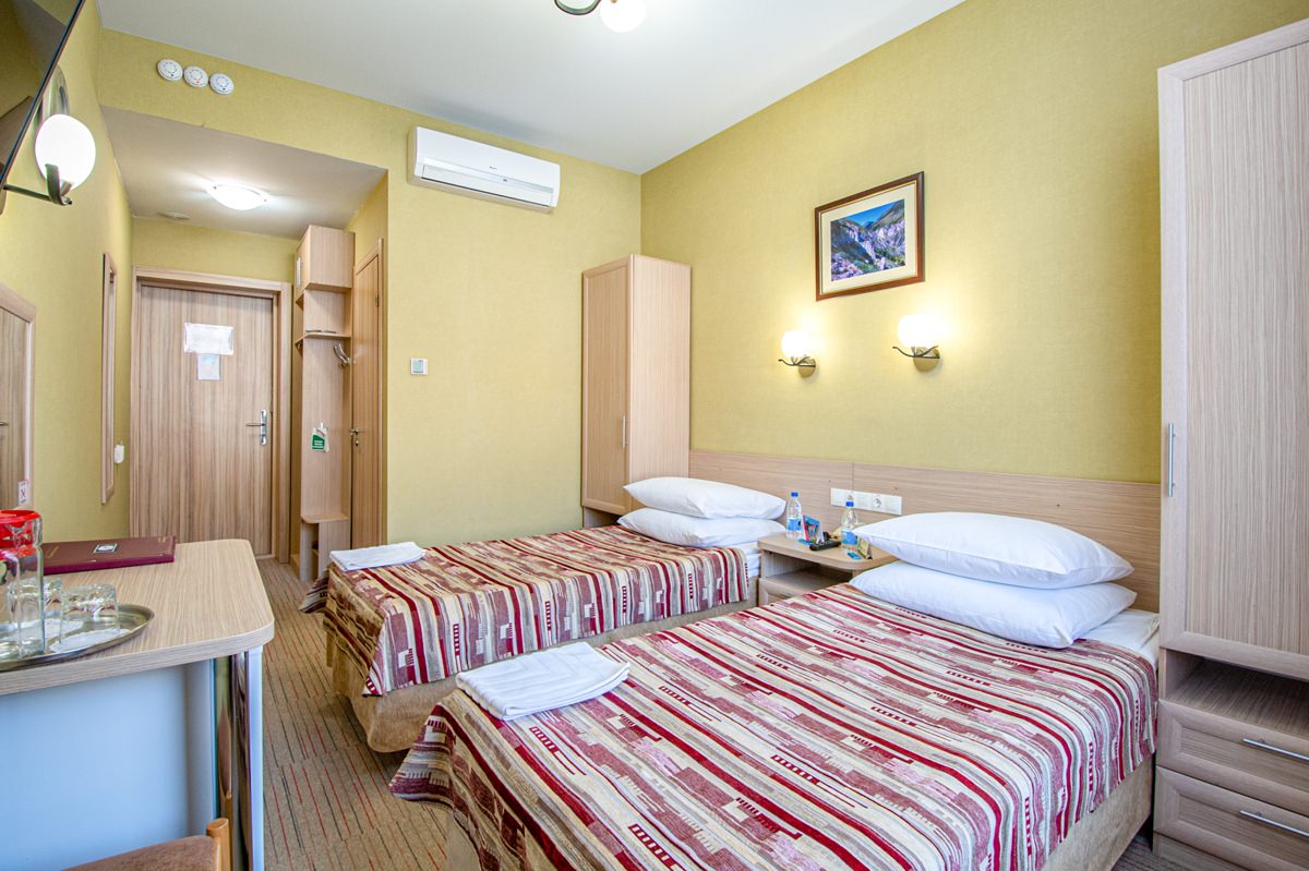 Площадь номера - 15 кв.м. 2 осн. места. 1 доп. место. Балкон. Мебель: зеркало, кровати односпальные, прикроватные тумбочки, стол, стулья, шкаф. Оборудование: телевизор, телефон, холодильник, чайный набор посуды, электрочайник. Санузел: с душем, туалетные принадлежности, фен. Сервис: Wi-Fi бесплатно, смена полотенец, смена постельного белья, уборка номера.