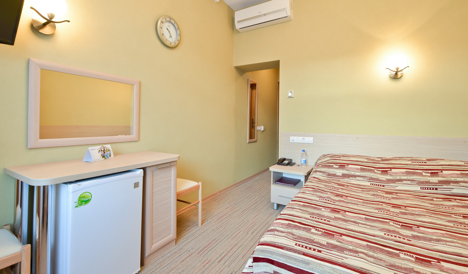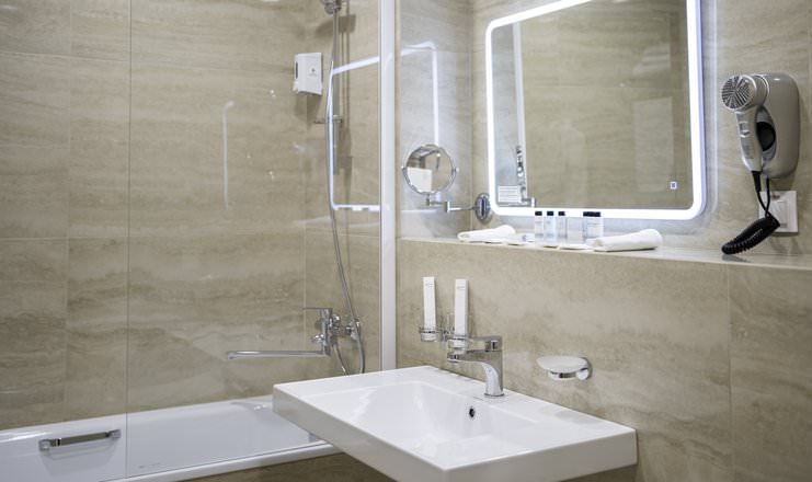 Площадь номера - 27 кв.м. 2 осн. места. 1 доп. место. Балкон: с мебелью, с сушилкой. Мебель: зеркало, кресло-кровать, кровати односпальные, прикроватные тумбочки, стол (рабочий), стулья, шкаф. Оборудование: кондиционер, набор посуды, телевизор ЖК, телефон, холодильник, электрочайник. Санузел: биде, с ванной или душевой кабиной, туалетные принадлежности, фен. Сервис: Wi-Fi бесплатно, смена полотенец, смена постельного белья, уборка номера.