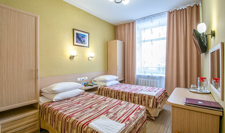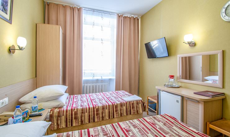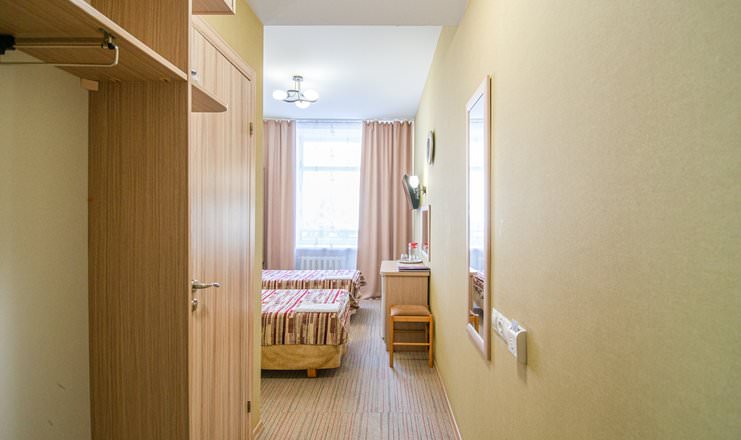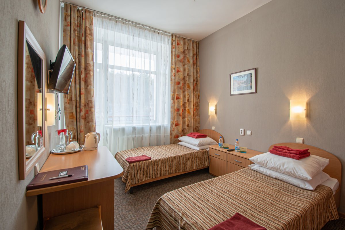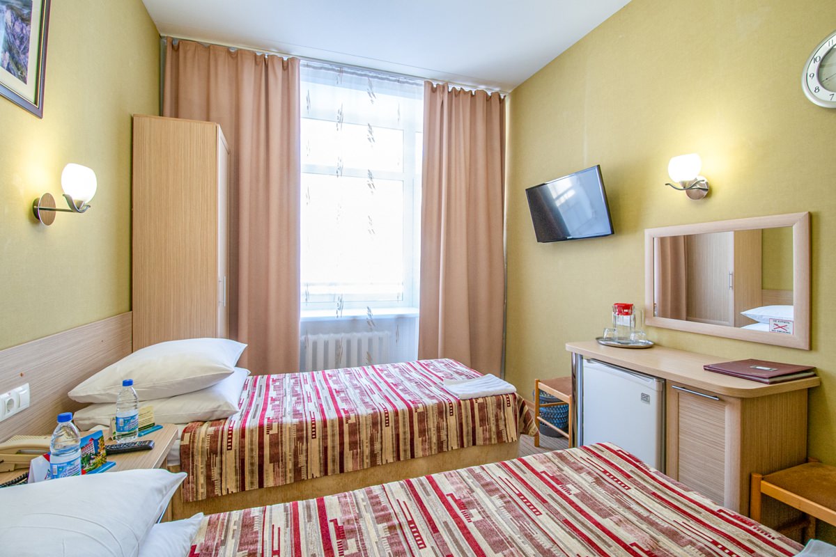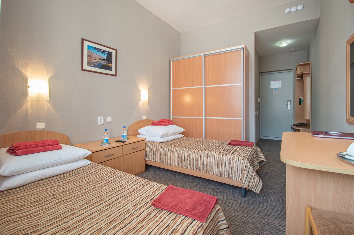 Площадь номера - 15 кв.м. 1 осн. место. Балкон. Мебель: зеркало, кровати односпальные, прикроватные тумбочки, стол, стулья, шкаф. Оборудование: телевизор, телефон, холодильник, чайный набор посуды, электрочайник. Санузел: с душем, туалетные принадлежности, фен. Сервис: Wi-Fi бесплатно, смена полотенец, смена постельного белья, уборка номера.