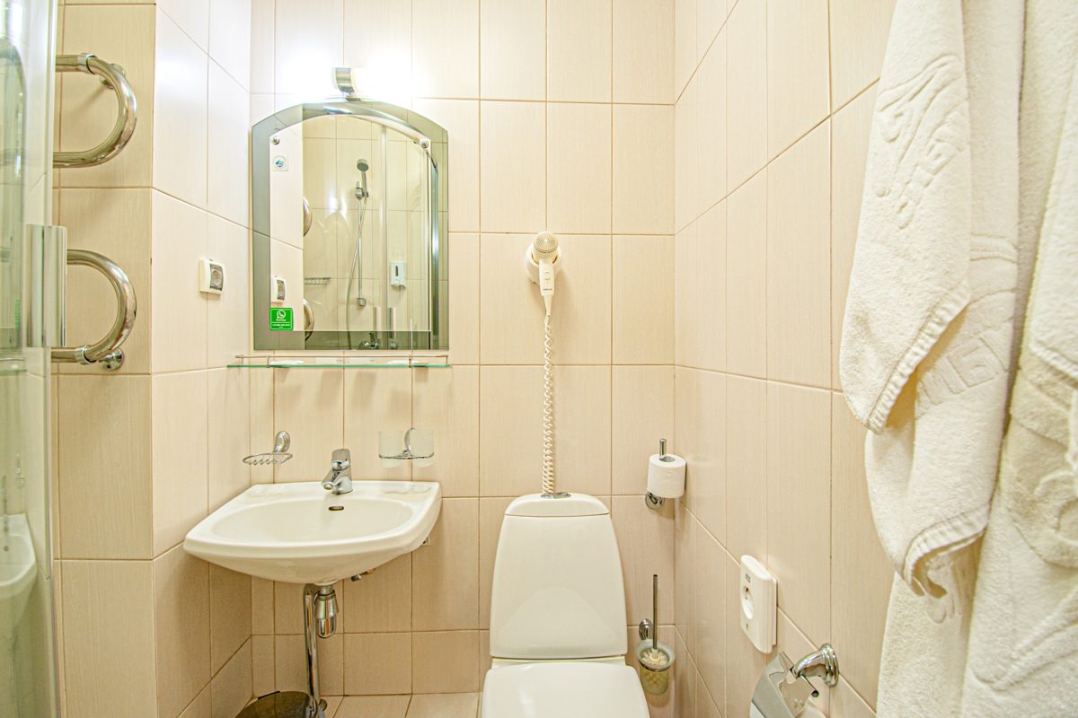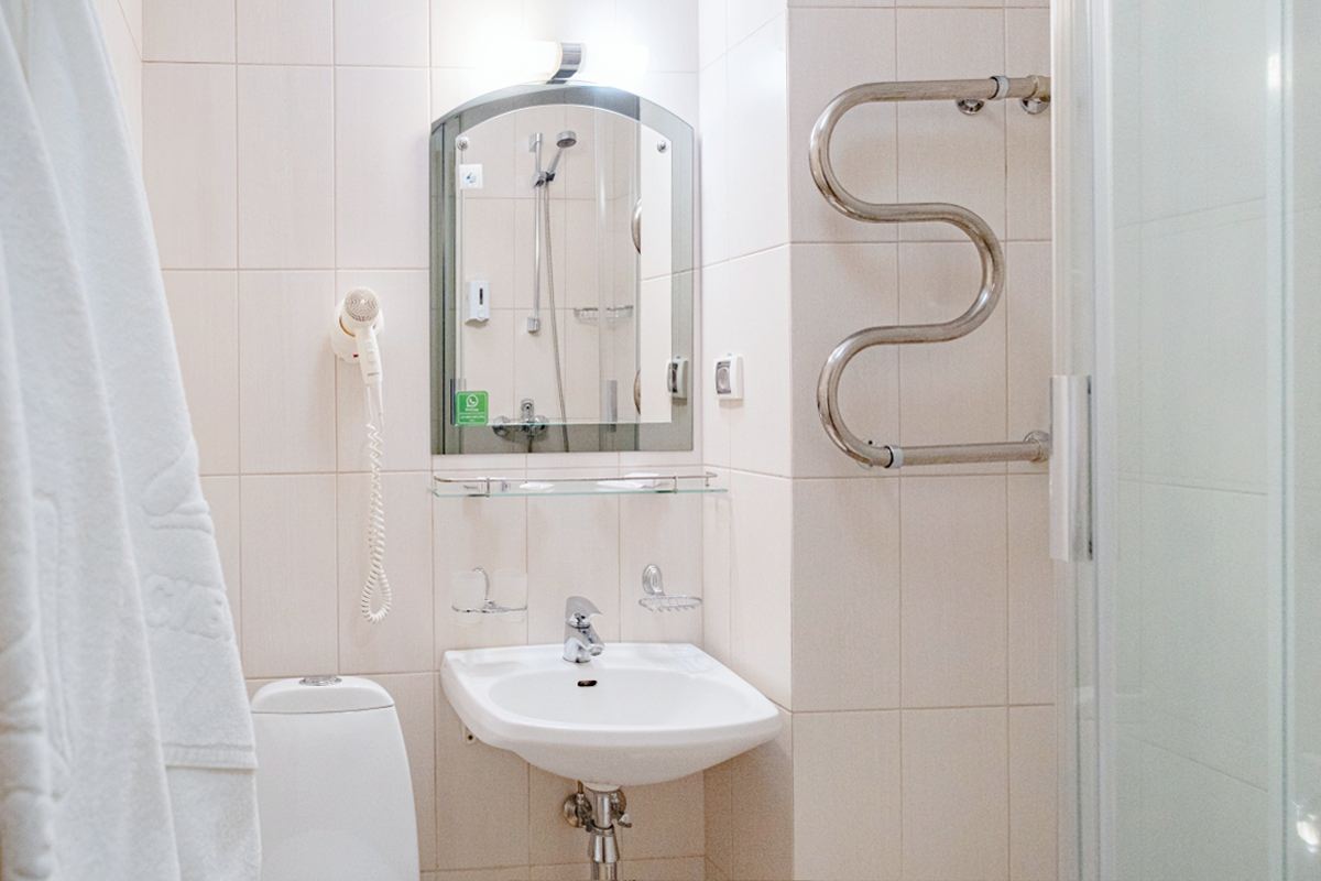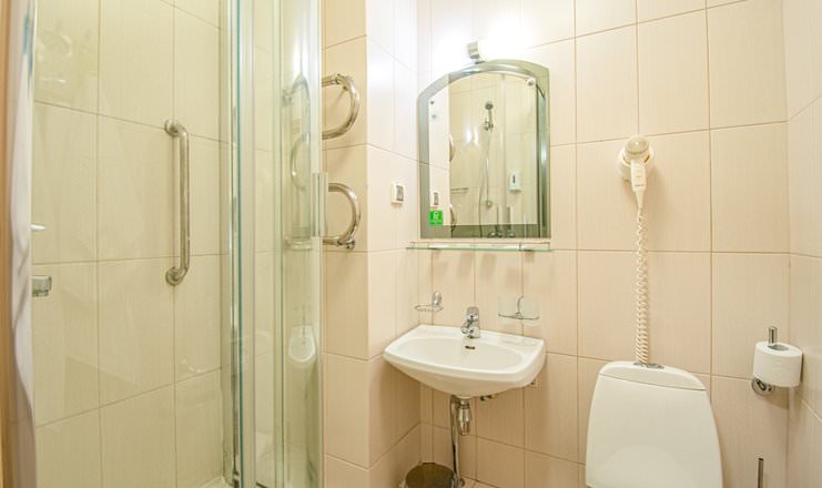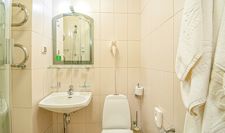 Площадь номера - 15 кв.м. 1 осн. место. Мебель: вешалка, зеркало, кровати односпальные, прикроватные тумбочки, стол, стулья, шкаф. Оборудование: телевизор, телефон, холодильник, чайный набор посуды, электрочайник. Санузел: с душем, туалетные принадлежности, фен. Сервис: Wi-Fi бесплатно, смена полотенец, смена постельного белья, уборка номера.