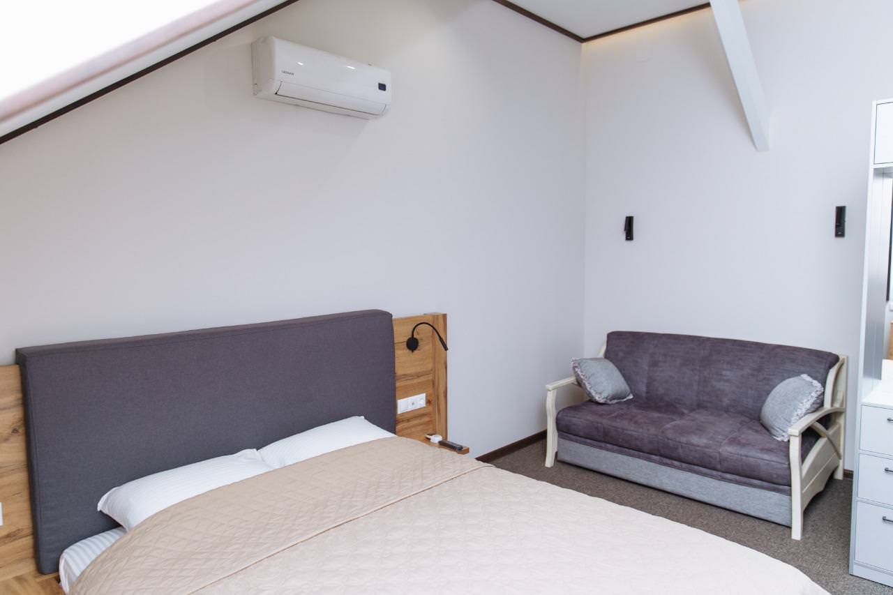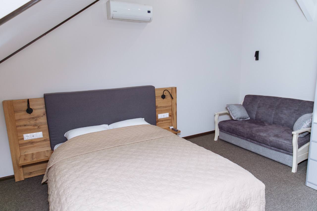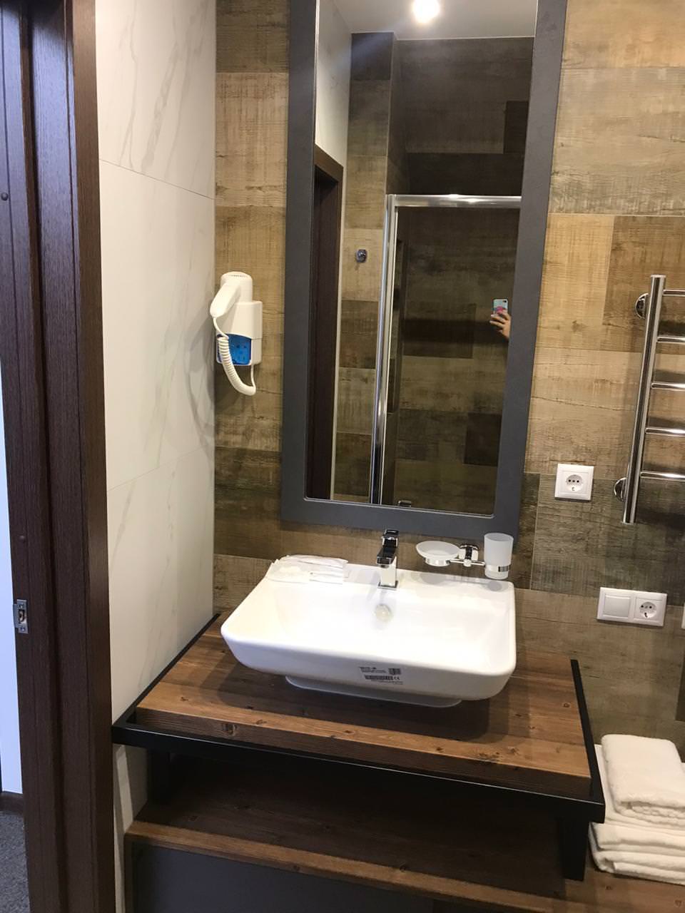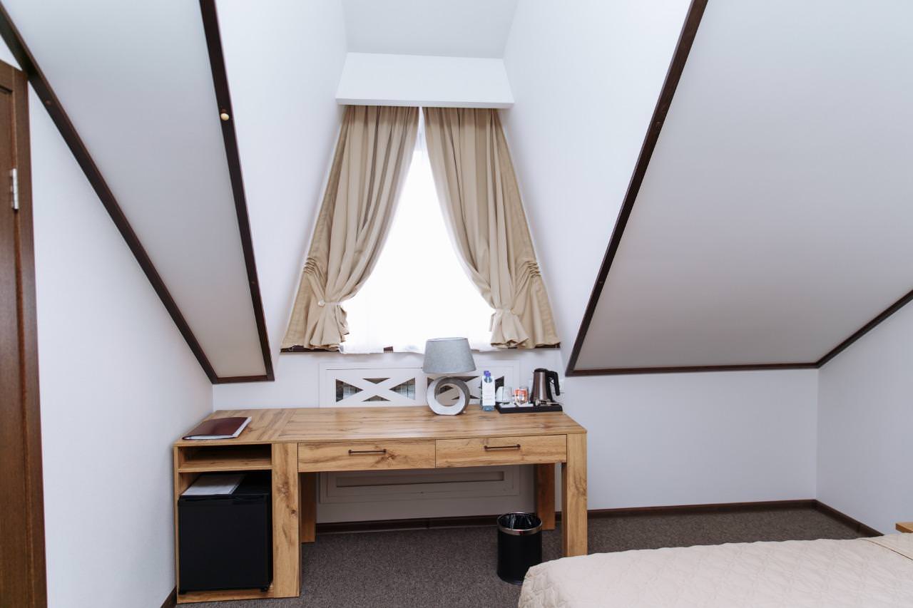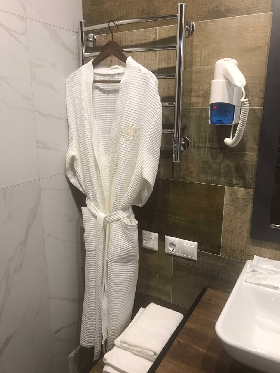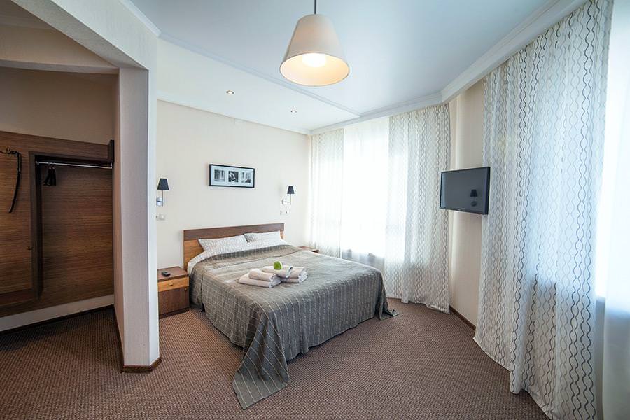 Номер повышенной комфортности - двуспальная кровать - прикроватная тумбочка - мягкая зона (диван) -гардеробная - телевизор (20 каналов) - бесплатный Wi-Fi - рабочая зона - набор посуды для чаепития - холодильник - кондиционер - мини-бар (по прейскуранту) - сейф - санузел, душ (фен, туалетные принадлежности, халат, тапочки)