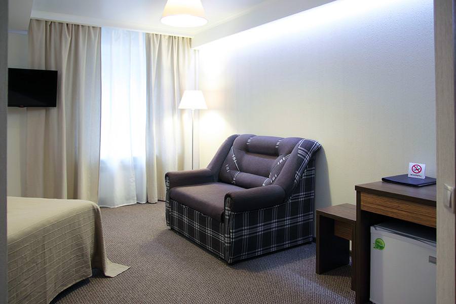 Номер повышенной комфортности - полутороспальная кровать - прикроватная тумбочка - мягкая зона (кресло) - телевизор (20 каналов) - бесплатный Wi-Fi - рабочая зона - набор посуды для чаепития - холодильник - кондиционер - мини-бар (по прейскуранту) - сейф - санузел, душ (фен, туалетные принадлежности, халат, тапочки)