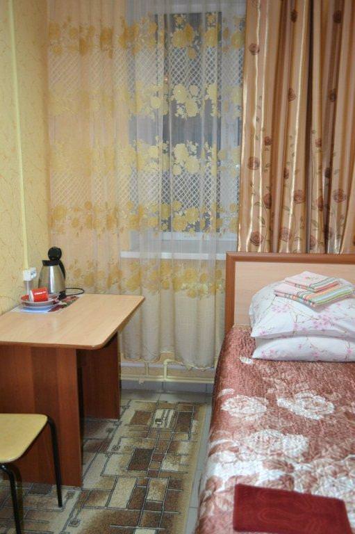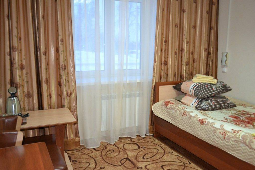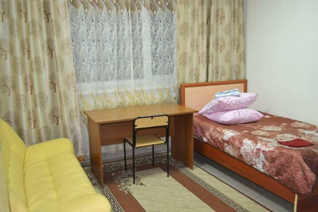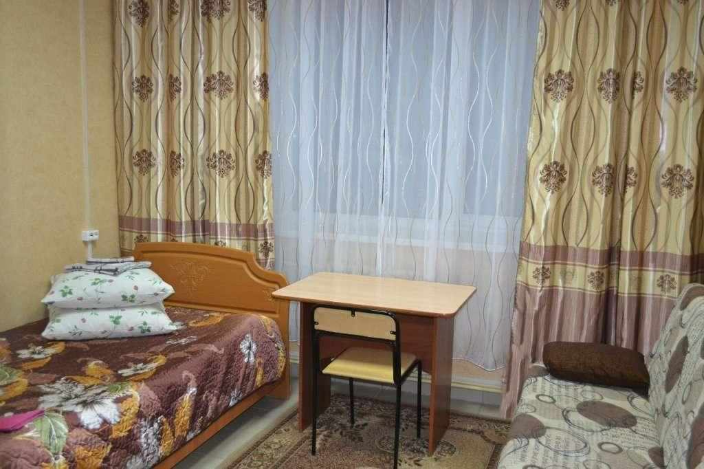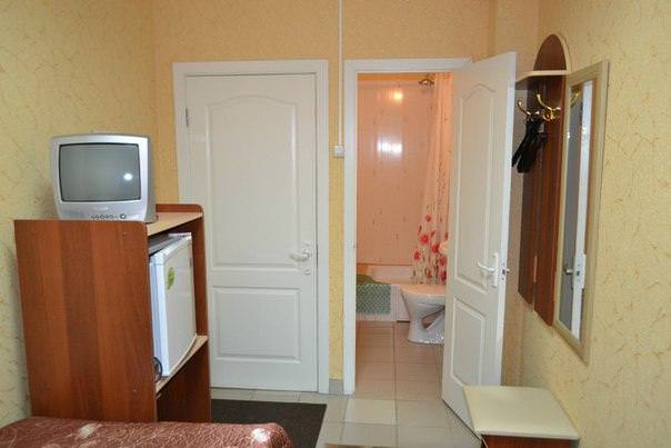 В номере: Односпальная кровать, Телевизор, холодильник, чайник, посуда (тарелка, чашка, ложка, вилка) стол, стулья, шкаф или вешалка для одежды, зеркало. Все удобства в номере.