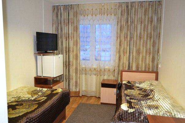 В номере: Две односпальные кровати, Телевизор, холодильник, чайник, посуда (тарелка, чашка, ложка, вилка) стол, стулья, шкаф или вешалка для одежды, зеркало. Все удобства в номере.