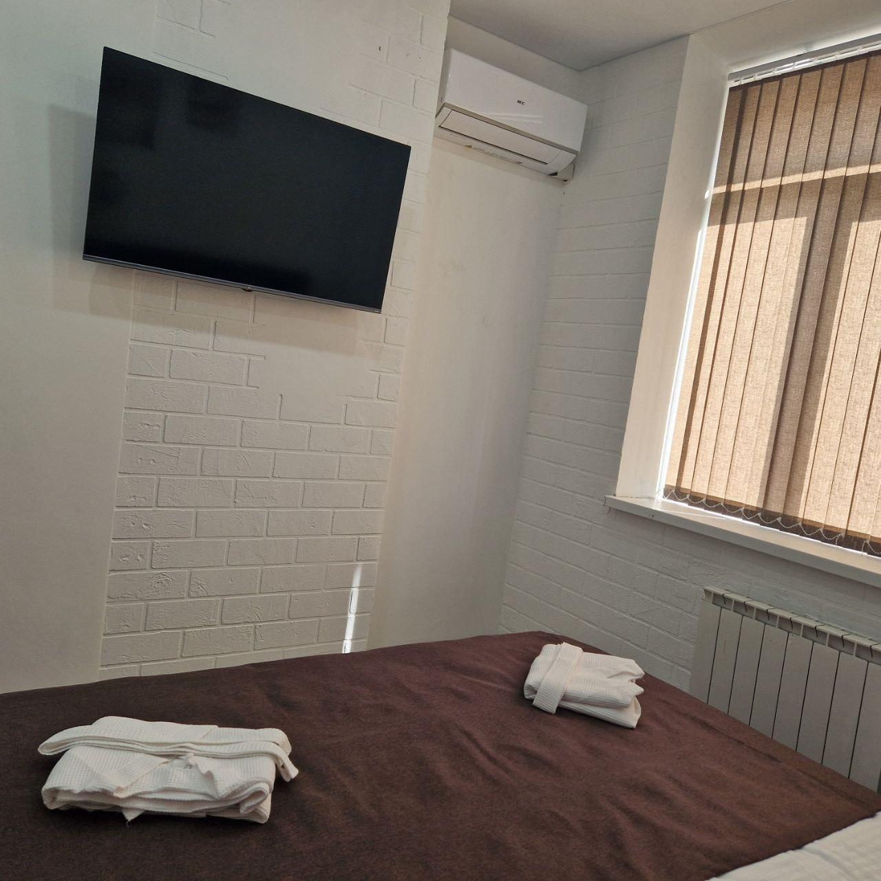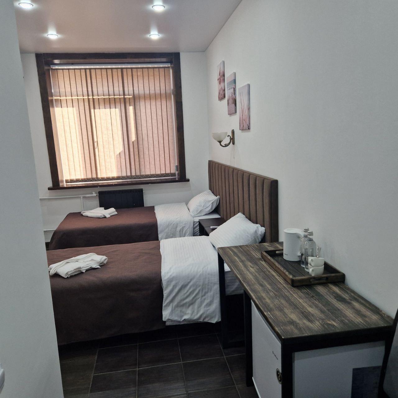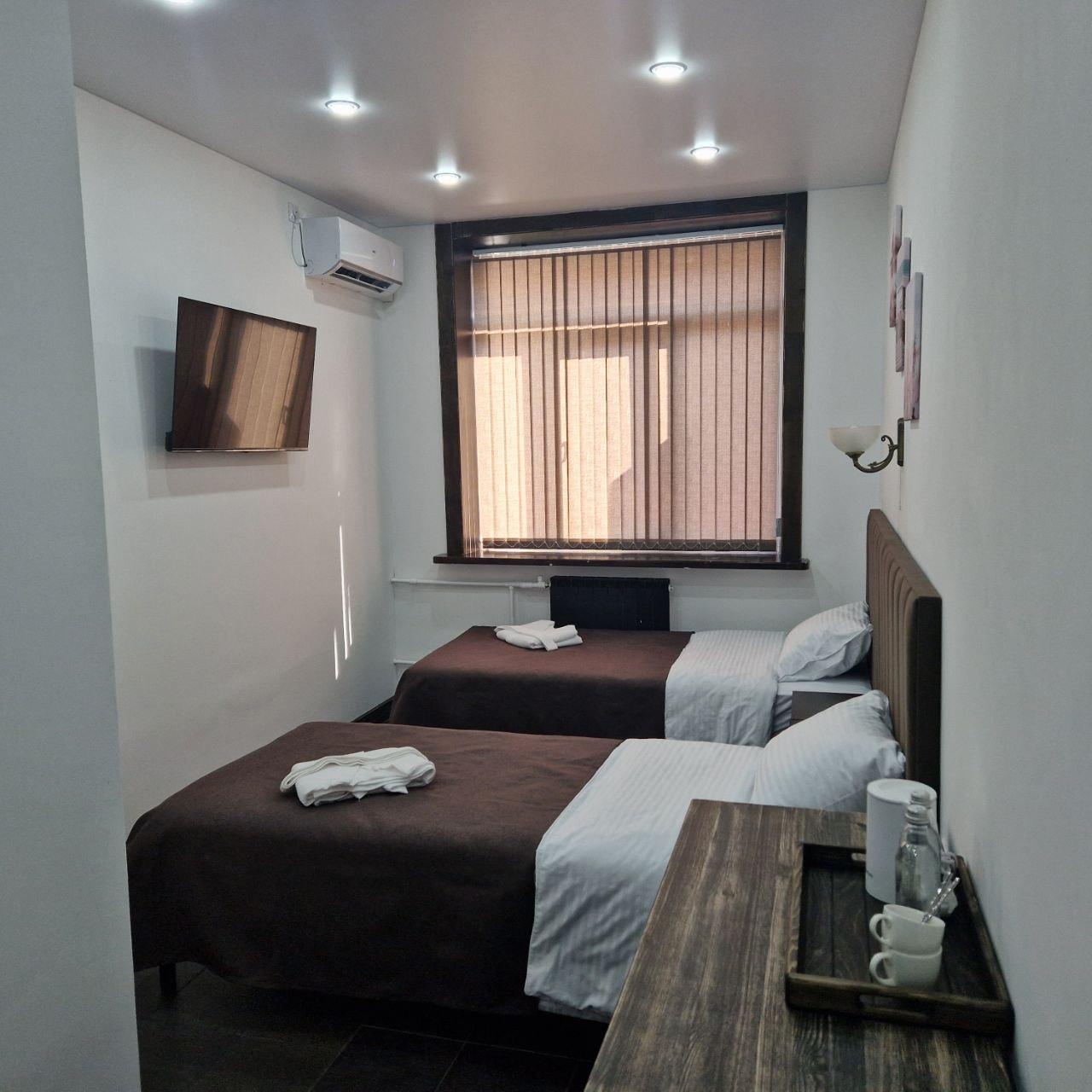 Номер оснащен 2мя односпальными кроватями с возможностью объединить в 1 двуспальную), кондиционером, телевизором, холодильником, чайником, чайными приборами, полный сан узел, фен, комплект полотенец, халат, косметические средства для душа, тапочки. Ежедневная уборка номера, смена белья и полотенец гарантируют комфорт и чистоту. Постельное белье из 100% высококачественного хлопка, а удобные матрасы обеспечат глубокий и восстанавливающий отдых каждую ночь.