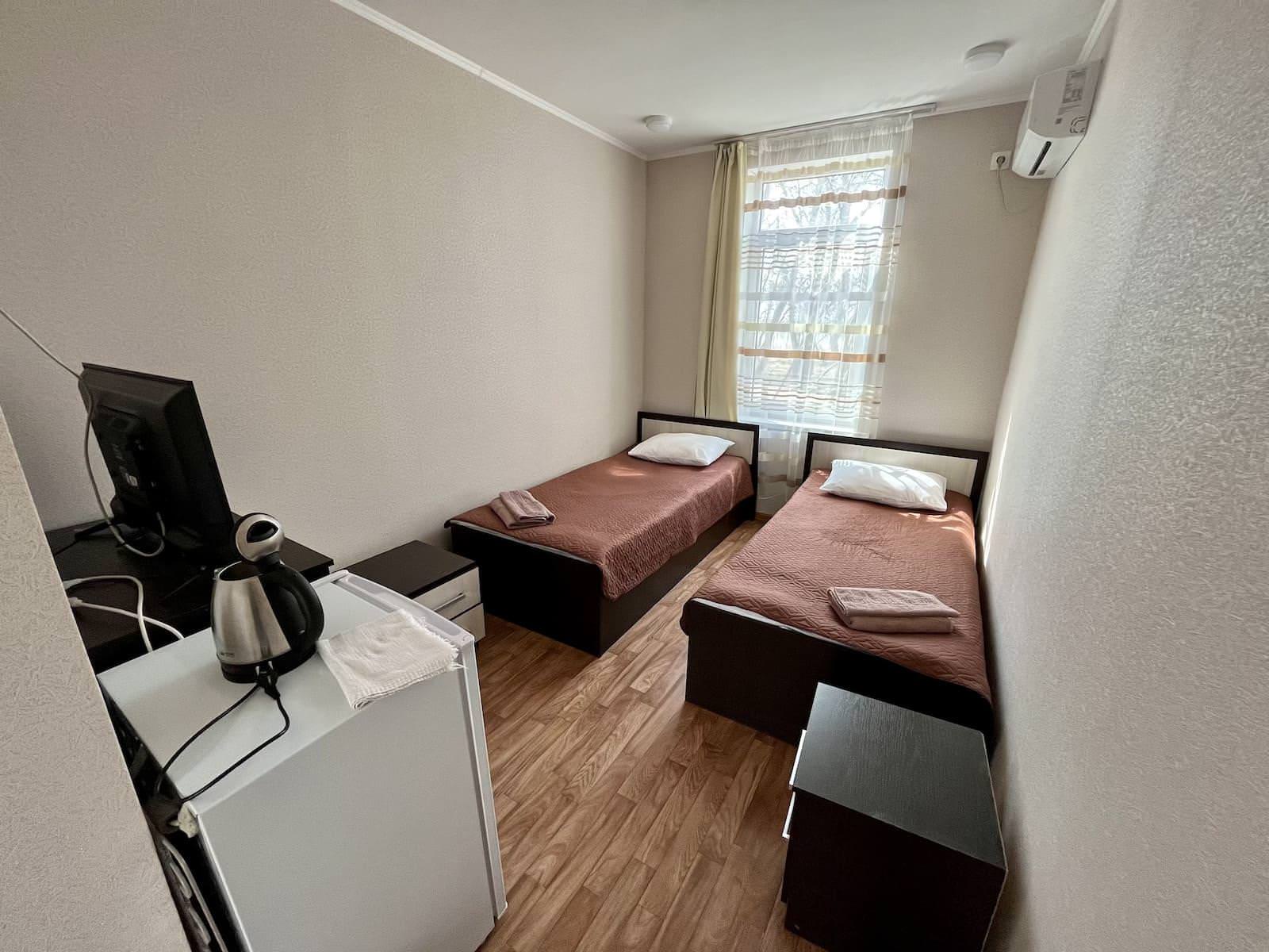 Двухместный номер стандарт с 2 односпальными кроватями. В номере: телевизор, кондиционер, место для хранения одежды, санузел с душевой, холодильник, чайник и посуда.