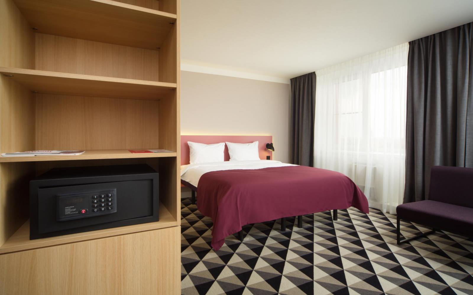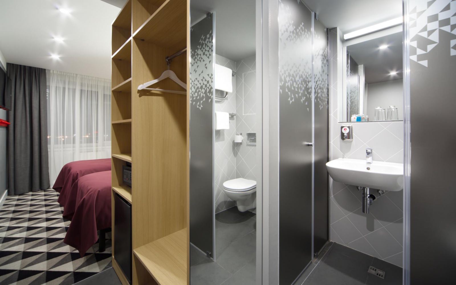Номера категории "Стандарт двухместный" - это комфортные номера площадью 18 кв. м. с одной двуспальной или двумя раздельными кроватями и панорамным видом на центр города.