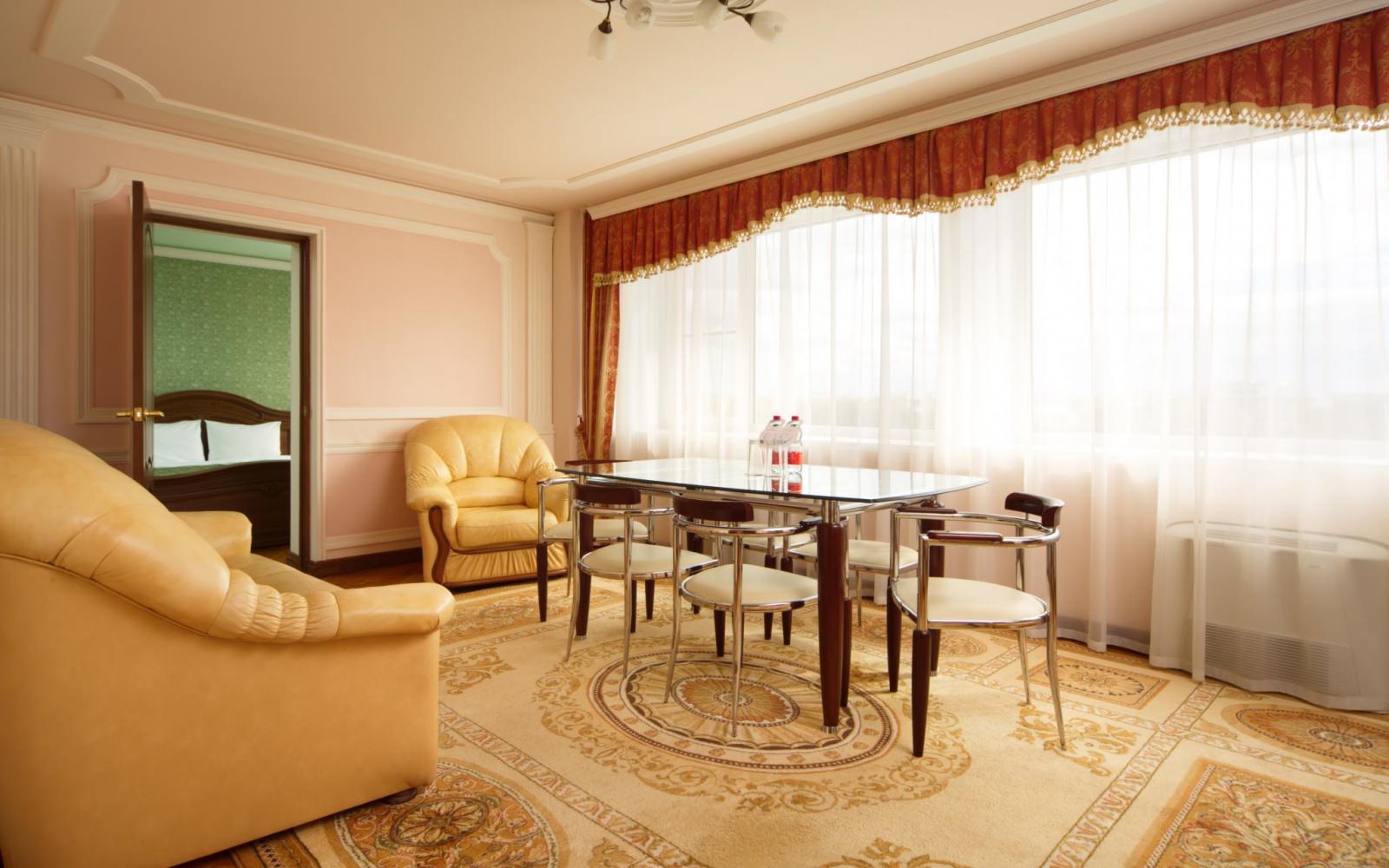 Двуспальная кровать,диван, рабочее место,кабельное ТВ,телефон,сейф,доступ к сети интернет Wi-Fi,мини-бар/холодильник,ванная комната с джакузи,фен,набор индивидуальных средств гигиены и красоты,тапочки и халаты,единая система кондиционирования.Вид из номера на город.