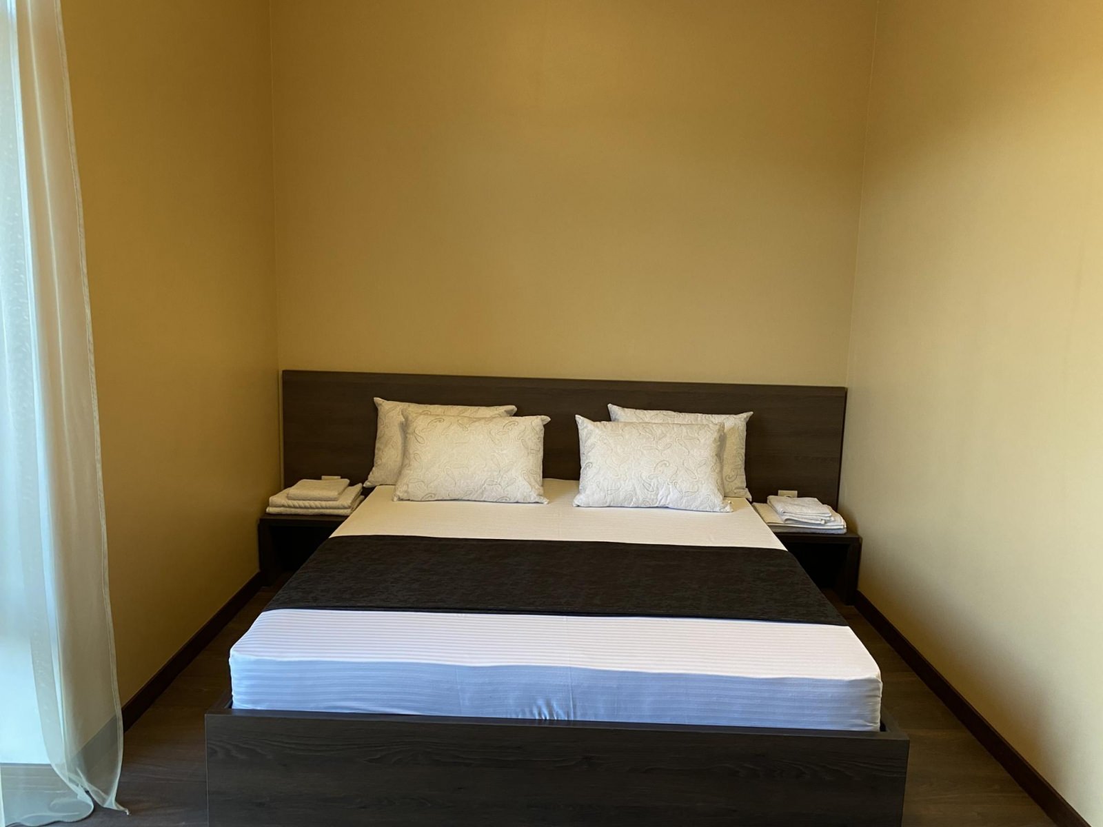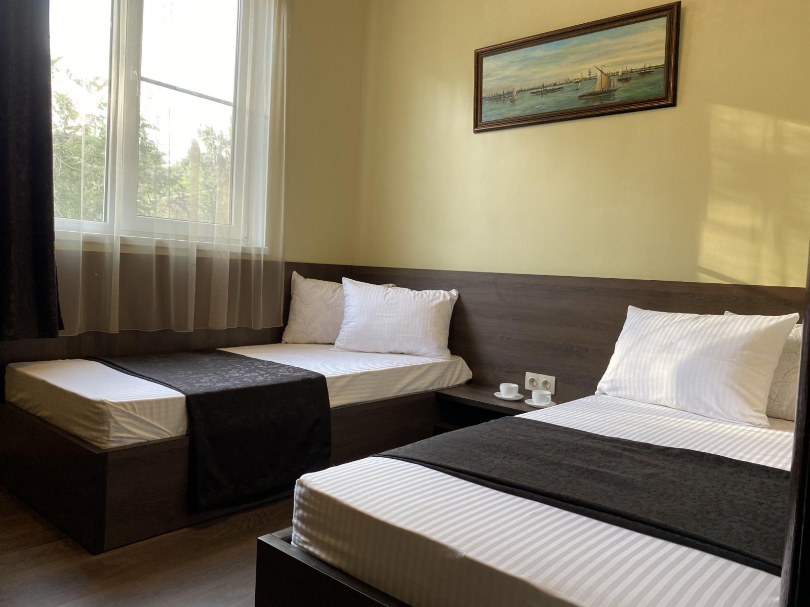 В комфортабельном номере две односпальные кровати (под запрос 1 двуспальная кровать), ортопедические матрасы, прикроватные тумбы, встроенный шкаф, кондиционер, холодильник, чайная пара, электрический чайник, посуда, мини-бар, телевизор, стол-трансформер, стулья. В ванной комнате: душевая кабина, раковина, унитаз, фен, полотенца, тапочки, средства личной гигиены.