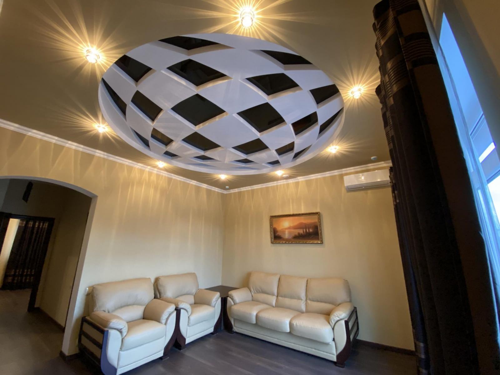 В комфортабельном двухкомнатном номере: 1 двуспальная кровать, ортопедический матрас, прикроватные тумбы, встроенный шкаф, кондиционер, холодильник, чайная пара, электрический чайник, посуда, мини-бар, два телевизора, диван, два кресла, журнальный столик, стулья. В ванной комнате: джакузи, раковина, унитаз, биде, фен, полотенца, тапочки, средства личной гигиены.