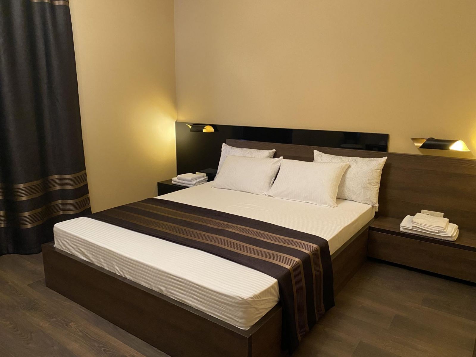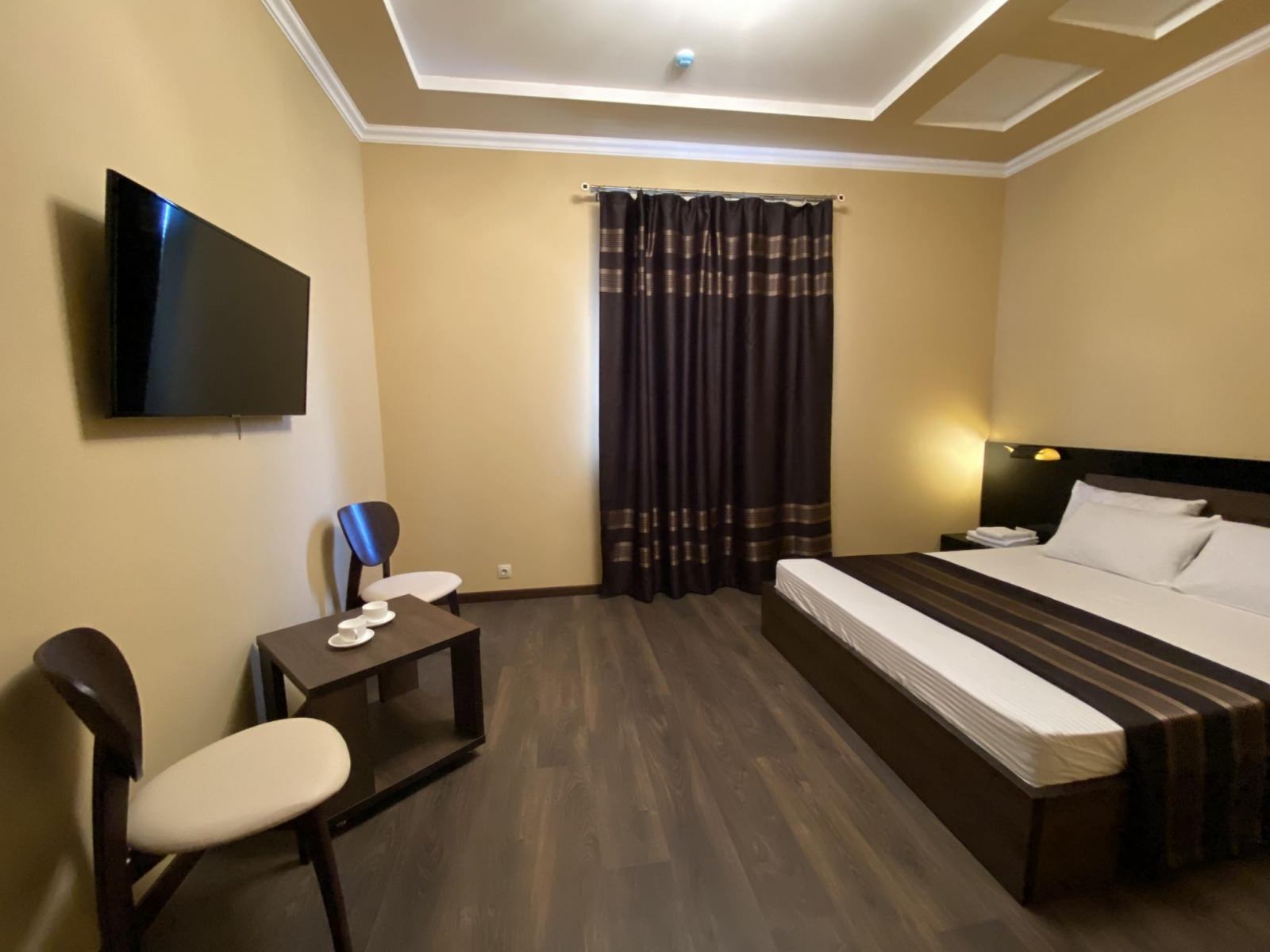 В комфортабельном номере одна двуспальная кровать, ортопедические матрасы, прикроватные тумбы, встроенный шкаф, кондиционер, холодильник, чайная пара, электрический чайник, посуда, мини-бар, телевизор, стол-трансформер, стулья. В ванной комнате: душевая кабина, раковина, унитаз, фен, полотенца, тапочки, средства личной гигиены.