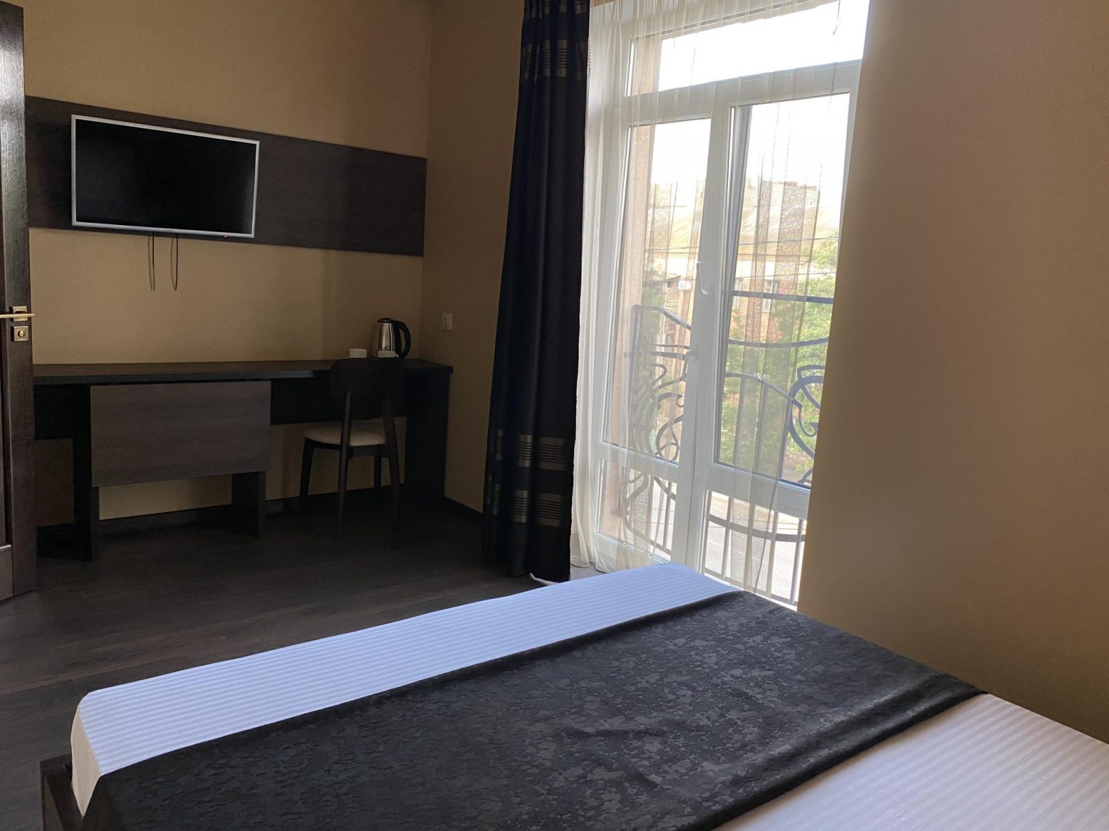 В комфортабельном номере одна двуспальная кровать, ортопедические матрасы, прикроватные тумбы, встроенный шкаф, кондиционер, холодильник, чайная пара, электрический чайник, посуда, мини-бар, телевизор, стол-трансформер, стулья. В ванной комнате: душевая кабина, раковина, унитаз, фен, полотенца, тапочки, средства личной гигиены.