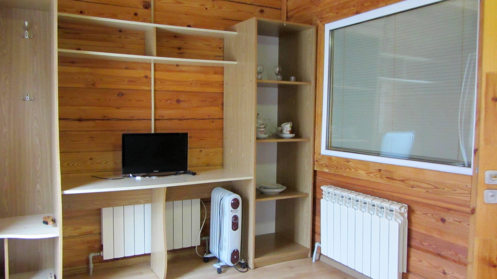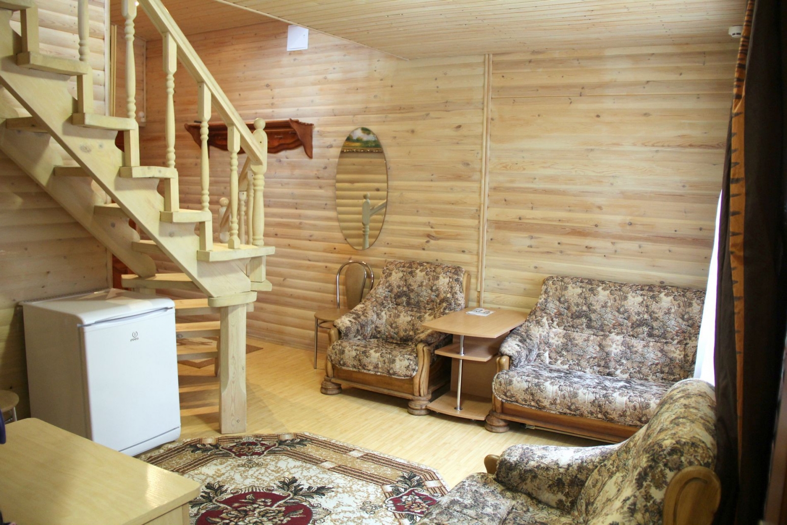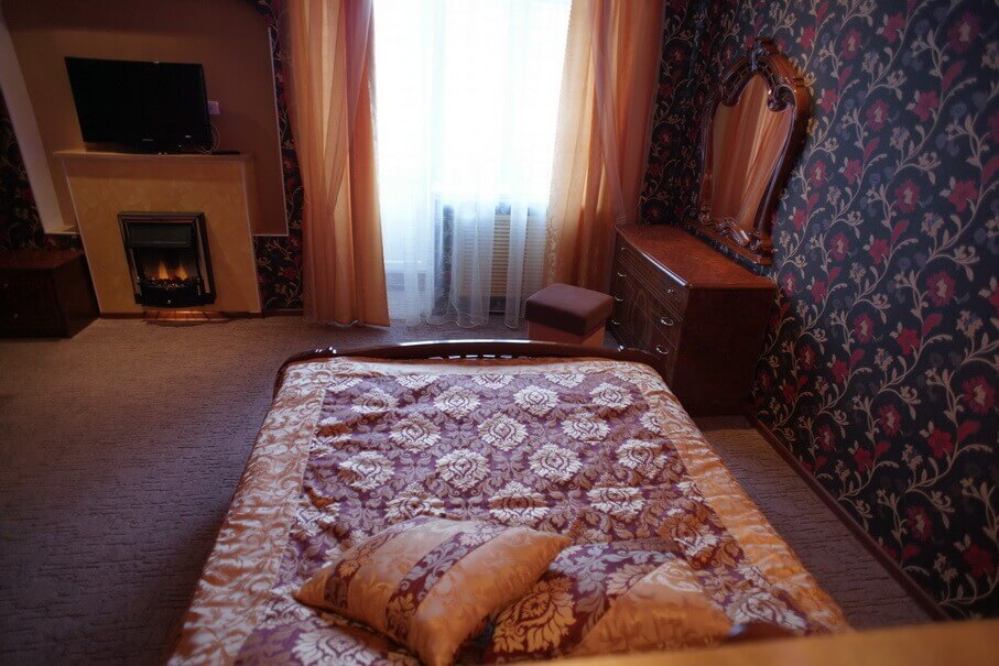 2 осн. места. 2 доп. места. Мебель: вешалка, диван, кровать двуспальная, прикроватные тумбочки, стол, стулья, шкаф. Оборудование: камин, телевизор. Санузел: с душем, туалетные принадлежности, фен. Сервис: Wi-Fi бесплатно, смена полотенец, смена постельного белья, уборка номера.