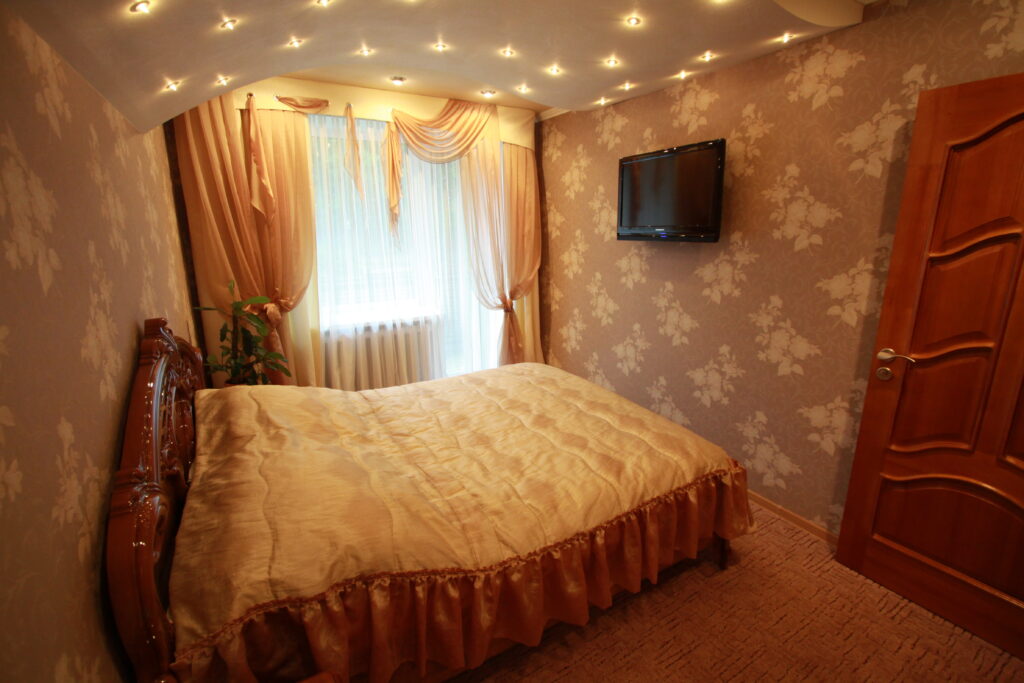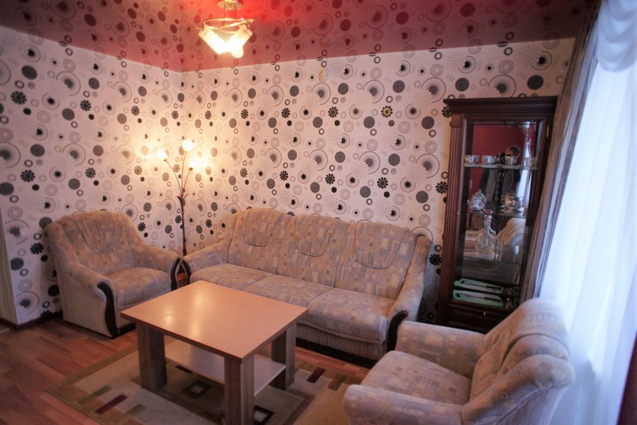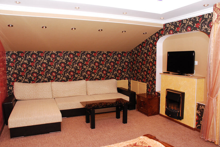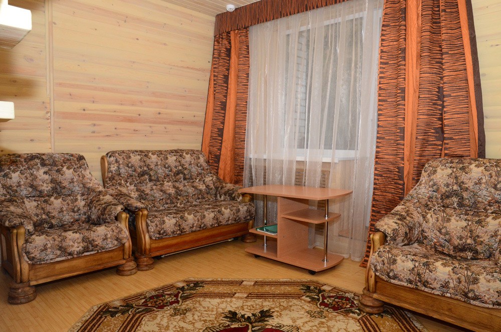 Площадь номера - 35 кв.м. 4 осн. места. 1 доп. место. Мебель: вешалка, диван раскладной, зеркало, кровать двуспальная, кровать раскладная, мягкий уголок, прикроватные тумбочки, столик журнальный, столик туалетный, стулья, тумба под телевизор, тумба под холодильник, шкаф-купе. Мини-кухня. Оборудование: микроволновая печь, набор посуды, телевизор ЖК, холодильник, электрочайник. Санузел: с душевой кабиной, туалетные принадлежности, фен. Сервис: Wi-Fi бесплатно, смена полотенец (1 раз в неделю), смена постельного белья (1 раз в неделю), уборка номера (ежедневно).