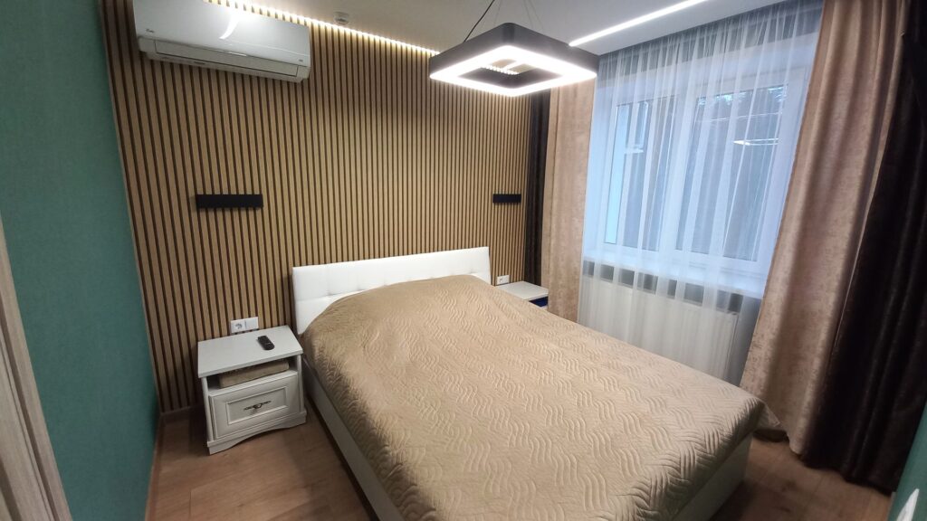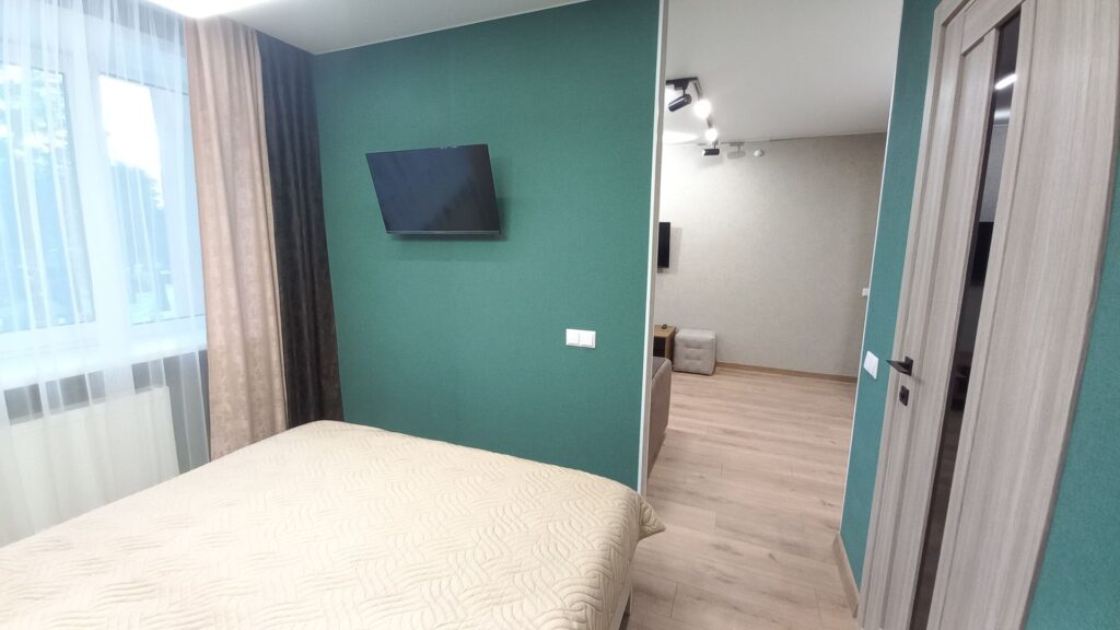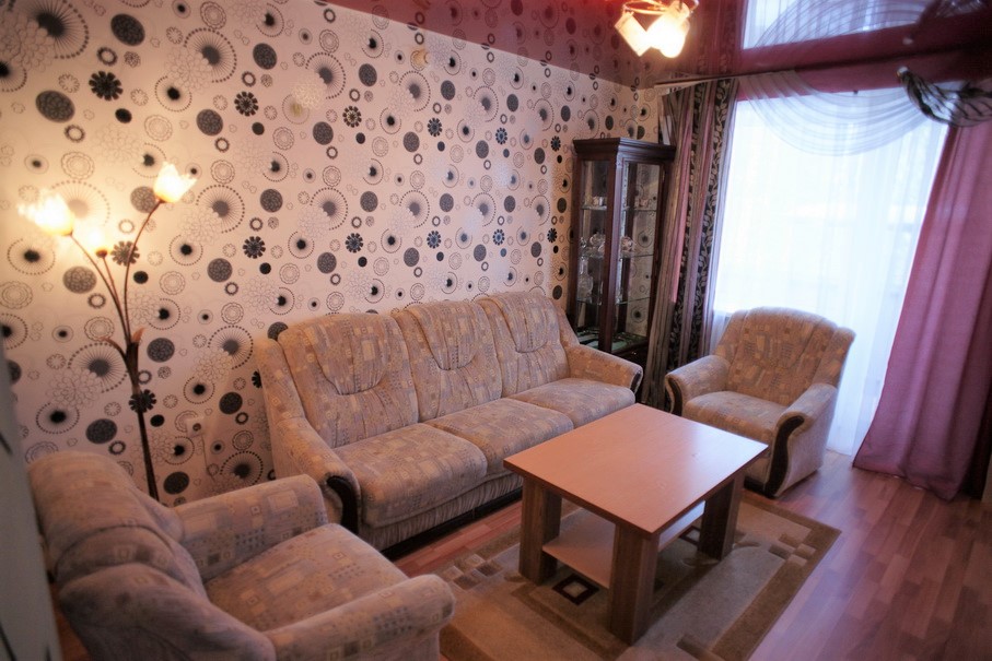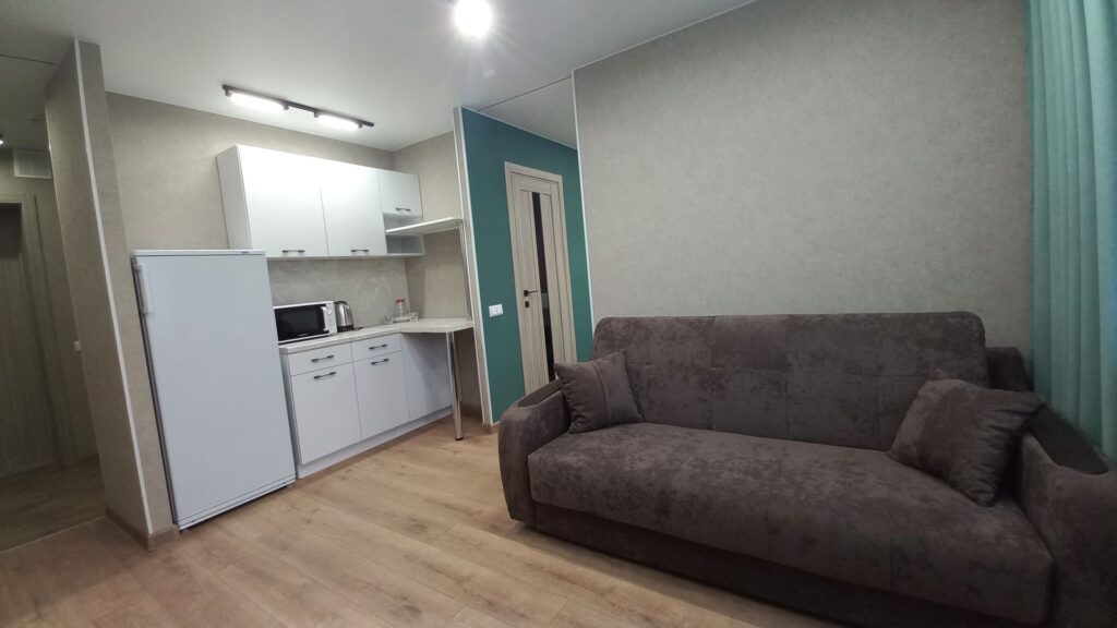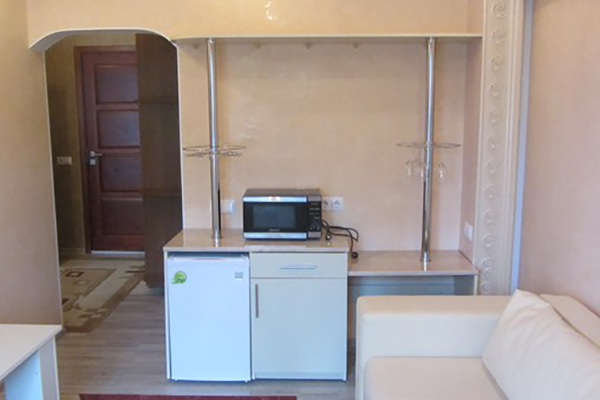 Площадь номера - 35 кв.м. 2 осн. места. 2 доп. места. Балкон. Мебель: вешалка, диван раскладной, зеркало, кровать двуспальная, кухонная мебель, прикроватные тумбочки, стол, стулья, шкаф. Мини-кухня. Оборудование: микроволновая печь, набор посуды, телевизор, холодильник, электрочайник. Санузел: с душевой кабиной, туалетные принадлежности, фен. Сервис: Wi-Fi бесплатно, смена полотенец (по требованию), смена постельного белья (1 раз в неделю), уборка номера (ежедневно).
