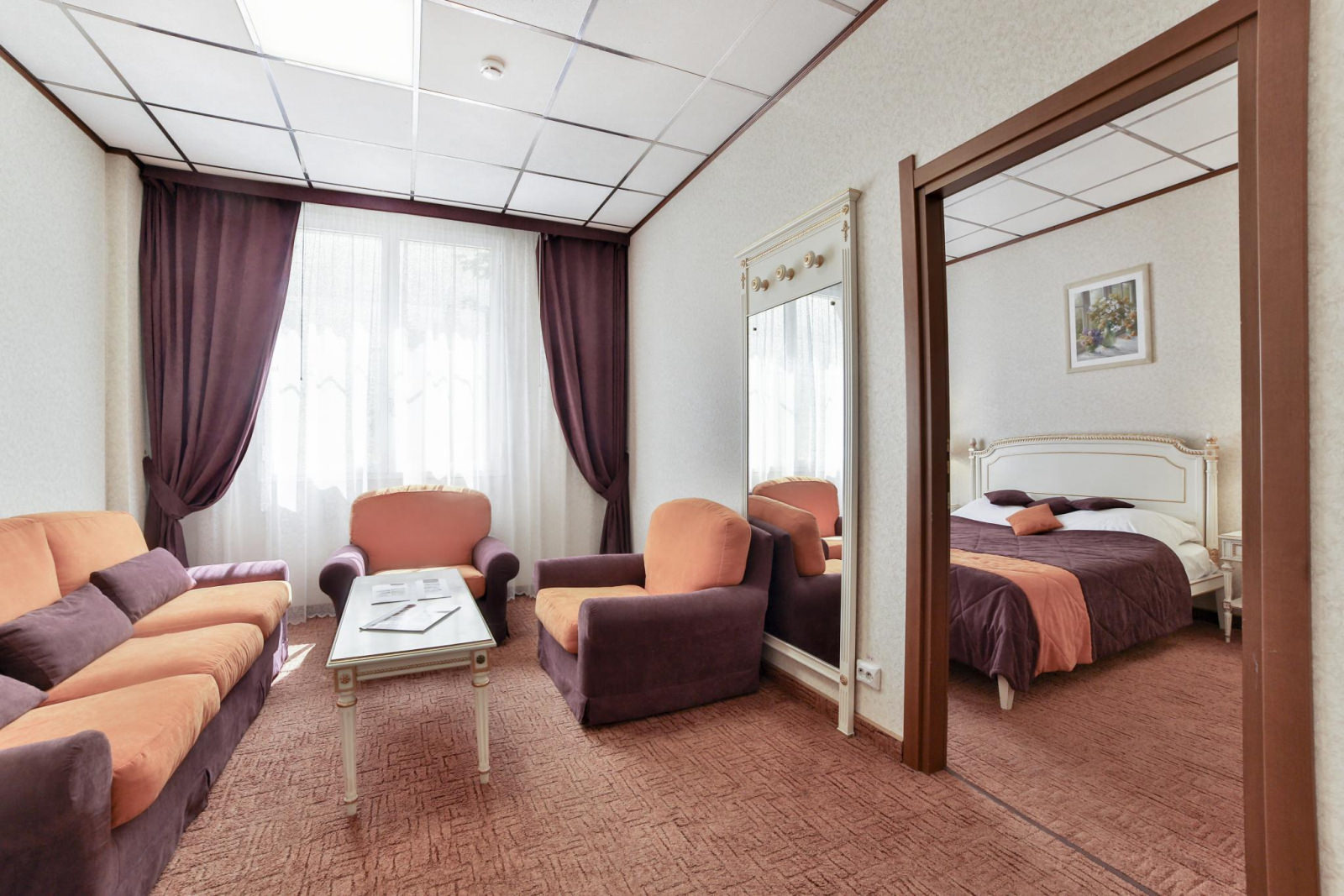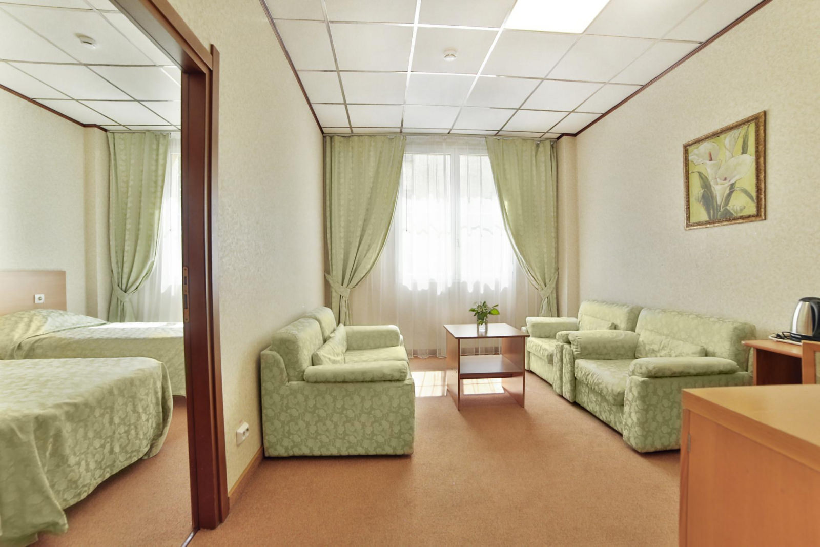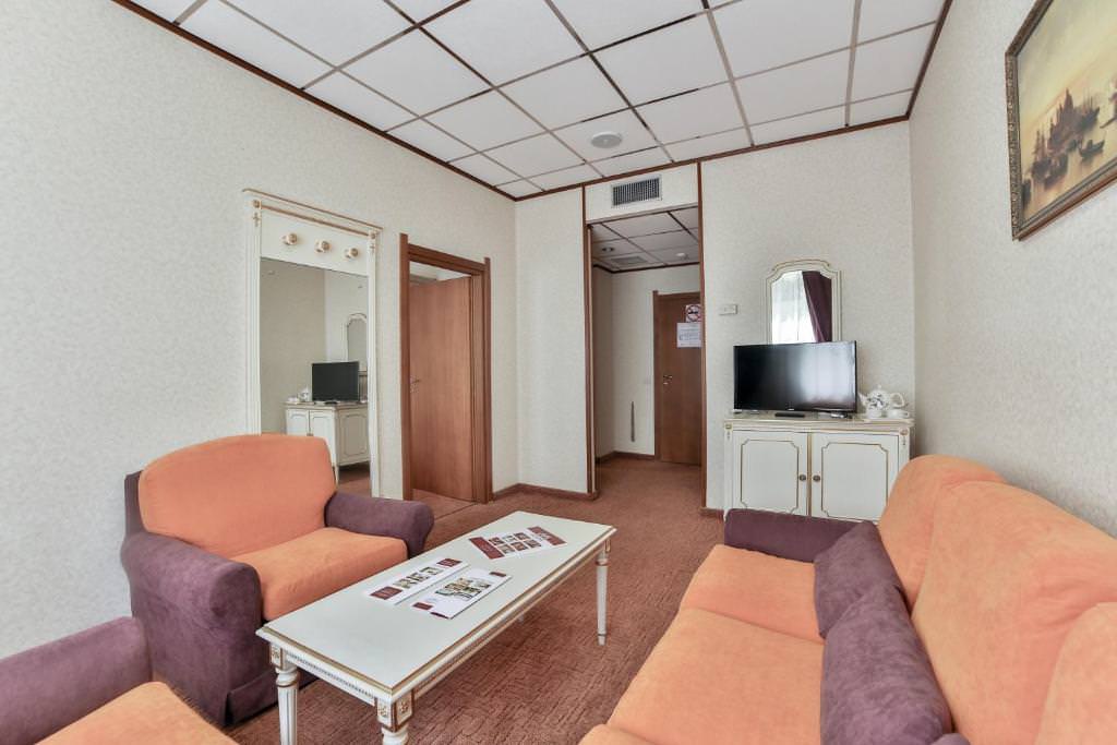 В номере две комнаты - гостиная с мягкой мебелью и спальня с двумя односпальными кроватями. Номер оснащен кабельным телевидением, мини-холодильником, электрочайником, системой кондиционирования, Wi-Fi доступом в Интернет, гардеробной комнатой. В ванной халаты, тапочки, фен, разовая косметическая продукция (мыло, шампунь, гель для душа, бритвенные и зубные наборы) в расчете на 2 персоны.