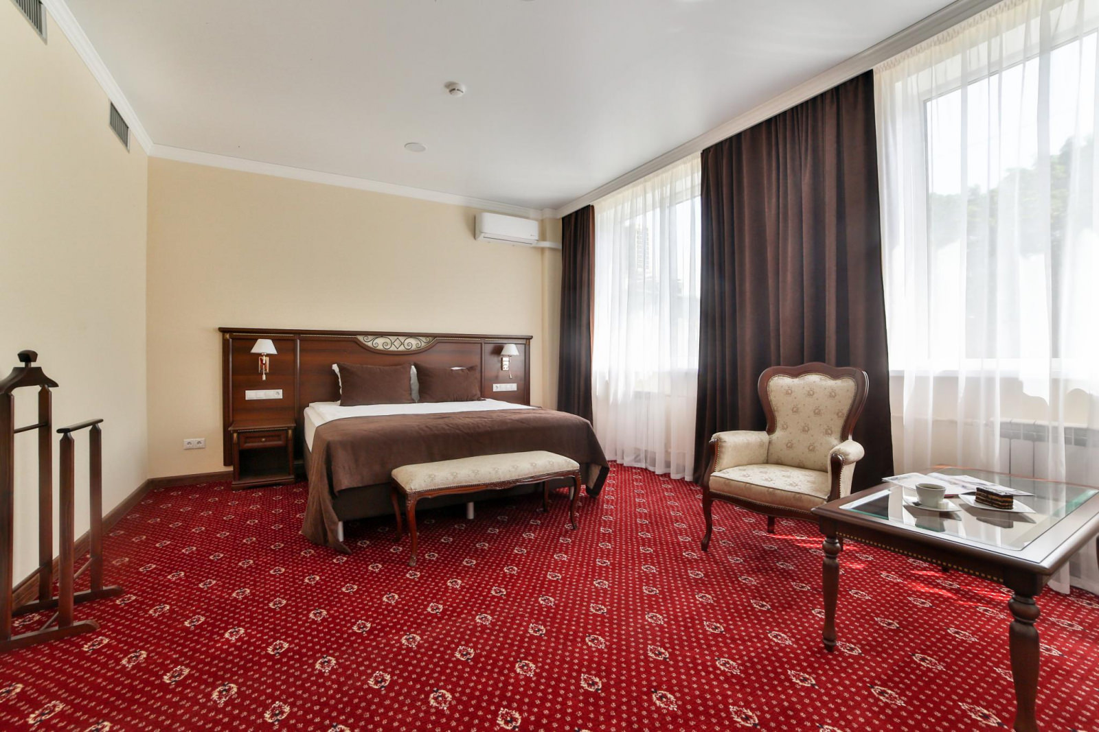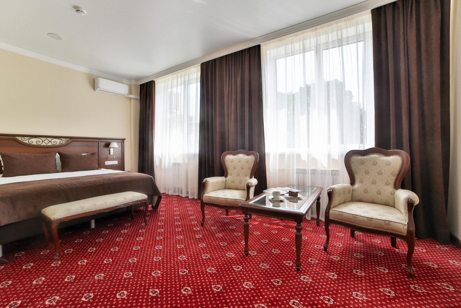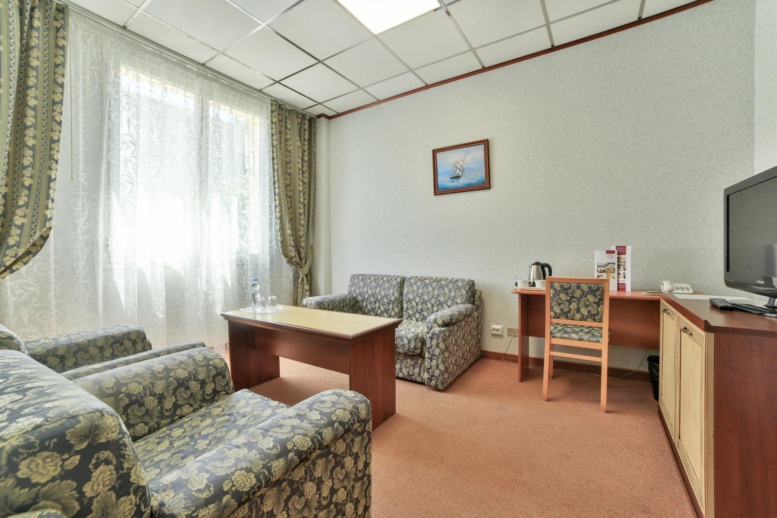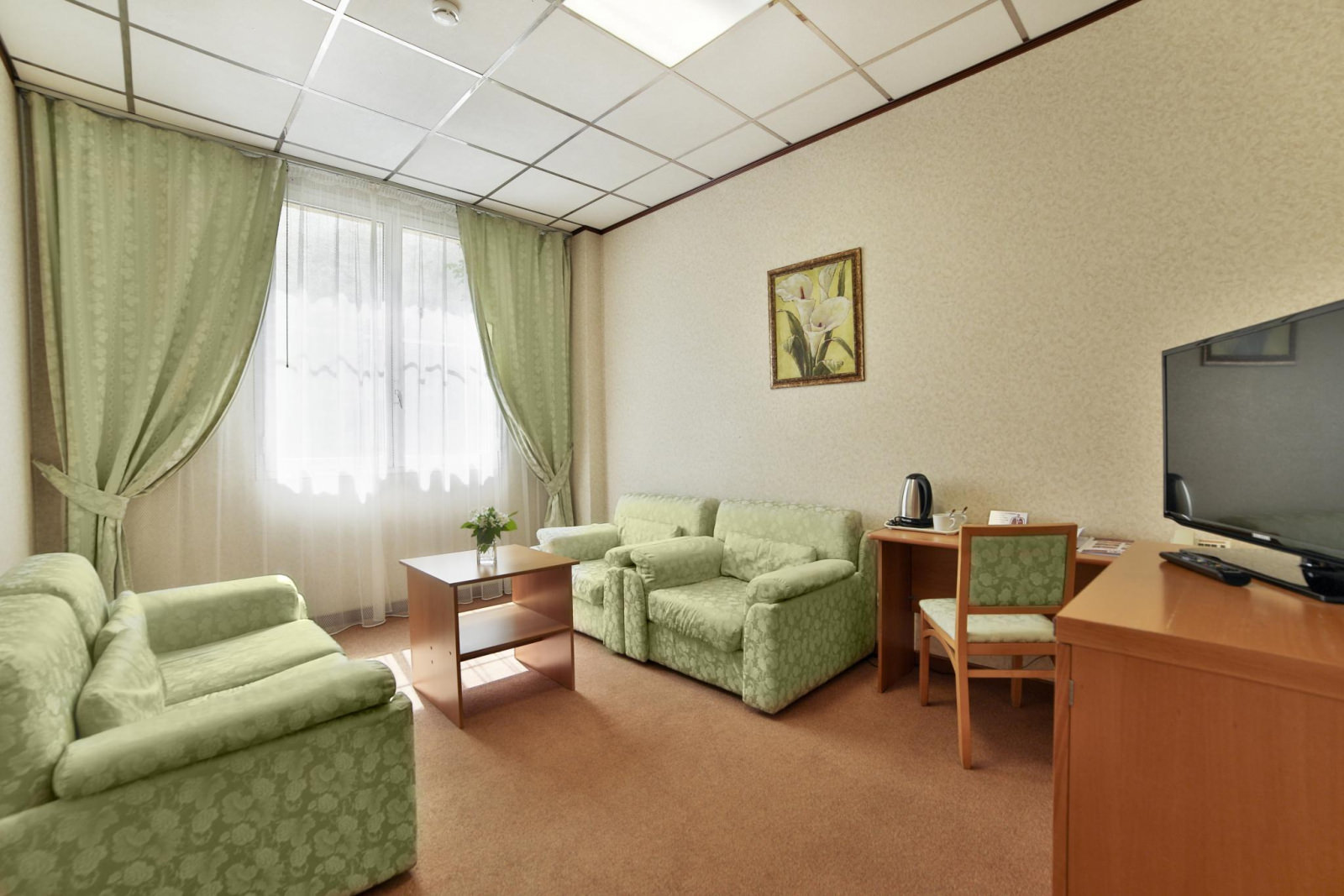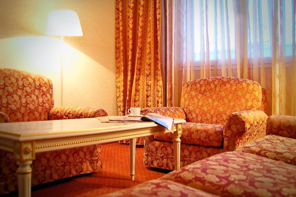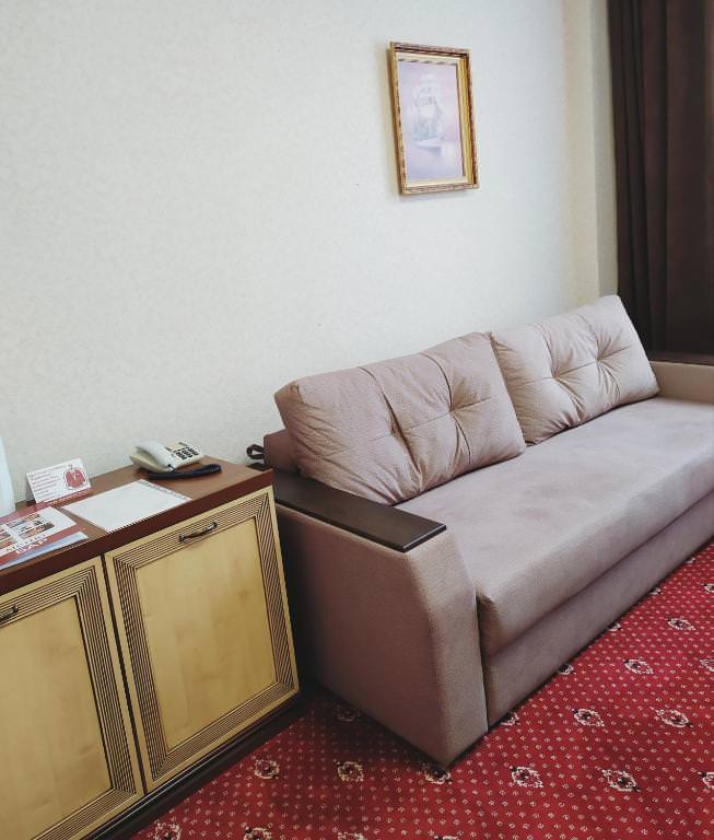 Просторный номер с мягкой мебелью и одной двуспальной кроватью. Номер оснащен кабельным телевидением, мини-холодильником, системой кондиционирования, Wi-Fi доступом в Интернет, набор посуды, чайник. В ванной халат, тапочки, фен, одноразовая косметическая продукция (мыло, шампунь, гель, бритвенный и зубной набор).