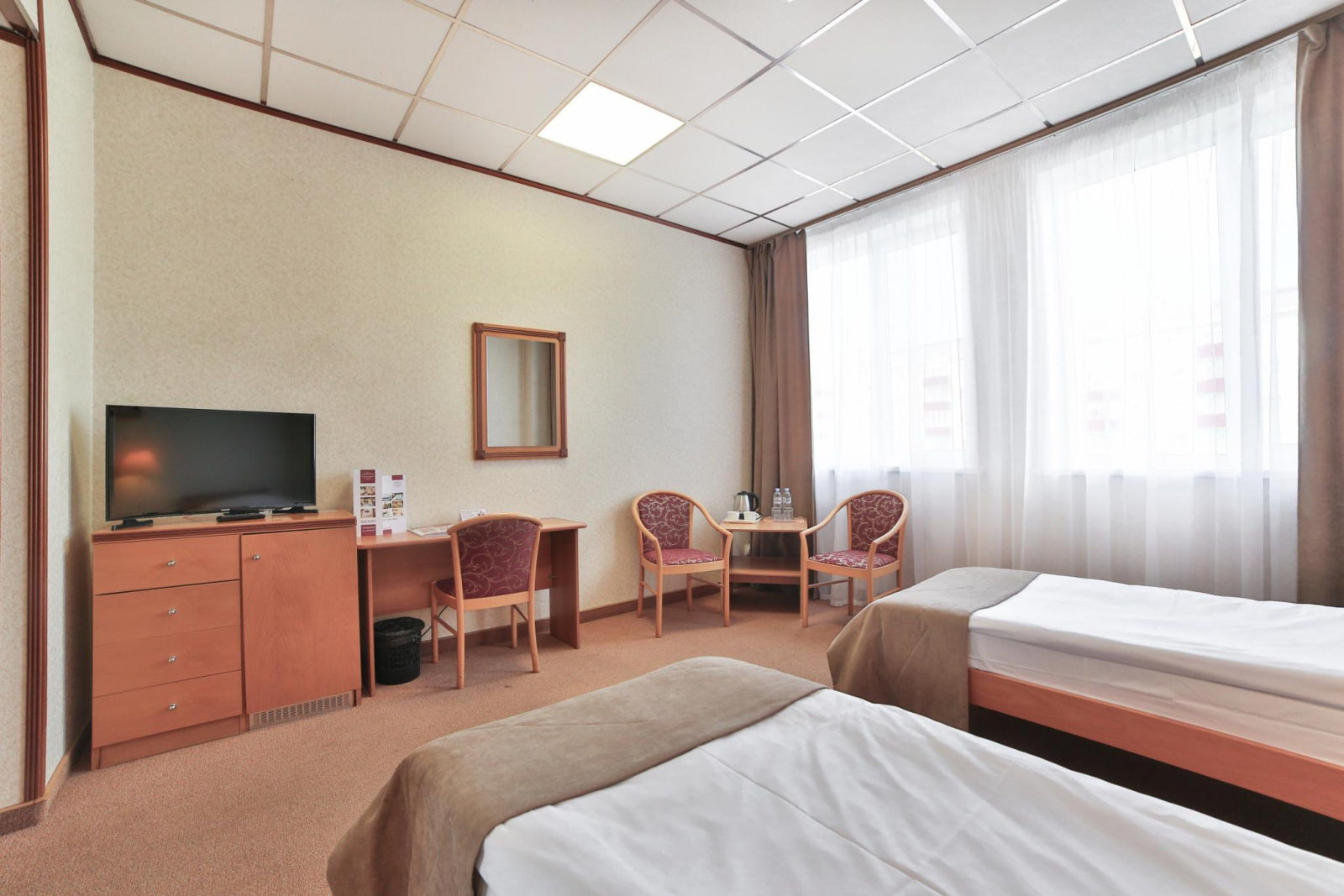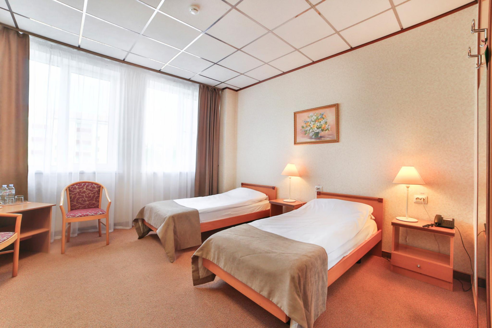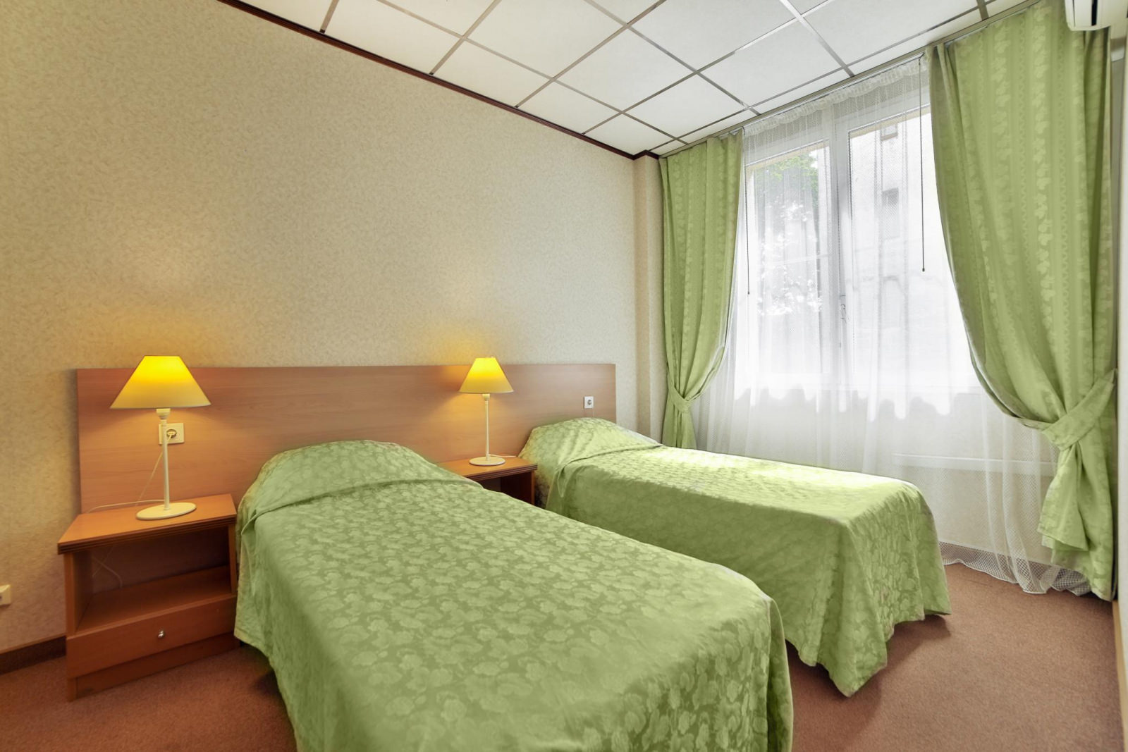 Номер однокомнатный с двумя односпальными кроватями. Оснащен кабельным ТВ, кондиционером, мини-холодильником, электрочайником. В ванной комнате халаты, тапочки, фен, разовая косметическая продукция (мыло, шампунь, гель для душа, бритвенные и зубные наборы) в расчете на 2 персоны.