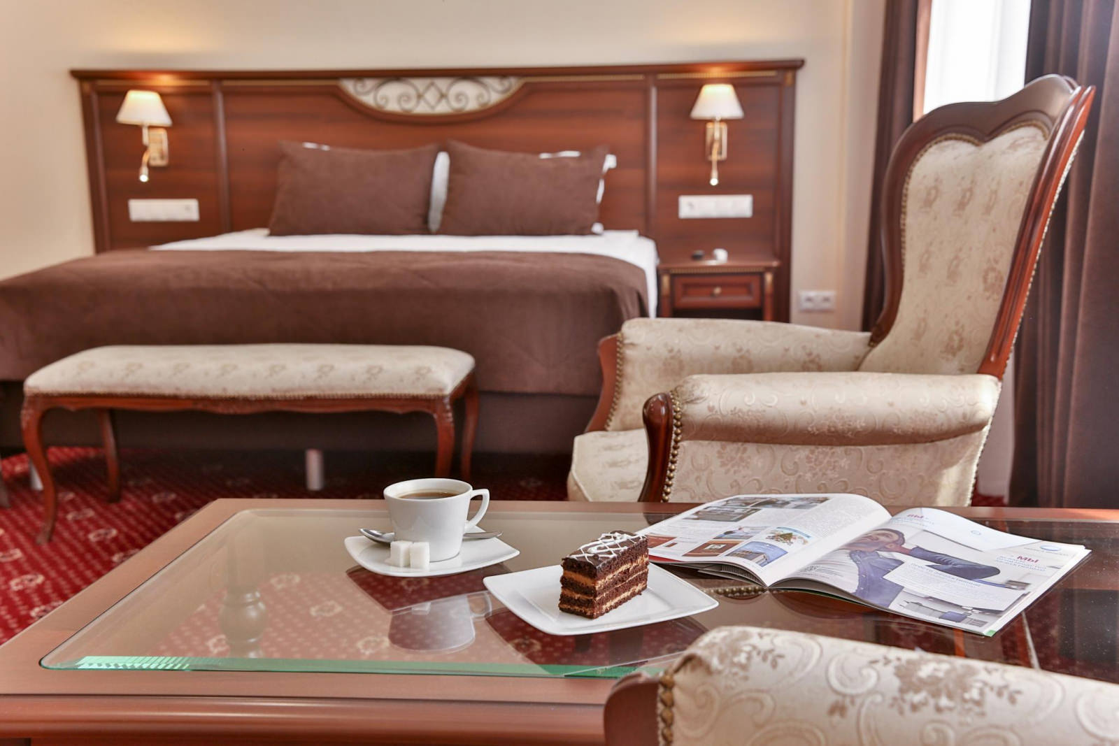 Номер состоит из гостиной и спальни с двуспальной кроватью. Номер оснащен кабельным телевидением, мини-холодильником, электрочайником, кондиционером, Wi-Fi доступом в Интернет, гардеробной комнаткой. В ванной халат, тапочки, фен,одноразовая косметическая продукция (мыло, гель, шампунь, зубной и бритвенный наборы).