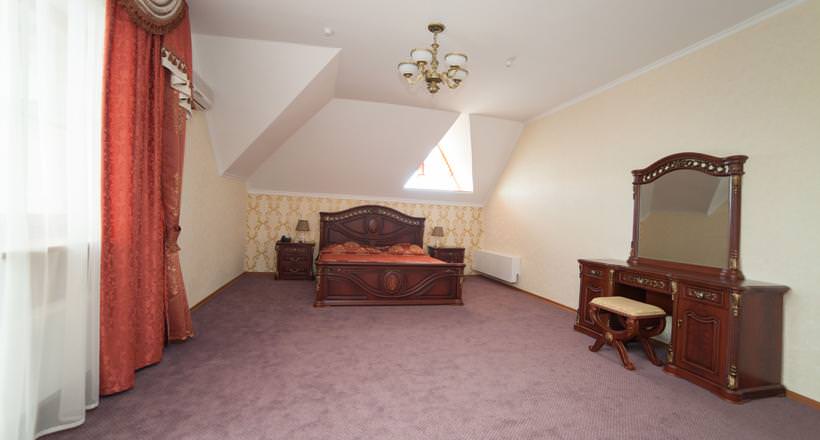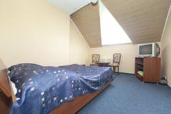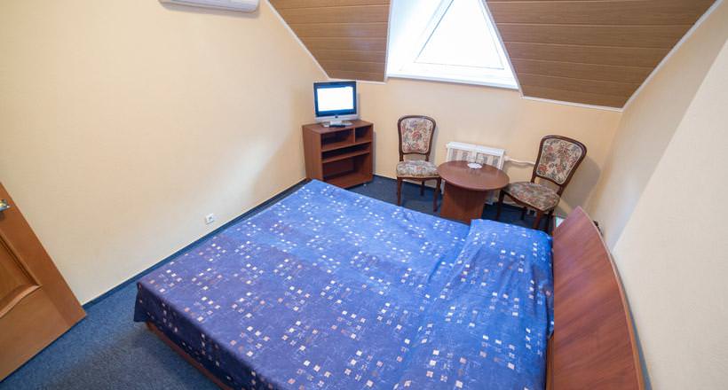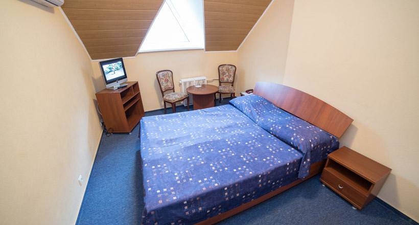 Однокомнатный номер расположен в мансардном этаже, располагает треугольным окном под потолком. В номерах установлена большая двуспальная кровать (160х200), журнальный столик, шкаф для одежды, телевизор, телефон, кондиционер. В ванной комнате имеется душевая кабина.