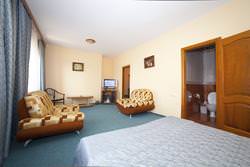 В номерах категории Люкс имеется две комнаты. В гостиной установлен угловой диван, журнальный столик, мини-холодильник, шкаф для одежды. В спальне имеется двуспальная кровать (160х200), телевизор, телефон, кондиционер, чайник, 2 чайные пары. Для гостей предусмотрен отдельный выход из номера на террасу. В ванной комнате имеется ванная-джакузи.