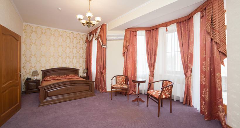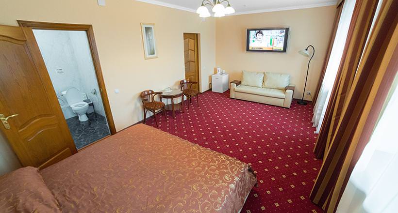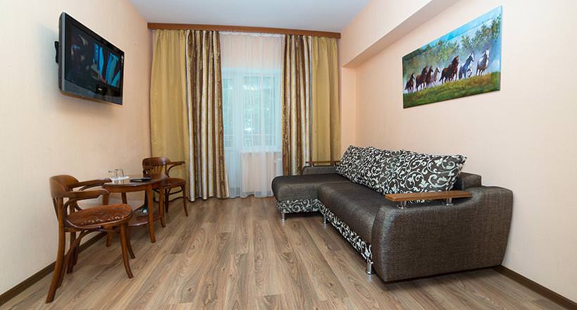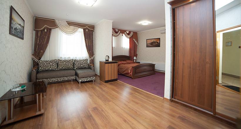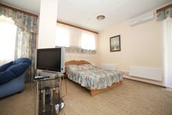 Эти номера специально оформлены нами для тех, кто ценит свободу и желает творческого простора. Королевский простор и роскошный дизайн интерьера помогут Вам испытать неповторимое наслаждение от каждого дня проведенного у нас. В стоимость проживания входит, парковка, отдых на открытом бассейне в летнее время и Wi-Fi. номер студия, разделенный на две зоны: спальня и гостиная В номере: Балкон, Телефон с прямым выходом на междугороднюю связь, Кондиционер, Телевизор, Мини-холодильник, 2-х спальная кровать, Мягкая мебель, Шкаф-купе, Сейф, Ванная комната с ванной или ванной джакузи и туалетными принадлежностями
