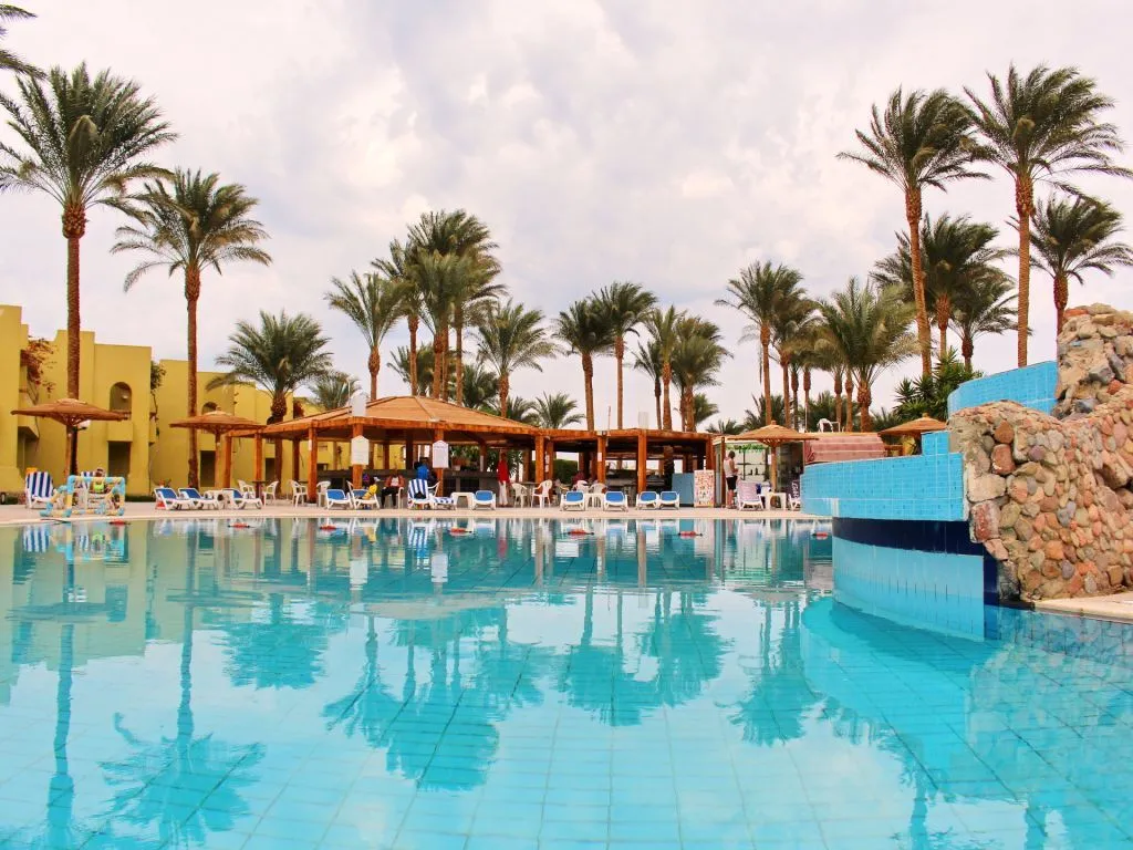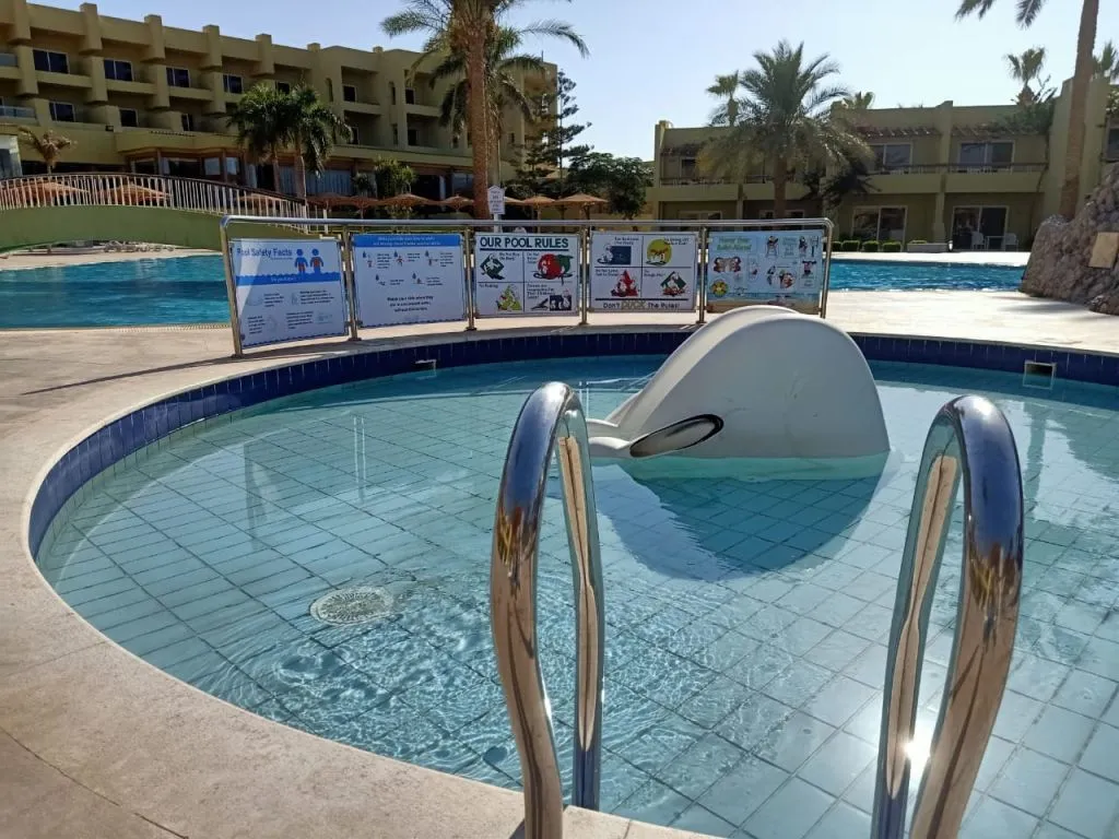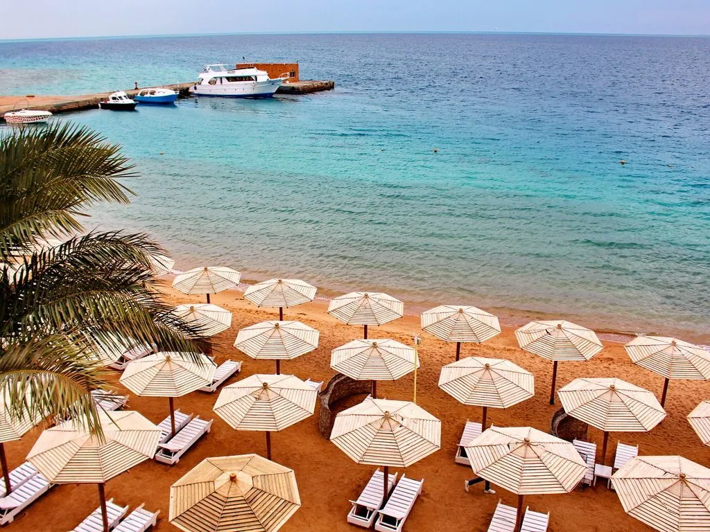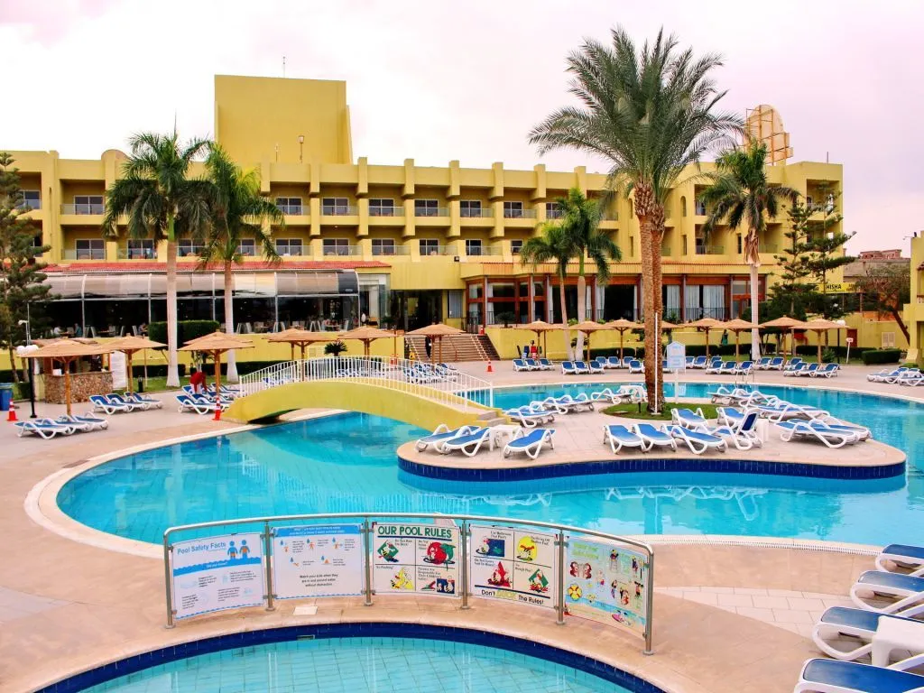 Palm Beach Resort 4* расположен в пригороде Хургады, в 20 км от аэропорта и в 5 км от Старого города. Отель существует уже давно и считается у туристов не очень дорогим, но при этом достаточно качественным вариантом для семейного отдыха. Главное здание и пять корпусов Annex стоят на компактной, ухоженной, зелёной территории. Персонал отеля очень дружелюбный, приветливый и заботится о комфорте гостей и чистоте вокруг. В жилом фонде представлены небольшие стандартные, просторные семейные и двухместные номера эконом-класса. Есть варианты с балконами и без. Отделка в комнатах сделана давно, мебель уже не новая, но всё выглядит аккуратно и работает, как правило, без перебоев. Персонал старается поддерживать чистоту и хорошее состояние номеров. Собственный песчаный пляж отеля протяжённостью 180 м находится в 3 минутах ходьбы от главного здания. Берег здесь чистый, ухоженный, а вход в воду пологий, комфортный. Есть бетонный пирс длиной 90 м, с которого можно спуститься прямо к рифу и поплавать с маской. Свободные шезлонги всегда есть в наличии, места заранее почти никто не занимает. На территории комплекса работают два ресторана и четыре бара. Питание в отеле большинству туристов нравится — в своих отзывах они говорят, что меню вкусное и разнообразное. Правда, в зале часто бывают очереди, но свободные столики есть всегда. К услугам гостей три бассейна: большой, поменьше с 2-мя водными горками и джакузи, а также неглубокая детская чаша. В главном здании работают СПА-центр, несколько магазинов и аптека. Аниматоры предлагают отдыхающим утреннюю зарядку, аэробику в бассейне, тренировки по йоге, дартс и уроки танца живота. В Palm Beach Resort есть два теннисных корта, бильярд, тренажерный зал, а также детский клуб, расположенный рядом с пляжем и игровой площадкой для маленьких туристов, Вечером гостей ждёт шоу-программа и дискотека. В отеле работает школа виндсерфинга, есть курсы подводного плавания и верховой езды, прокат спортивного инвентаря и сервис аренды автомобилей.