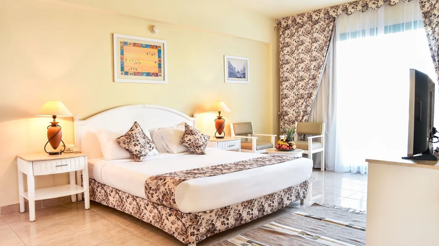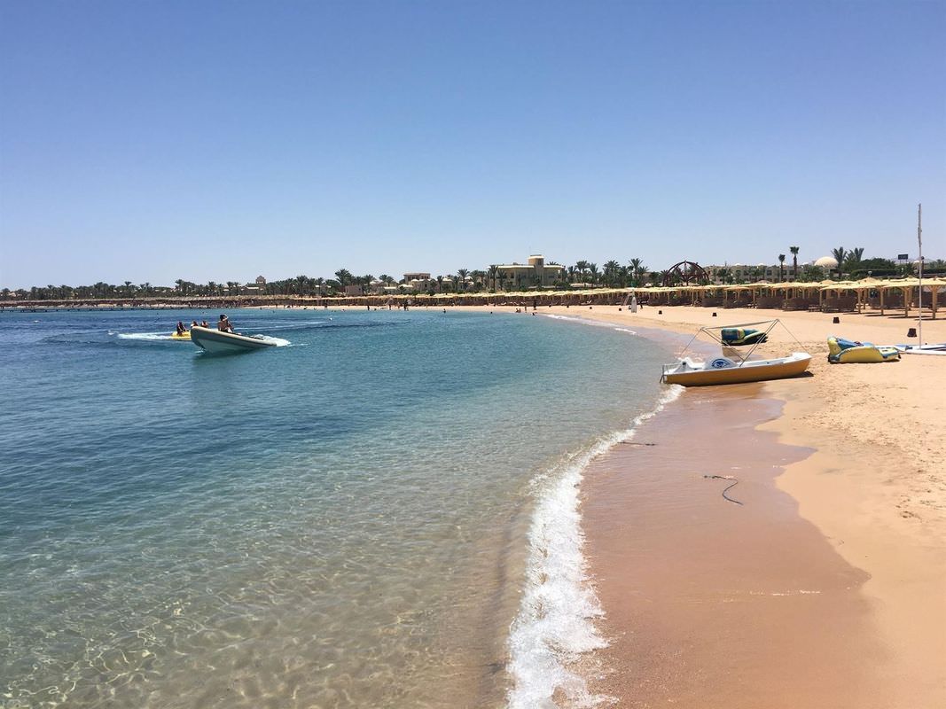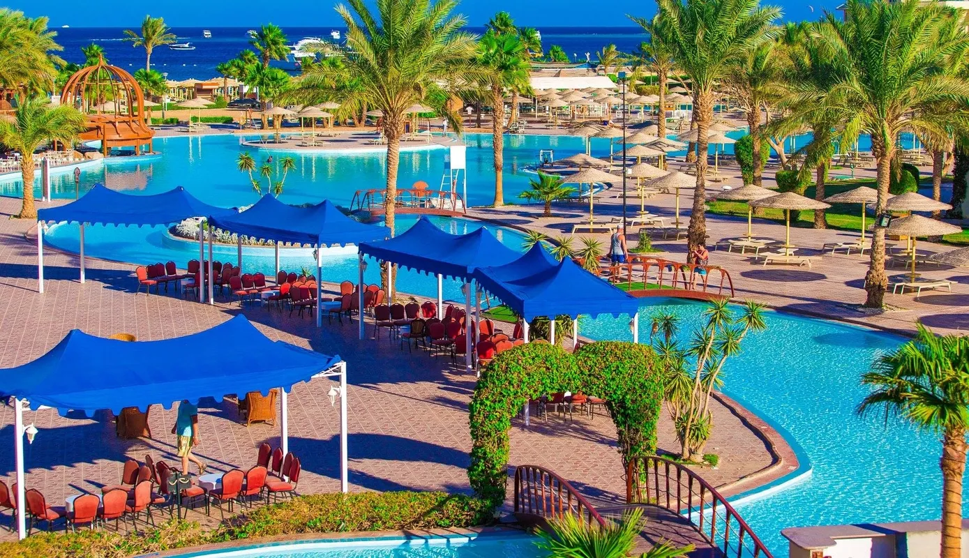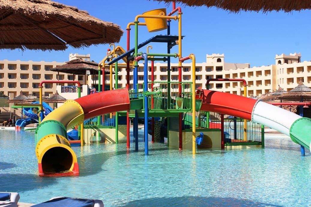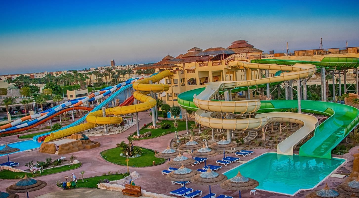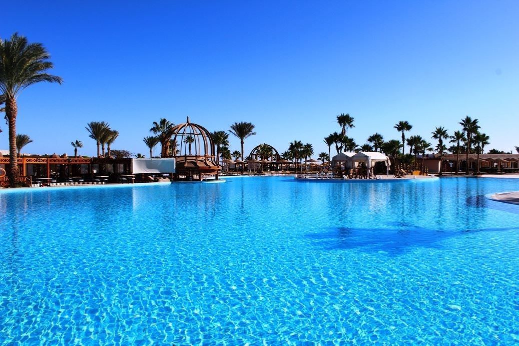 Этот отель — один из самых бюджетных 5-ти звёздочных отелей в курортном городе Макади-Бэй. Он стоит в 30 км от Хургады. Дорога из аэропорта занимает не более 40 минут, поэтому автобус, как правило, привозит сюда туристов в первую очередь. Огромной территории отеля в 250 тыс. м². вполне достаточно для прогулок. Номера расположены в главном корпусе и в 11-ти малоэтажных коттеджах. В главном корпусе отеля жить комфортнее. Если окна смотрят на бассейн, то в номере всегда тихо, а если в другую сторону, то шум от технических зданий отеля и призывы на молитву могут помешать спокойному сну. Но, независимо от того, где расположен номер, в нём обязательно есть качественное постельное бельё, проводиться ежедневная уборка и периодически пополняется запас питьевой воды в бутылках. Простенькая обстановка помещений отеля компенсируется хорошим пляжем с удобным пологим заходом в море и красивым коралловым рифом с диковинными рыбками, осьминогами, скатами и черепахами. Пляж находится в бухте, и сильные волны здесь бывают редко. Кругом мелкий песок, поэтому обувь для купания гостям отеля не нужна. Для любителей нырять имеется пирс длинной 150 метров, а для детей прямо перед пляжем есть крытая детская площадка, на которой малыши могут играть в тени. На территории отеля есть полноценный аквапарк: 17 горок, бассейн с искусственной волной и детская аква зона с развлечениями. Поскольку это большой семейный отель и отдыхающих здесь много, днём на территории шумно, в ресторанах часто бывают очереди за вкусненьким, и сложно найти вакантное место на пляже после 9 утра, зато у бассейна всегда много свободных шезлонгов, поскольку вода в нём довольно холодная. На территории отеля расположены 4 ресторана и 3 бара. Самый лучший выбор блюд — в большом ресторане, находящемся в центральном здании рядом с лобби. Поужинать по записи и совершенно бесплатно с периодичностью один раз в три дня, можно также в 4 ресторанах а-ля карт, предлагающих меню разных стран. Wi-Fi в отеле работает медленно, поэтому загрузить большие файлы или посмотреть видео не всегда получается. Зато развлечься помогает прекрасная анимация: днём на пляже предлагают йогу, дартс, волейбол и другие активности, а вечером, рядом с лобби, под открытым небом, — танцы, песни и живой звук. Можно также пройтись по расположенным на территории магазинчикам и купить масла, одежду, сувениры, сладости и фрукты. А если вдруг забыли дома таблетки от головы, то на улице напротив входа в отель есть аптека.