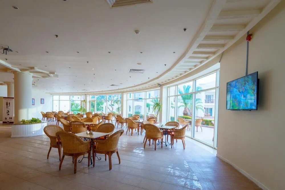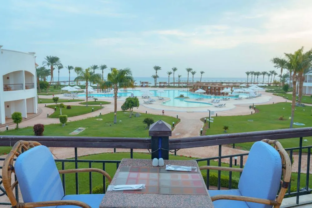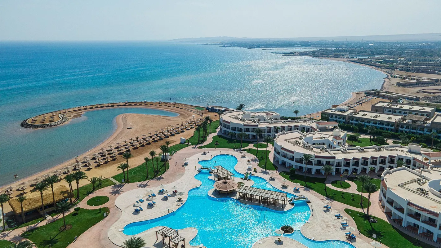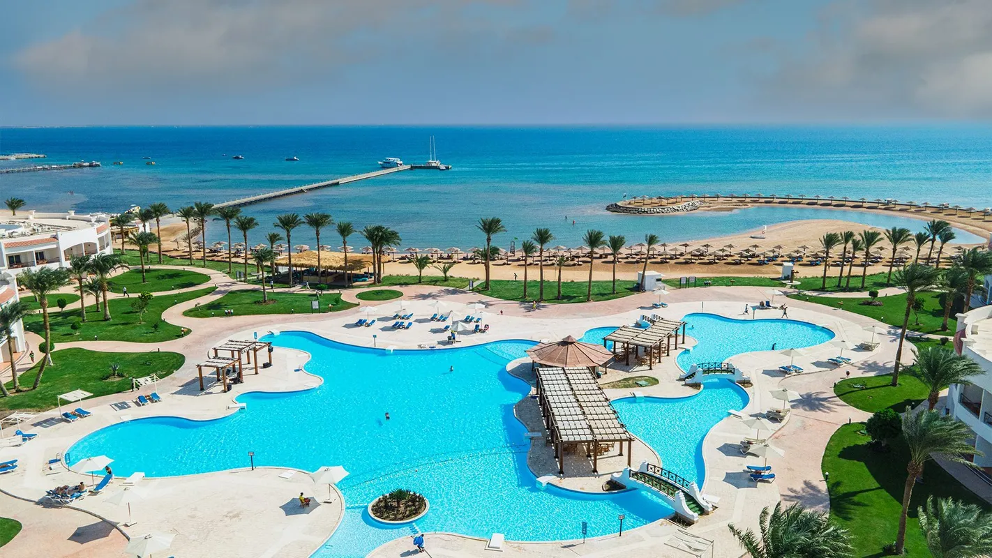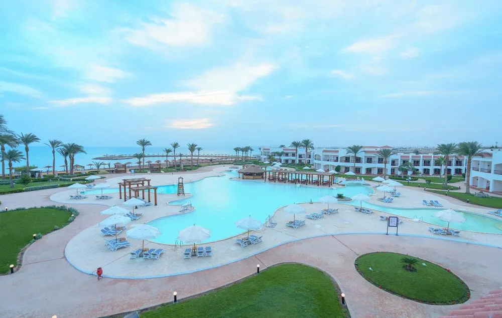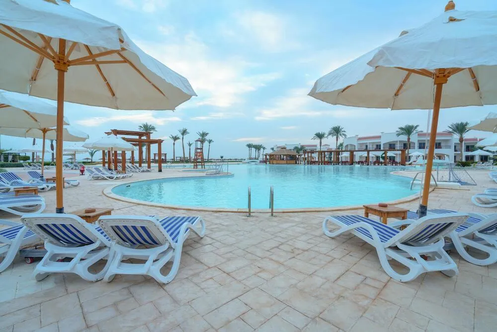 Отель стоит на первой линии, в районе Вилладж-Роад, в 13 км от аэропорта Хургады. Он подходит для спокойного отдыха у моря. К услугам гостей: ухоженная зеленая территория площадью 60 000 м² с бассейном в форме лагуны и двухэтажные корпуса с довольно просторными номерами: стандартными, семейными и полулюксами. Комнаты светлые, с балконами, видом на море или территорию отеля, с достаточно хорошим ремонтом и простой добротной мебелью. Почти все отдыхающие довольны работой кондиционеров в номерах и качеством ежедневной уборки. Отель имеет собственный песчаный пляж с причалом для катеров. Расположен он совсем рядом — всего в 200 метрах от здания с лобби, в уютной, защищённой от сильных ветров лагуне. Вход в море здесь комфортный, пологий, но у берега довольно мелко. Море в этом месте чистое, прозрачное, а вода в нём быстро прогревается. На берегу есть отдельные зоны для семей с детьми и взрослых туристов 16+, желающих отдохнуть в тихой спокойной атмосфере. В главном ресторане отеля гостей ждёт привычный шведский стол с блюдами интернациональной кухни. Питание разнообразное, вкусное. Весь день в лобби работает бар, есть кафе-бар у бассейна, спорт и джаз-бар. С 10:30 до 12:00 гостям предлагают перекусить лёгкими закусками, а с 15 до 18 часов устраивают кофе-брейк и подают свежую выпечку. Отдыхающие могут также посещать 2 ресторана, работающих по системе а ля карт, достаточно только предварительно забронировать столик. На территории отеля есть бассейн для взрослых с детской зоной, бассейн с аквапарком из 6 горок и подогревом в зимний период, СПА-комплекс с cауной, джакузи, паровой и турецкой баней, фитнес-центр, салон красоты, теннисные корты, бильярд, центр водных видов спорта, магазины с сувенирами и ювелирными изделиями. Днём гостей ждёт ненавязчивая анимация: аэробика, дартс, пляжный волейбол, водное поло. А вечером — мини-диско для малышей, шоу в амфитеатре и живая музыка на крыльце в лобби. Для юных гостей открыт детский клуб, есть неглубокий бассейн, игровая комната и уголок со специальным меню в главном ресторане. Через дорогу от отеля находится базар, есть аптека. В 10 минутах ходьбы находится торговый центр. Недалеко располагается и аквапарк "Титаник".