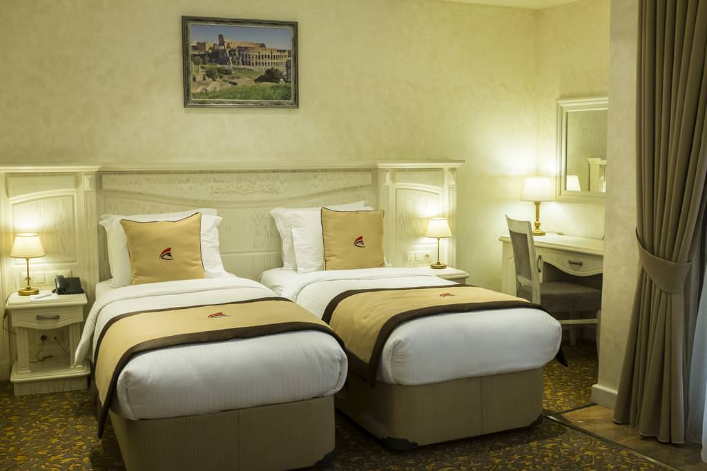 Площадь номера - 29 кв.м. 2 осн. места. 1 доп. место. Балкон. Мебель: диван, кровати односпальные /одна двуспальная кровать, прикроватные тумбочки, стол, стул, шкаф. Оборудование: кондиционер, телевизор, телефон. Санузел: с душем, туалетные принадлежности. Сервис: Wi-Fi бесплатно, мини-бар.